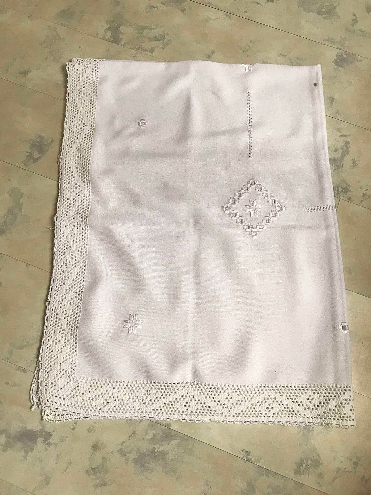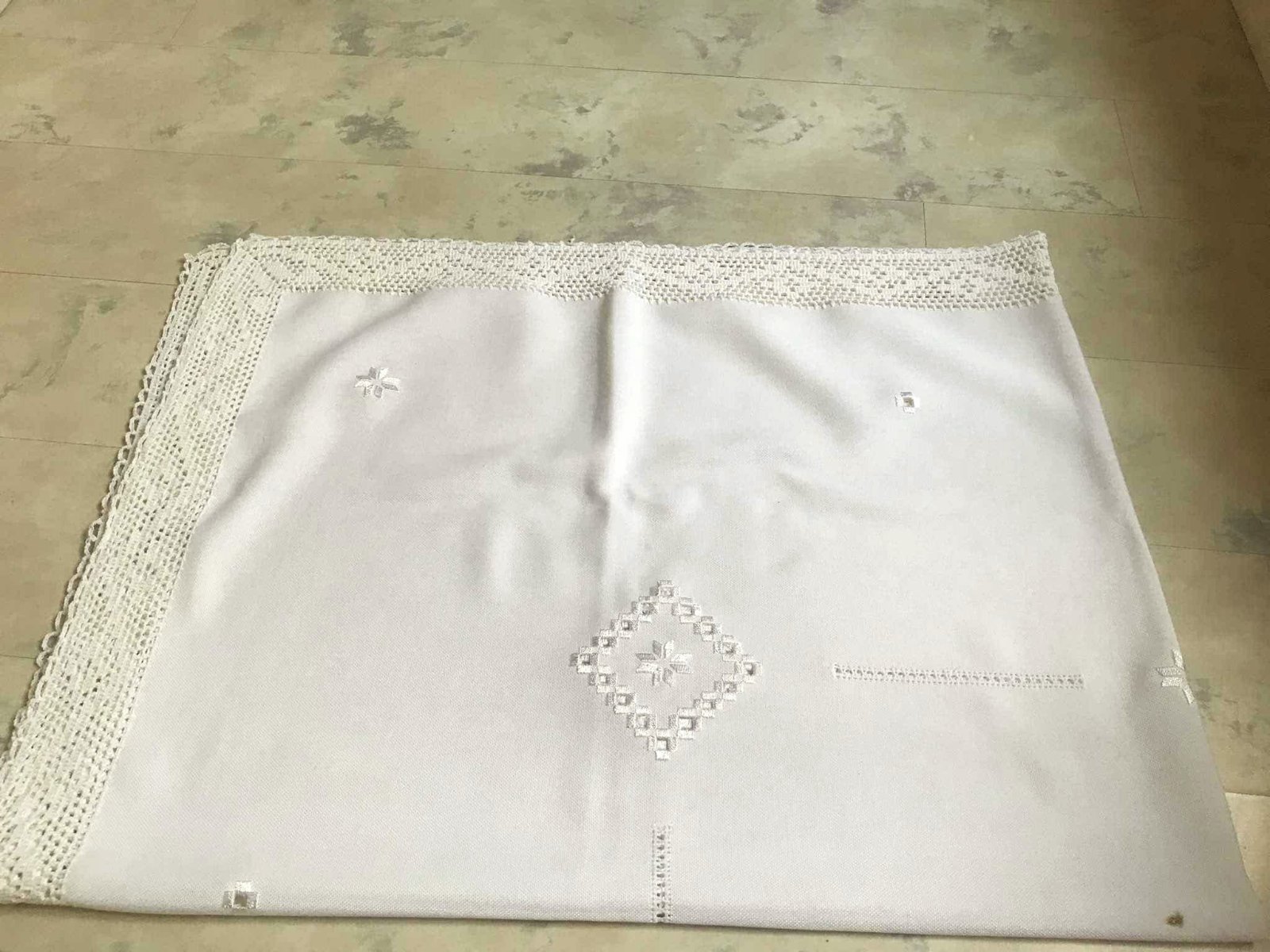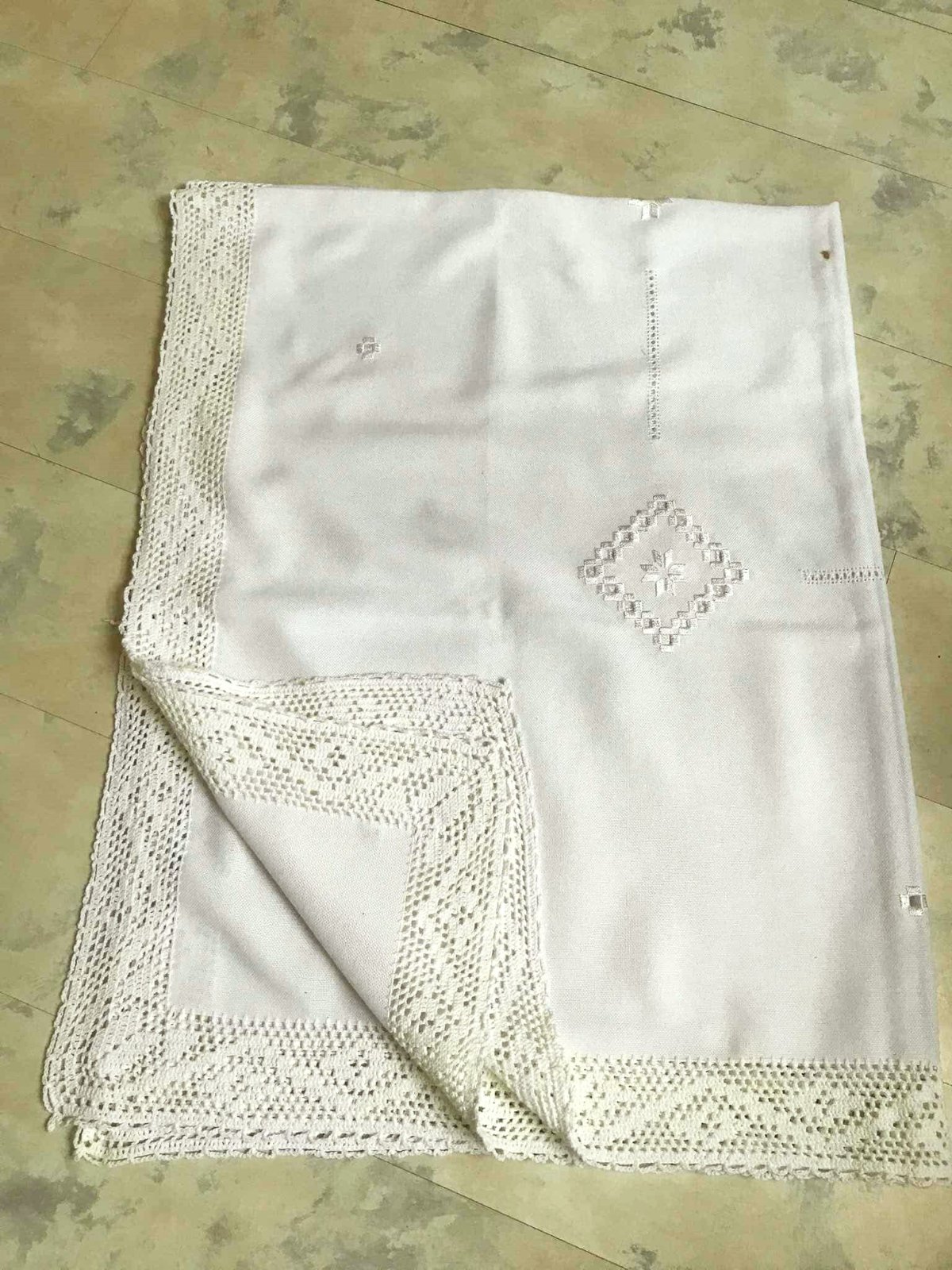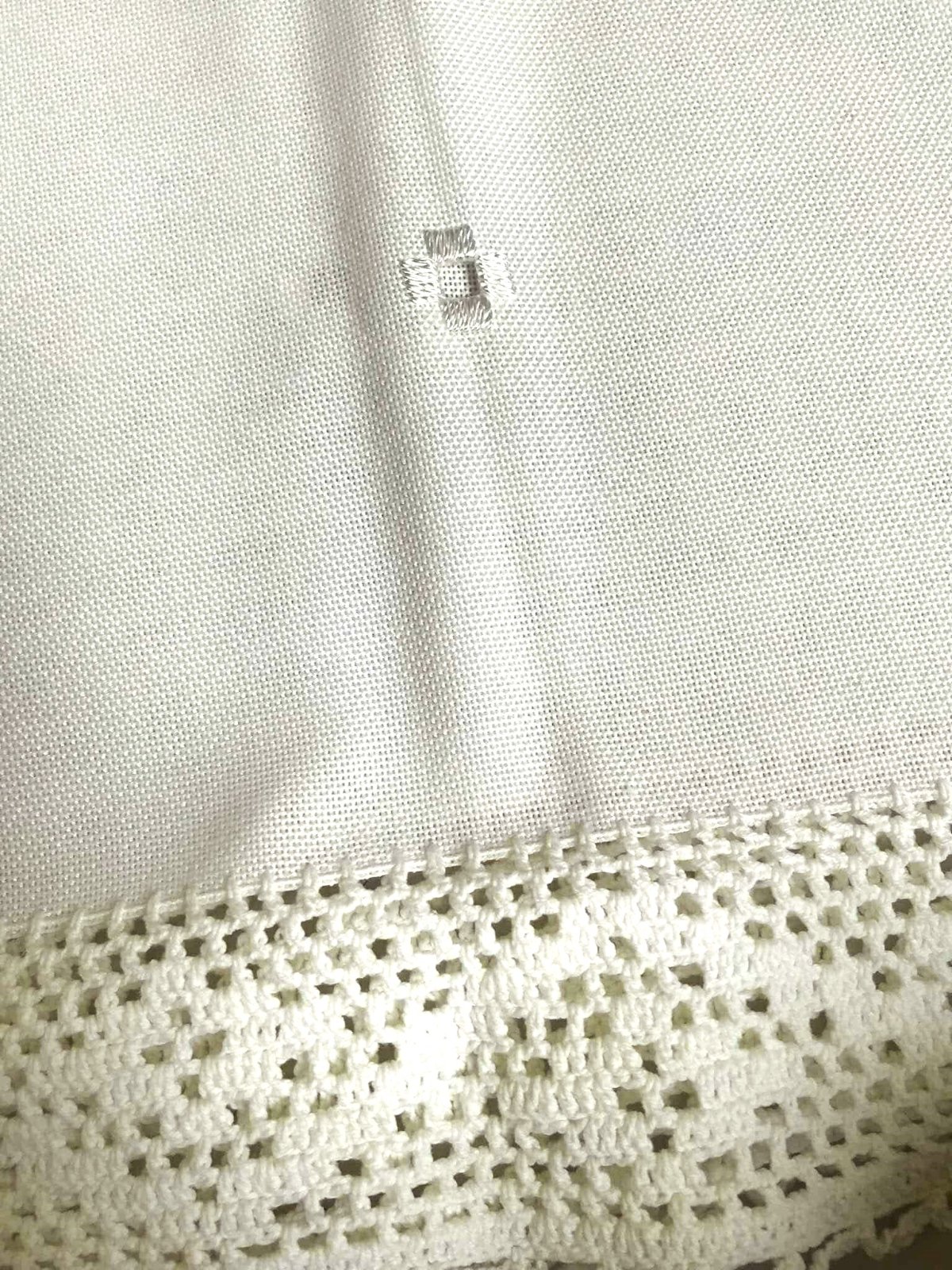 krásny veľký sviatočný vyšívaný kvalitný obrus, materiál je vyfotený, výborne sa udržiava,nekrčí sa, má 1 chybu - je na jednom mieste prepálený - čo je vyfotené, šikovná žienka si to vie opraviť tým, že tam vyšije podobný vzor ako je na obruse a tým to zamaskuje, je to približne v strede - viď foto, ja som to maskovala vianočným vencom /ikebanou v strede,obrus má rozmer = 165 x 126 cm - z toho háčkovaná bordúra 7 cm, pôvodná cena bola 65 eur