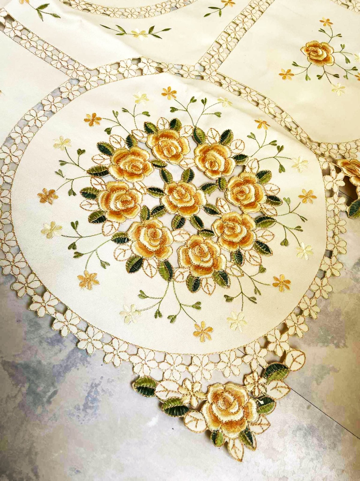 vysokokvalitný luxusný obrus,rozmer : 85 cm x 85 cm,raz prestretý,top stav - ako nový,krásne vykrajované a strojovo vyšívané moderné vzory - technikou richelieu,krásne vypracovaný,perfektný materiál - 100 % polyester,farba je béžovo - žltá s jemným saténovým odleskom