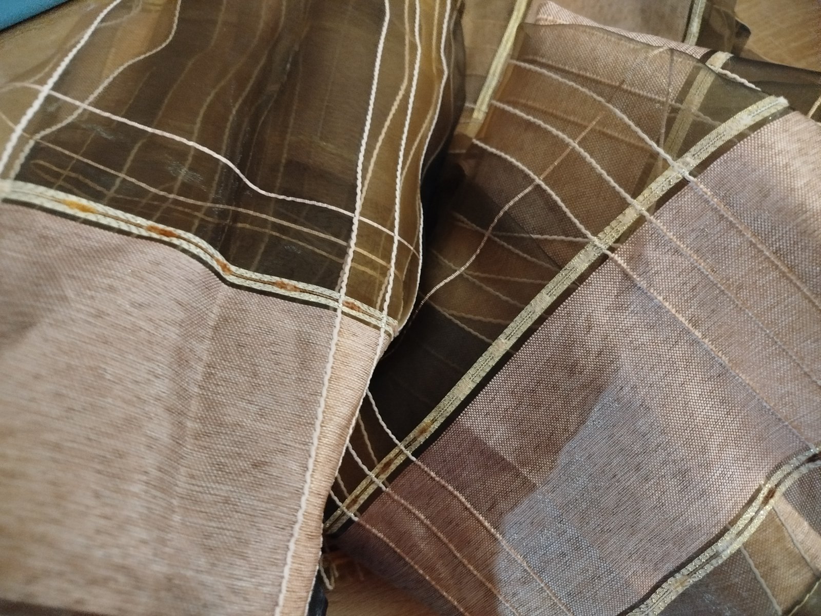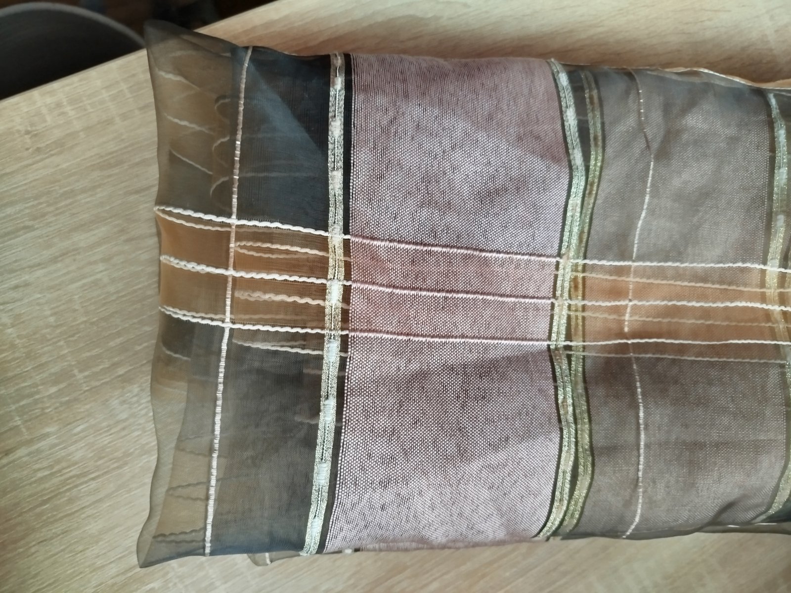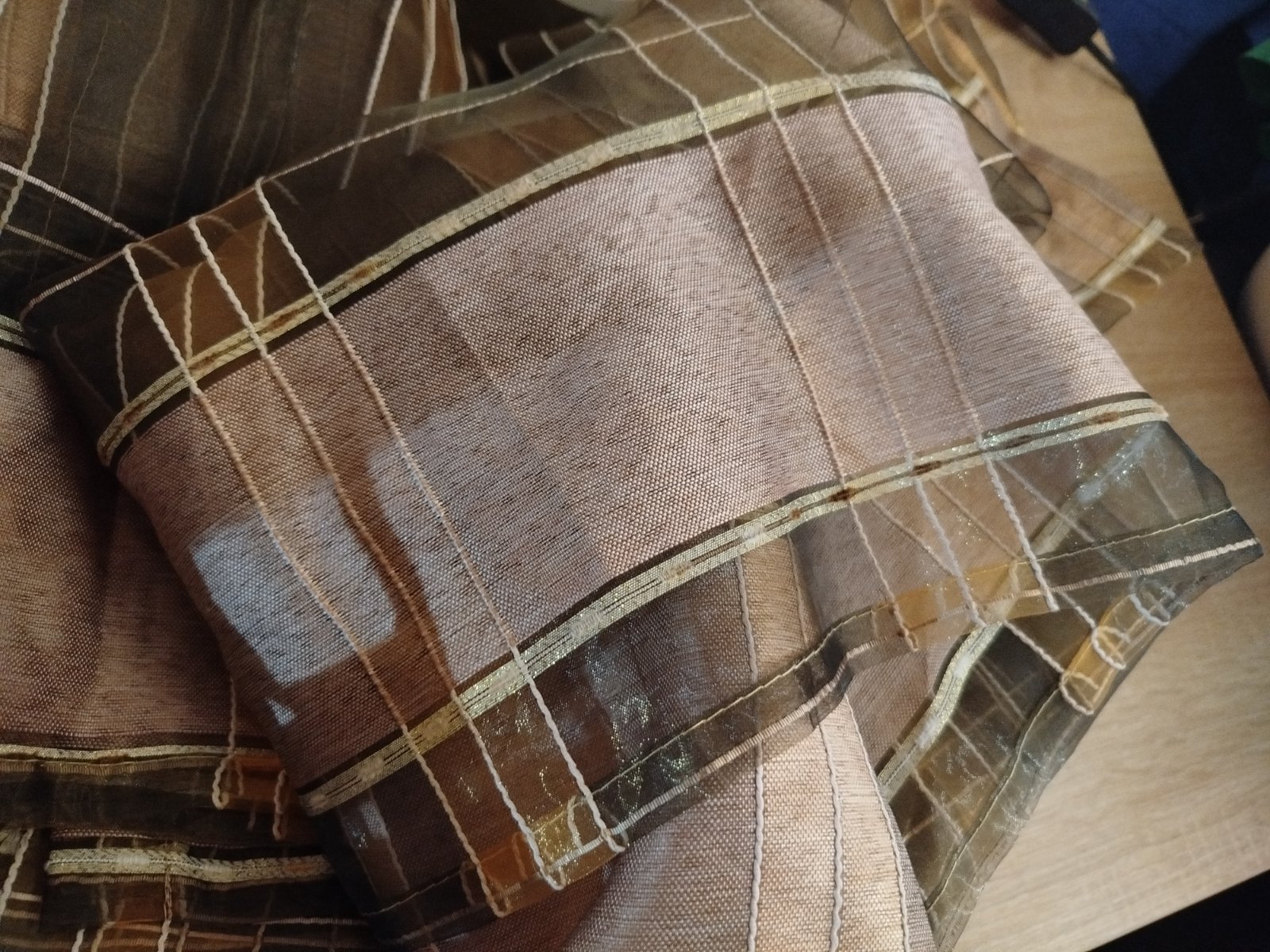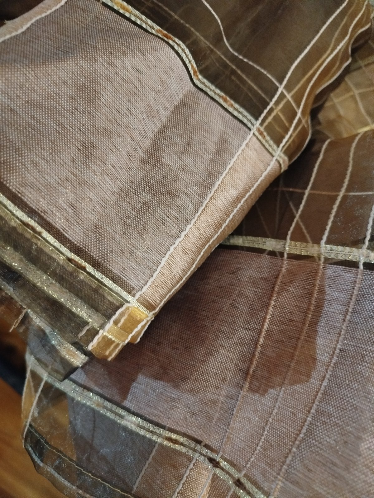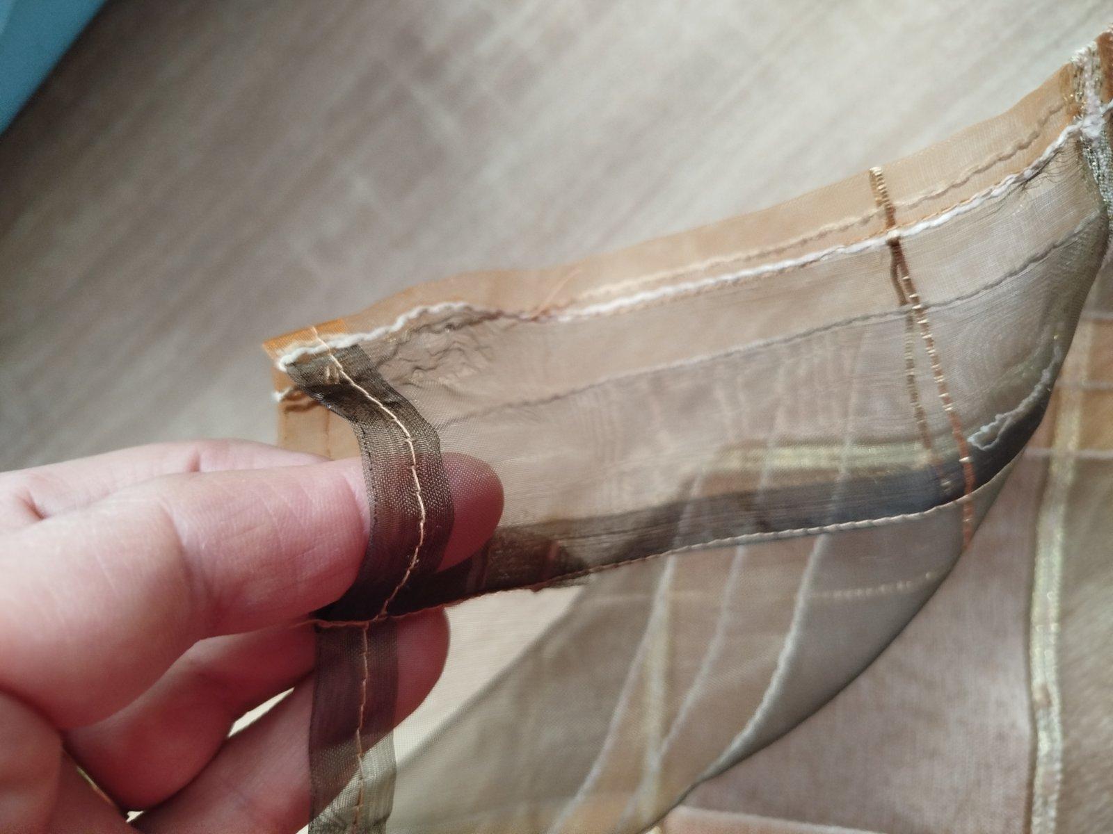 - pekne, párkrát použité, velmi zachovalé, nenašla som poškodenie, iba uplne hore pár zatiahnutí, všetko pofotene, pekné, prešité s trblietavou zlatou niťou