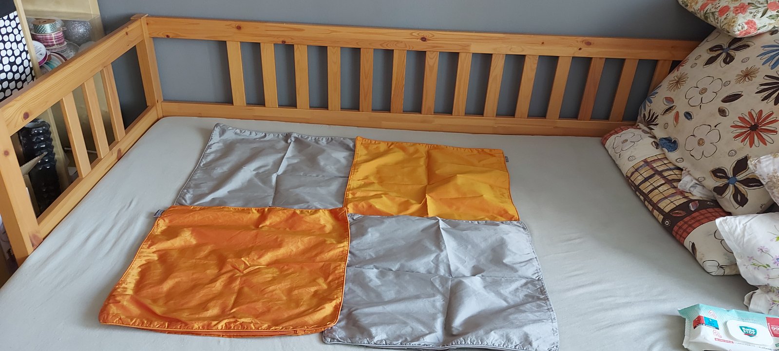 Predám 4 kusy návlečiek na vankúše 50x50 cm ,farba sivá a oranžová obliečky menia odtieň na slnku. Na jednom je fliačik vidno na foto cena za kus 1euro plus poštovné, posielam aj paketou.