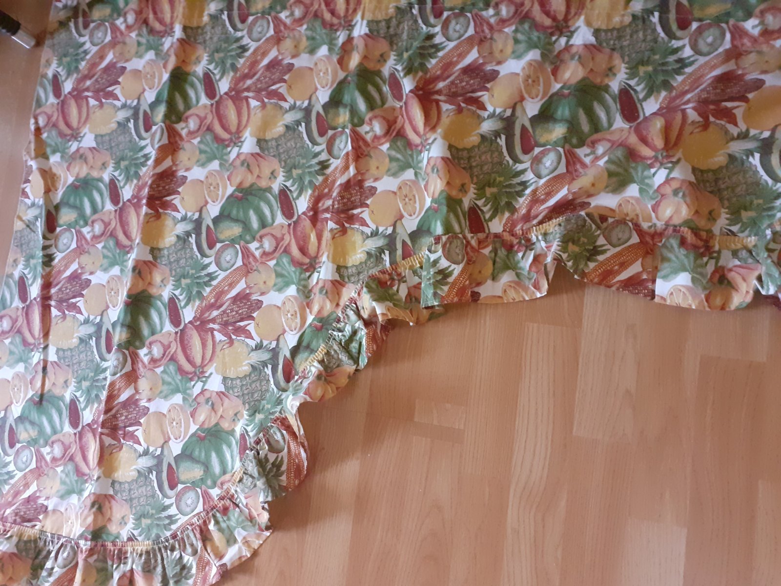 Horný záves šitý do oblúka, rozmer výška na krajoch aj s volánom 96 cm, v strede 41 cm, šírka 240 cm. Motív ovocie a zelenina, zavesenie na tyč alebo žabky, veĺmi dobrý stav, ĺahká údržba.