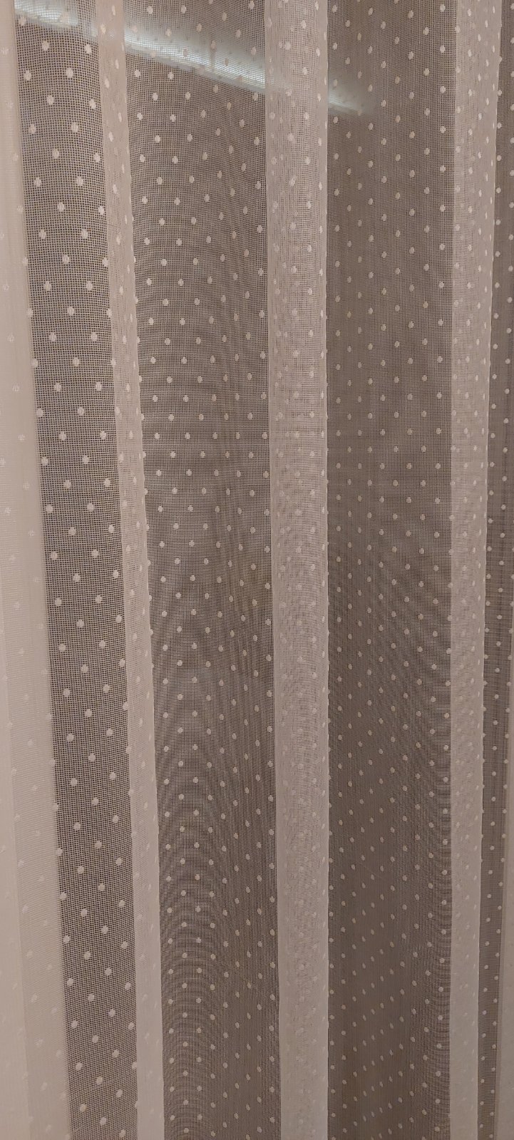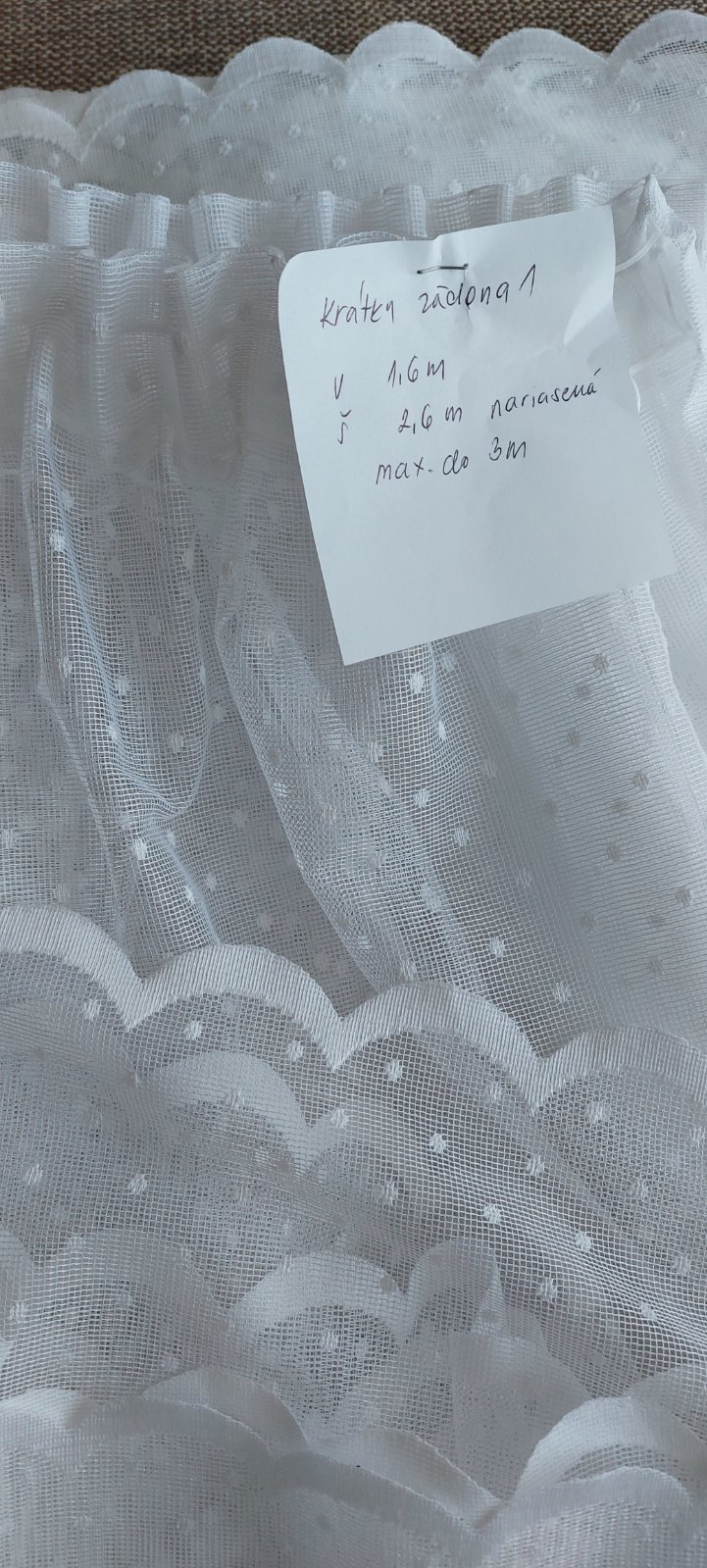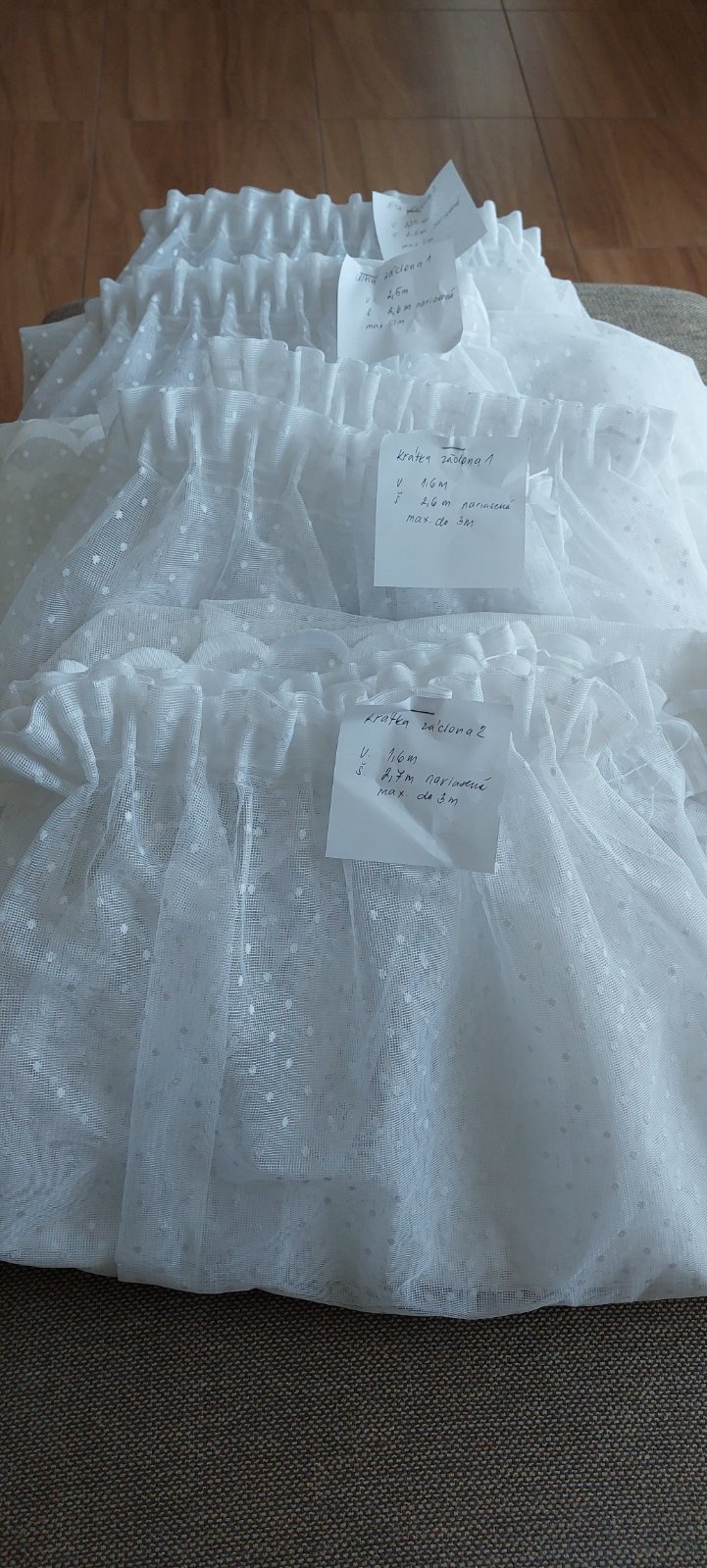 4 ks záclon podľa rozmerov na fotke, šité profesionálne, s riasiacou páskou, vzor bodka, ukončenie vlnitý lem. Minimalistický štýl, dôvod predaja: zmena typu garníže - záclona mi už nepasuje rozmerovo. Rozmer na okno - výška záclony 160cm, nariasené na šírku 260-270cm- max 300cm. Rozmer na balkón/okno- výška 235 cm a 250cm, nariasené teraz na 260cm, maximálne možno nariasiť na 300cm. Cena za ks 20e. Kúpu doporučujem.