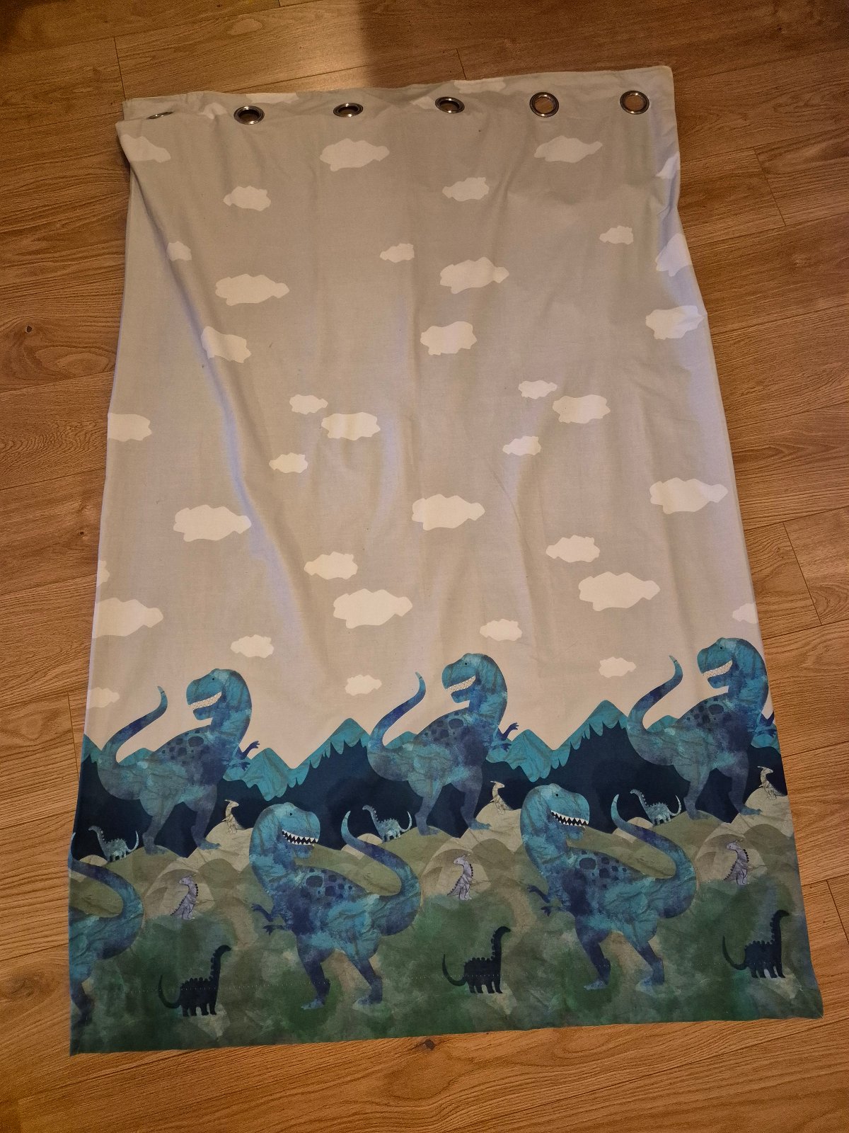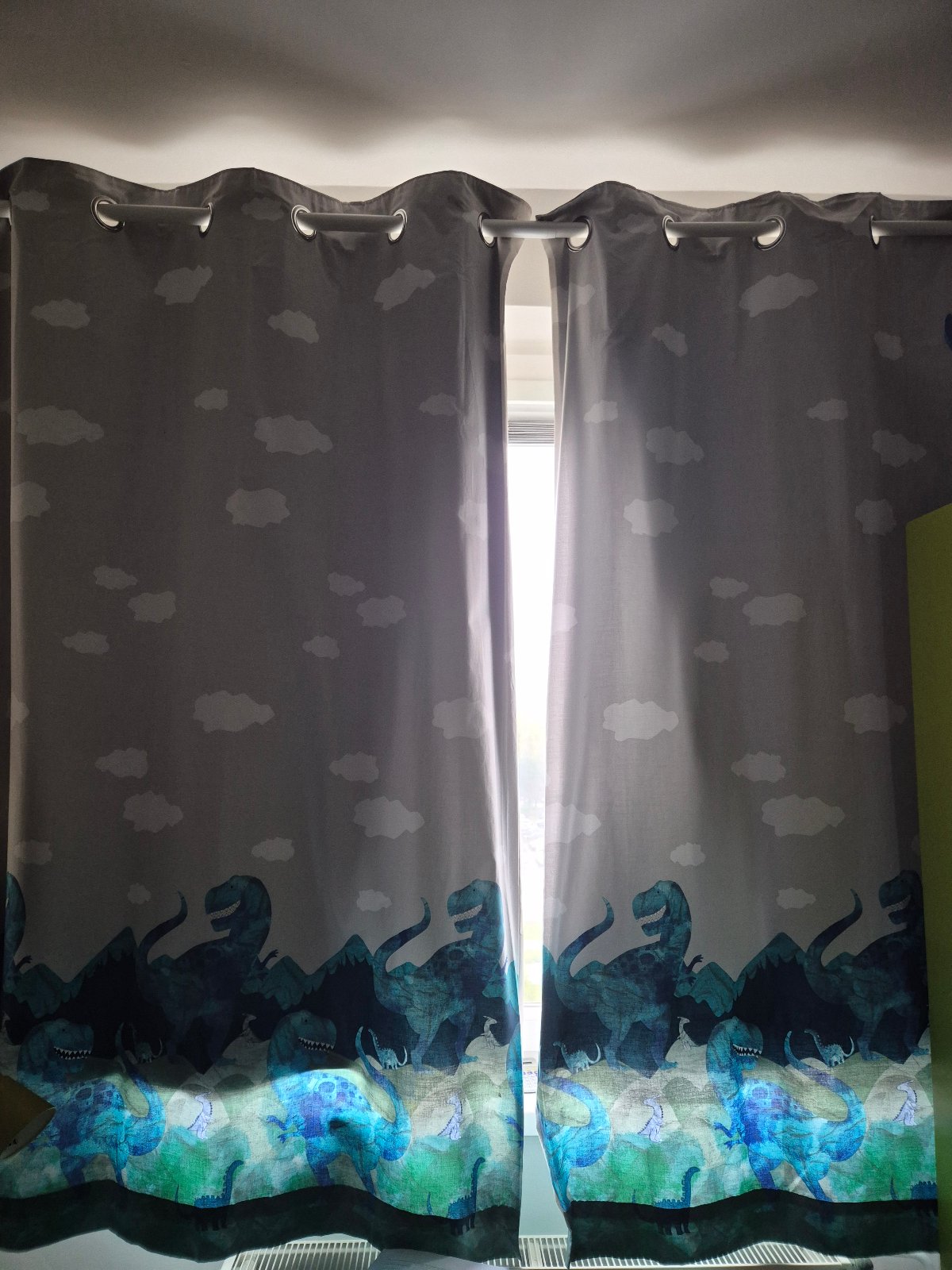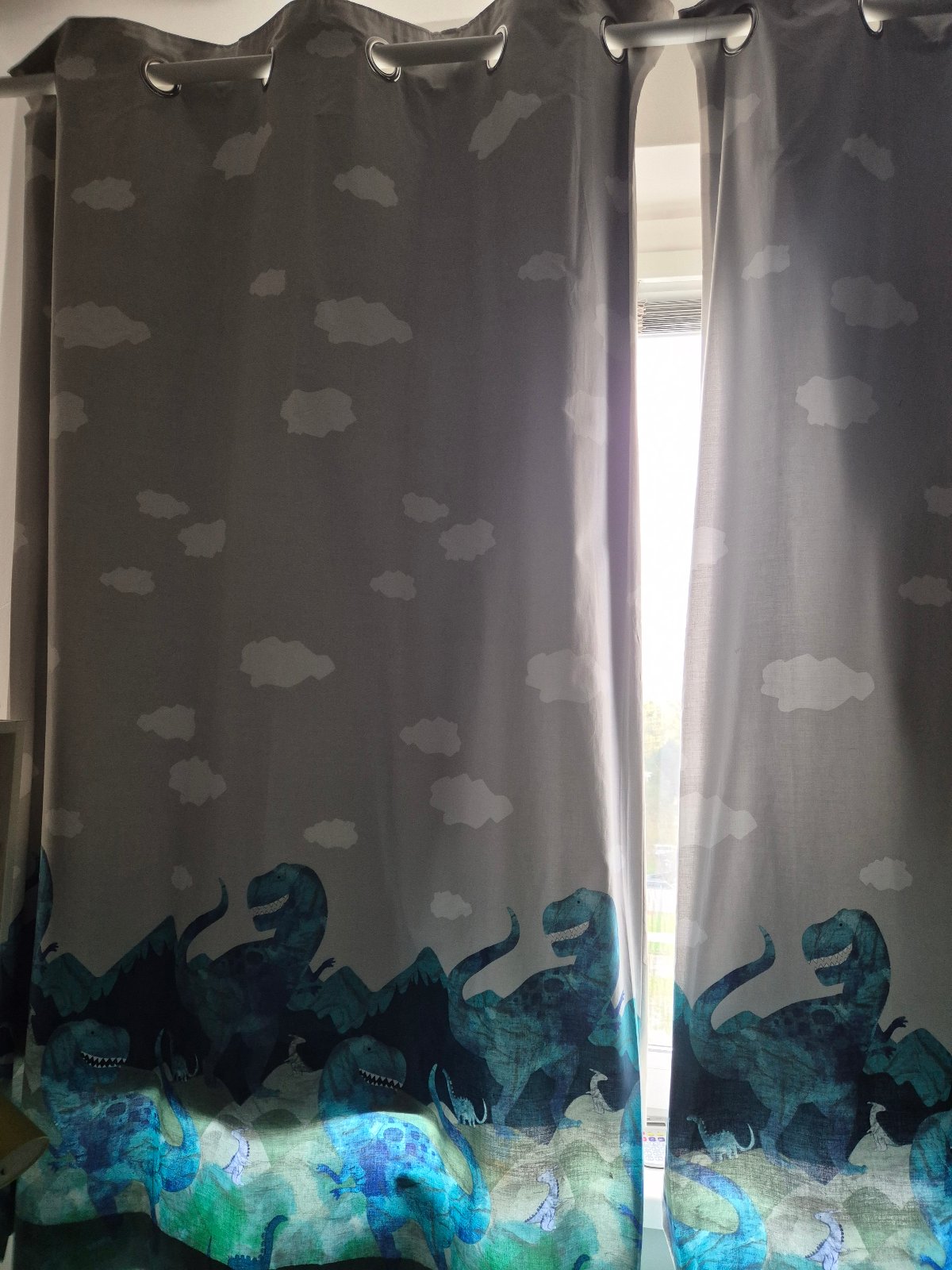 Zatemnovacie zavesy do chlapcenskej izby s motivom dinosaurov. Rozmery jedneho zavesu 117x183cm, su ciste oprane, pripravene na pouzitie