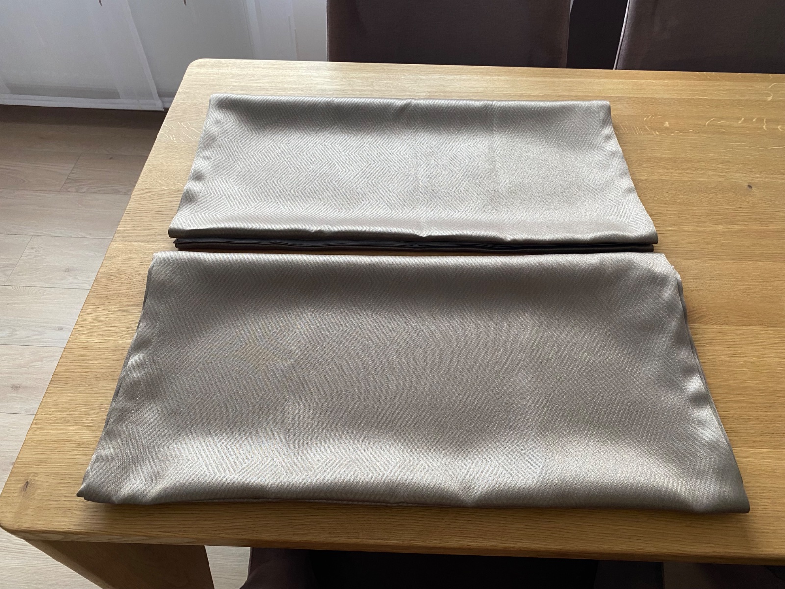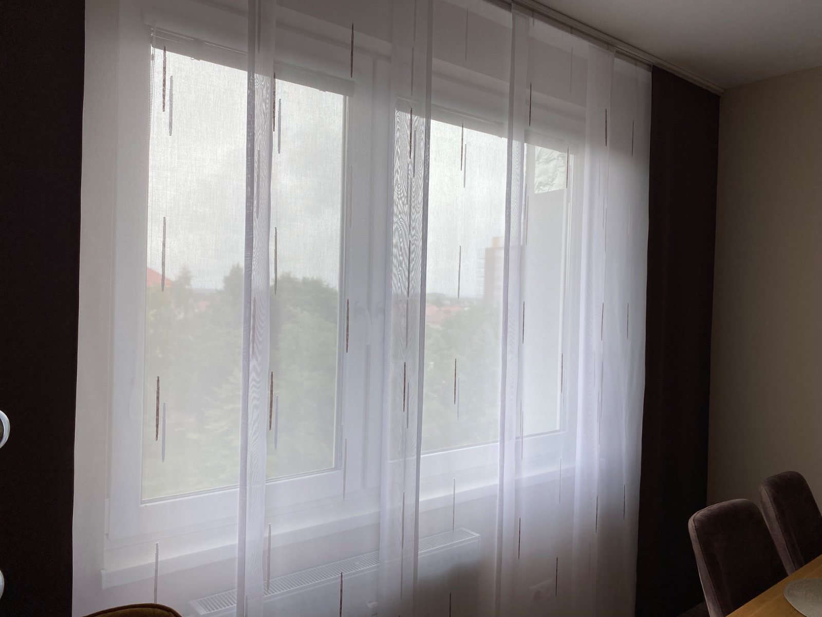 Predám namieru šité záclony a závesy. Dĺžka: 250 cm, šírka jedného panelu 60 cm. Spolu 7 panelov s ťažidlami, 5 záclon a 4 závesy, 2 závesy sú úplne nové, nepoužité, nedávno šité. Pripevnenie na panel suchým zipsom.