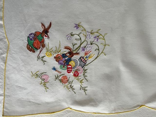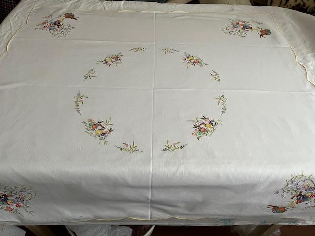 Krásny obrus biely so žltým lemovaním a s pestrou výšivkou. Rozmer 82x82 cm. V rohoch je väčšia výšivka, viď hlavné foto, v strede do kruhu. je to 100% bavlna, súper stav.