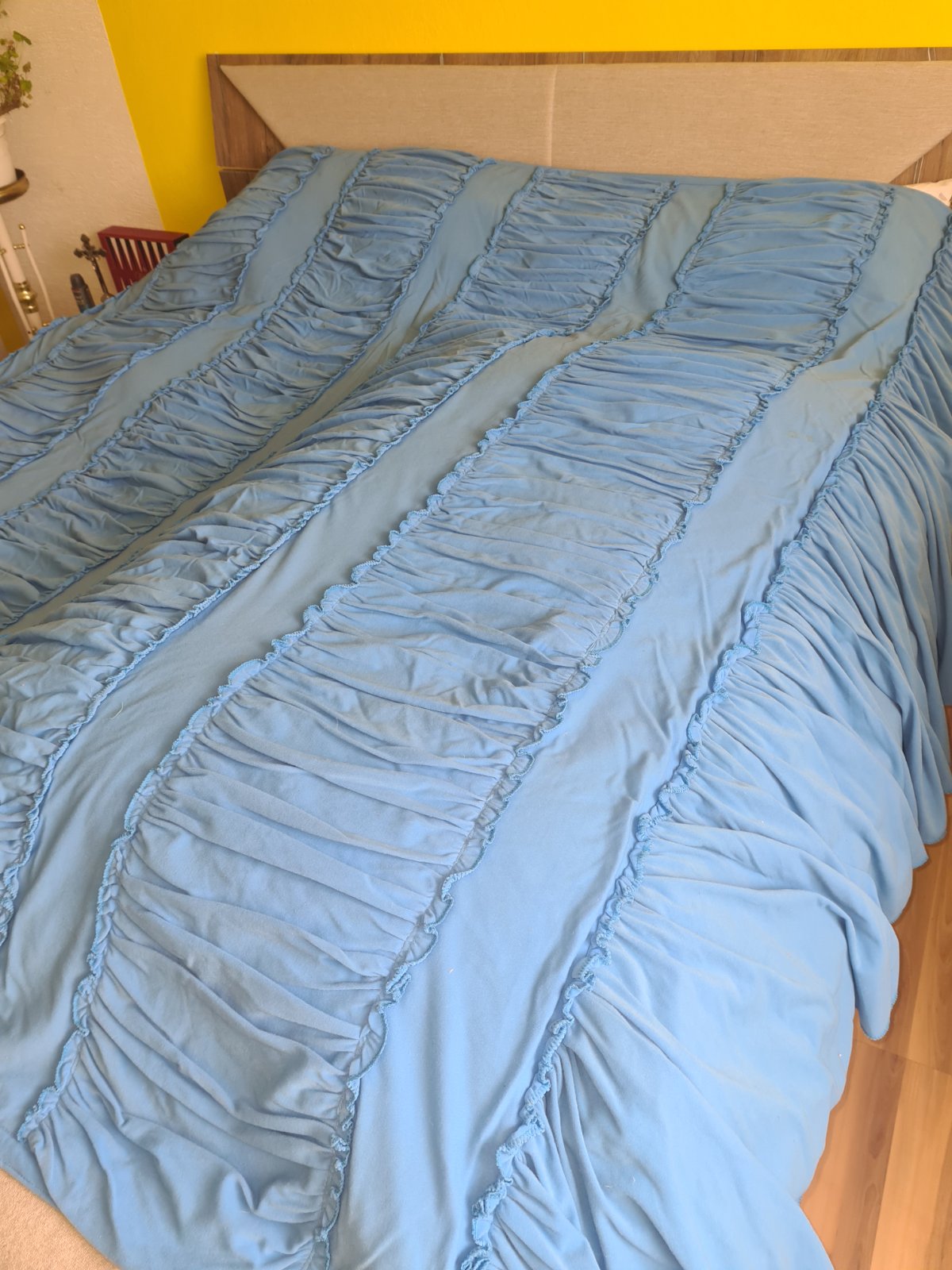 Používaný prehoz na posteľ. Na okraji svetlý fľak (skryje sa pod matrac) Rozmery: 167 x 210 cm.