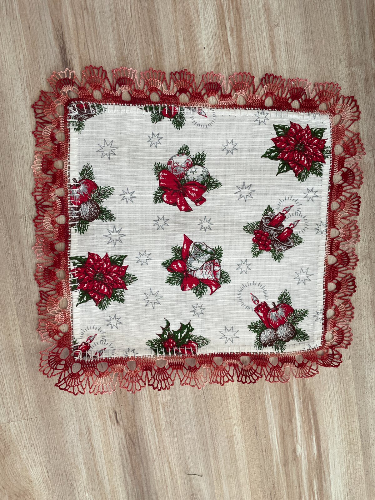 Vianočná dečka s červeným hačkovaným lemom(4cm), rozmer cca 38x38cm. Poštovné podľa cenníka pošty.