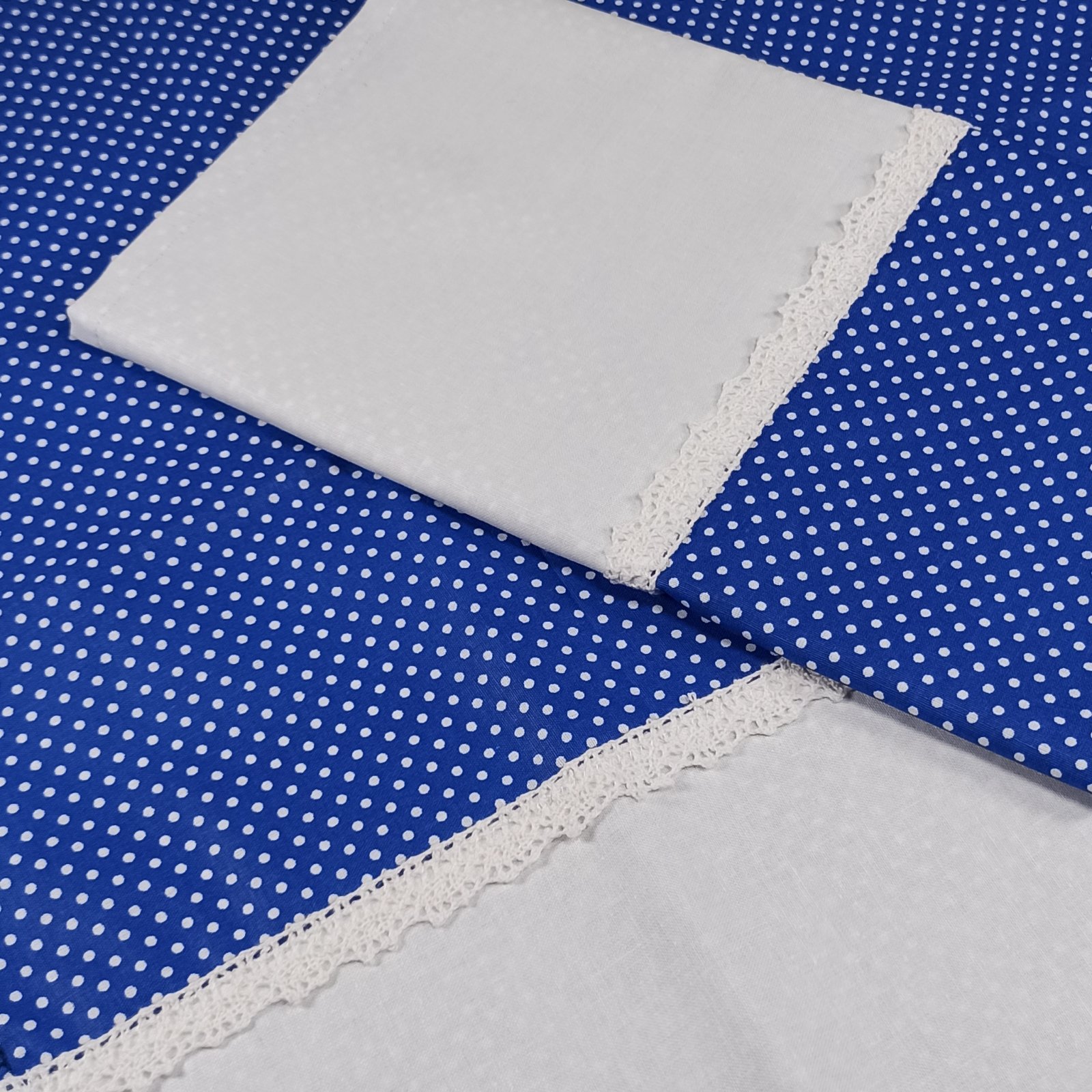 Nové, ušité z bavlnenej látky, ozdobené bielou bavlnenou krajkou.