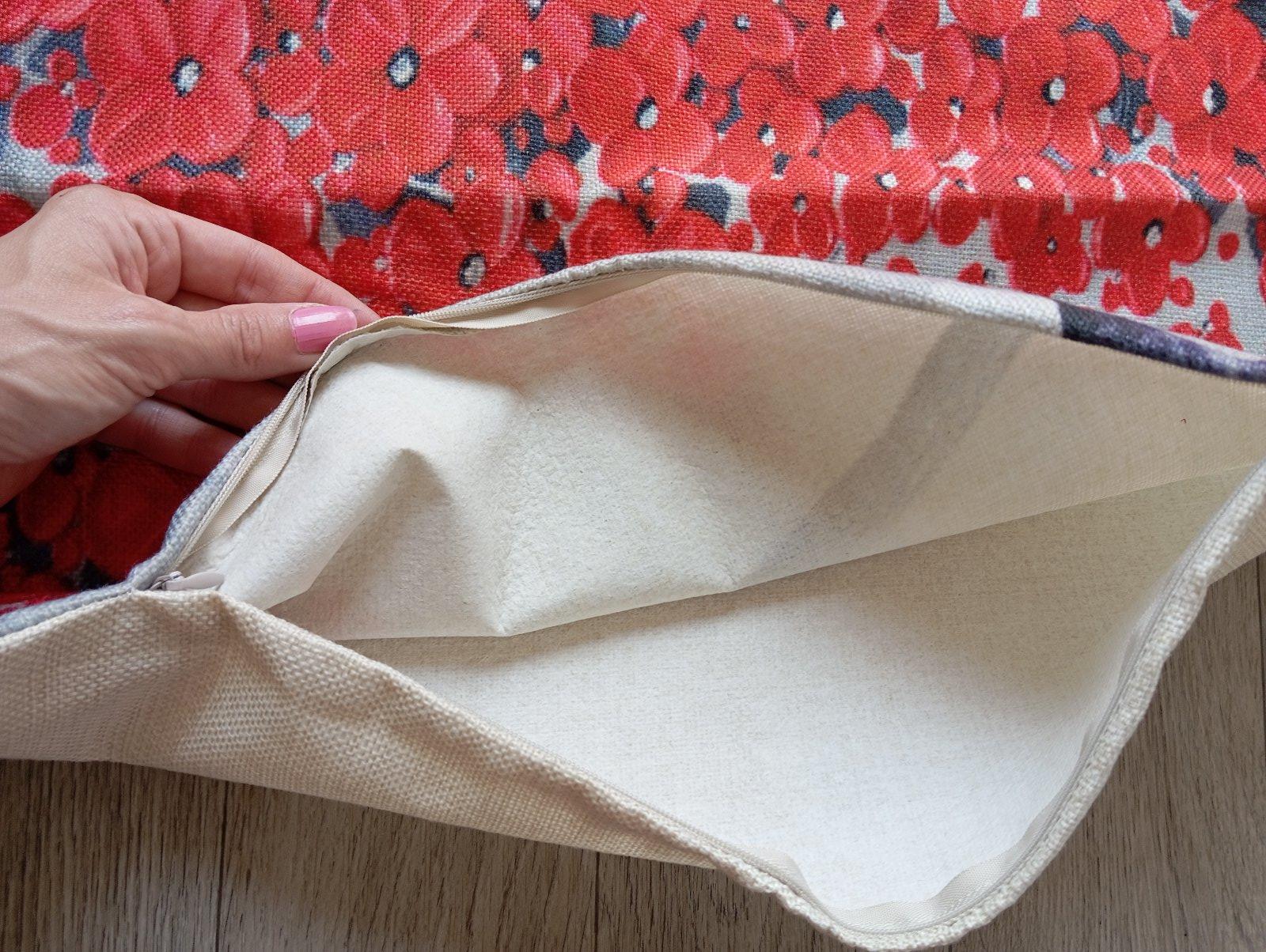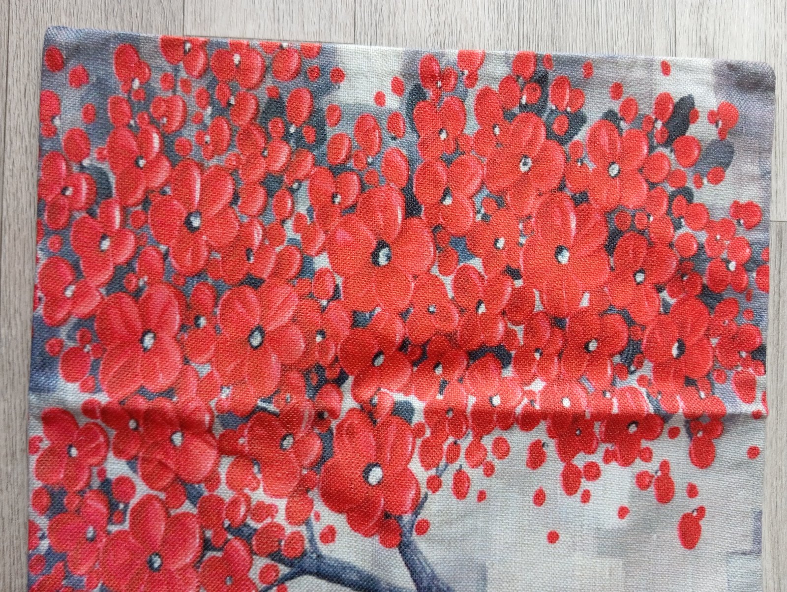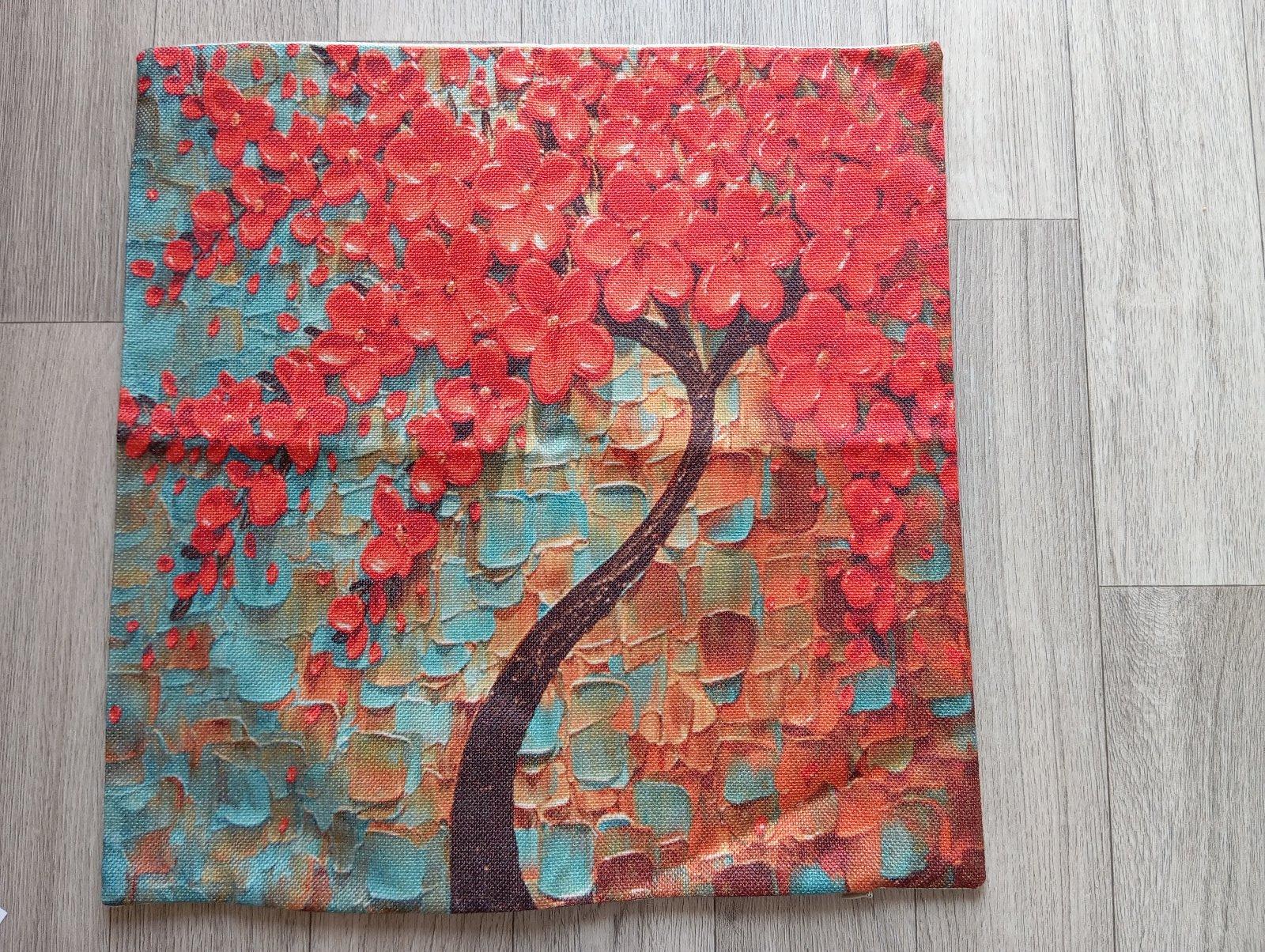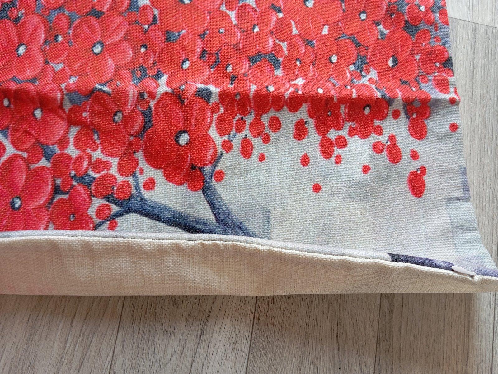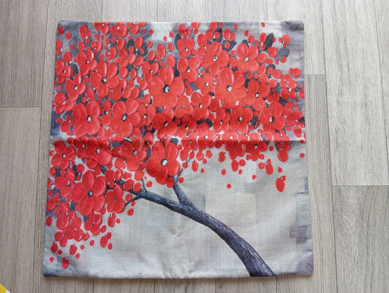 3. Béžová plátenná obliečka na vankúš so stromom s červenými kvetmi.