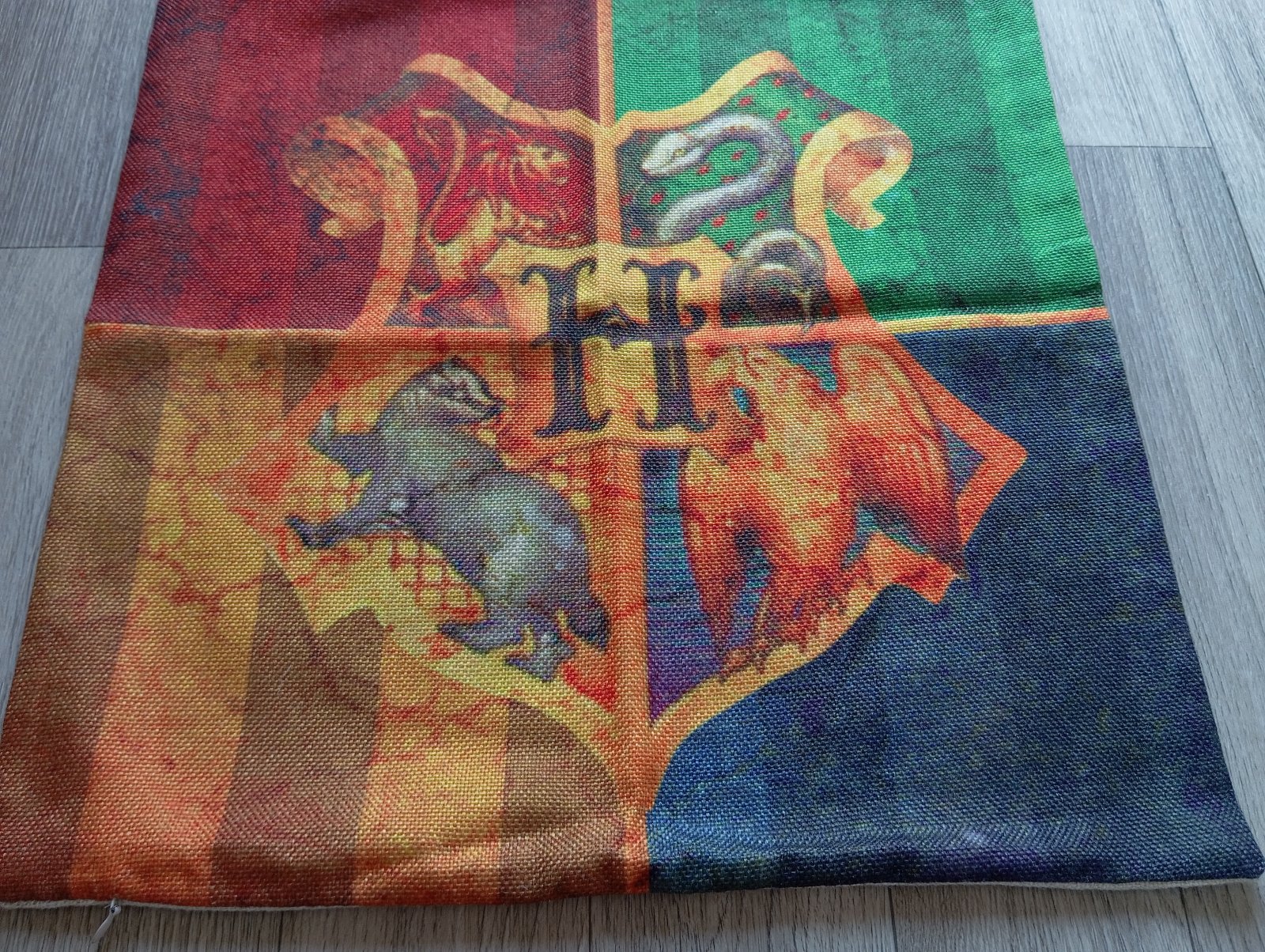 5. Béžová plátenná obliečka na vankúš s erbom Rokfortu (Hogwarts - Harry Potter).