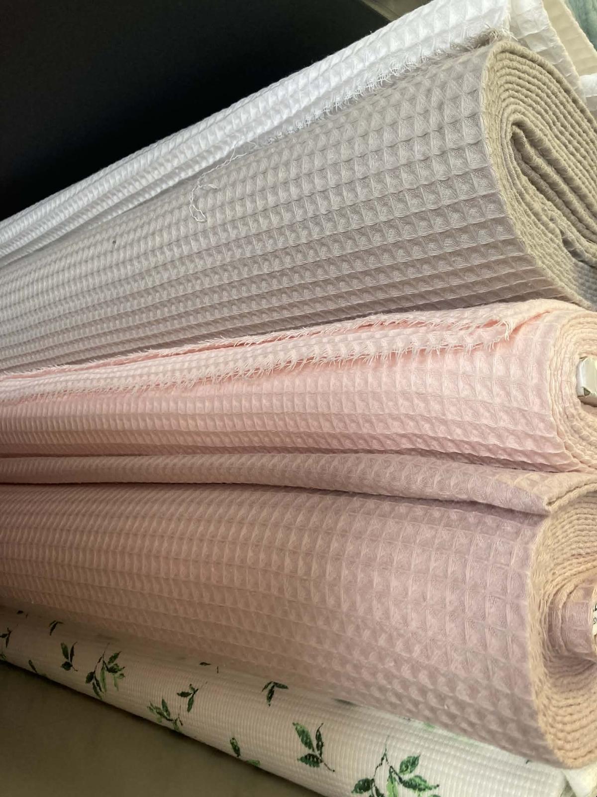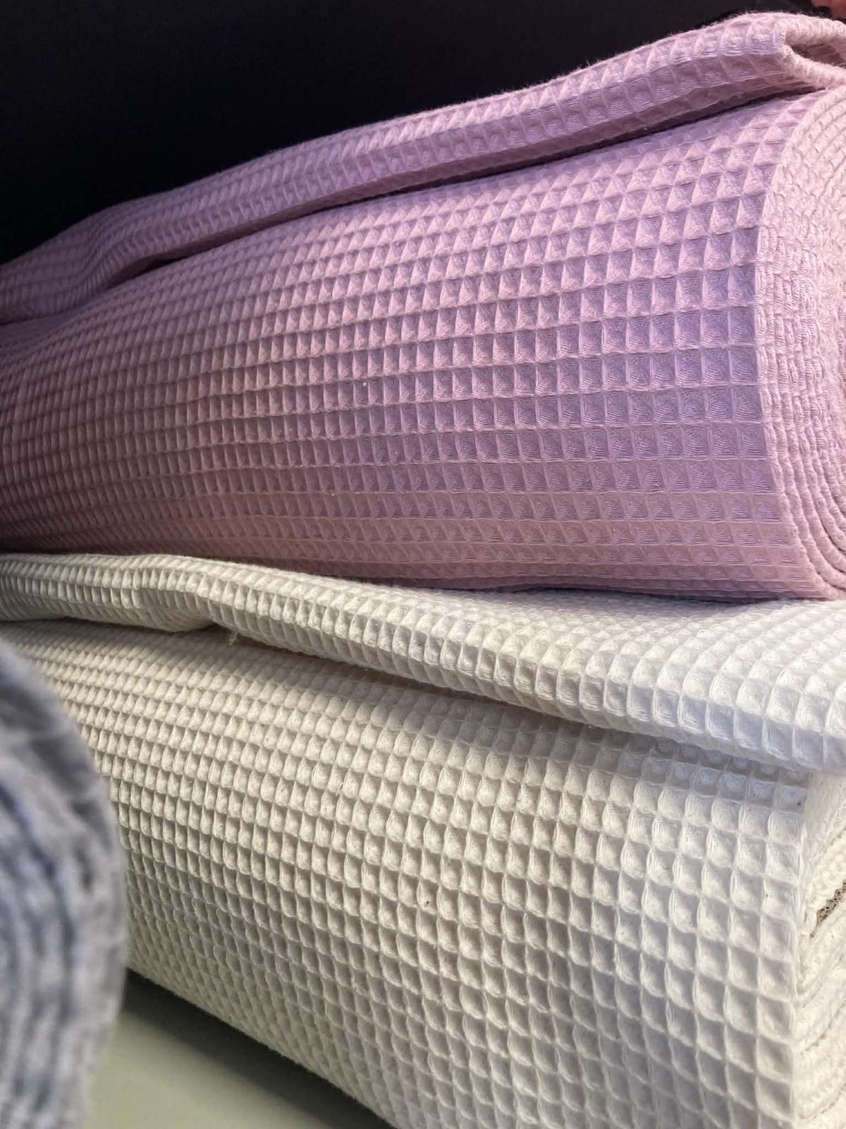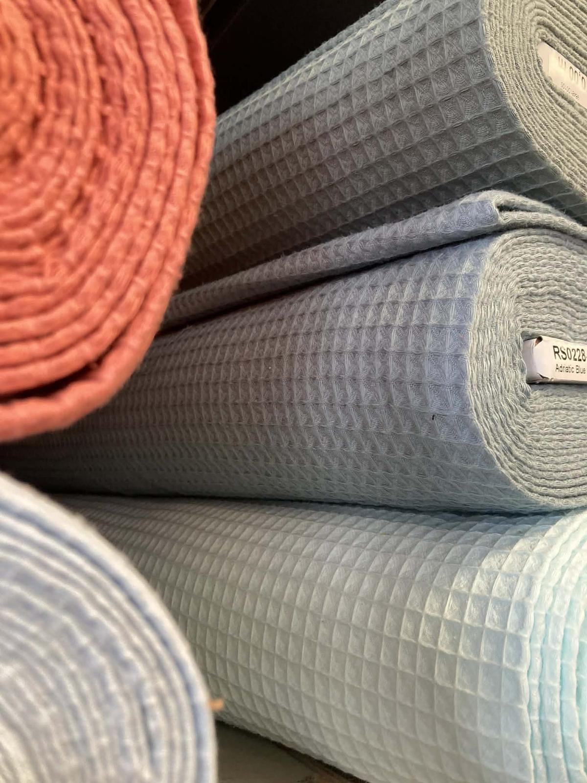Bavlnenú vaflovú metráž vám ponúkame v gramáži 240 g/m2. Jej použitie je mnohostranné, predovšetkým je ideálna na šitie kúpeľnového sortimentu ako sú uteráky, osušky, turbany, župany, alebo aj kuchynské utierky, či letné deky pre najmenších.