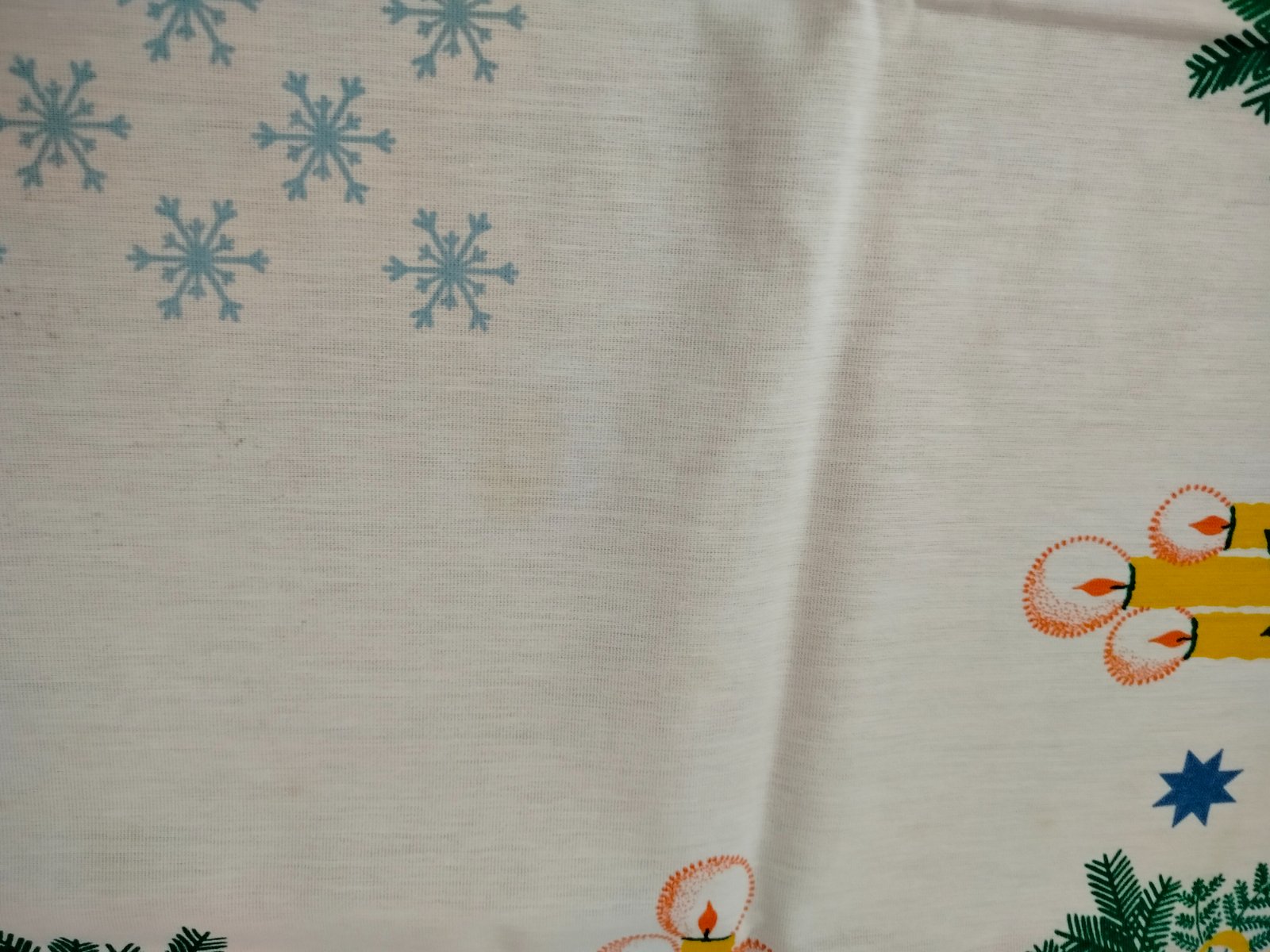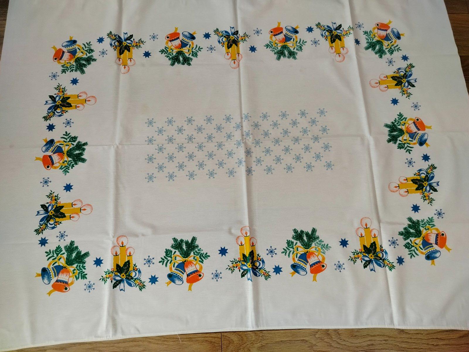 Predám krásny retro vintage vianočný obrus bielej farby s farebnou potlačou vianočných motívov: zvončeky, sviečky s plamienkami, ihličie, hviezdičky a snehové vločky. Klasický dizajn z obdobia okolo 70.-80. rokov, ideálny na slávnostný vianočný stôl alebo ako nostalgická dekorácia. Výborný stav bez dier alebo väčších poškodení, len bežné znaky veku, 2 škvrny (viď.foto). Rozmer 150 × 110 cm.