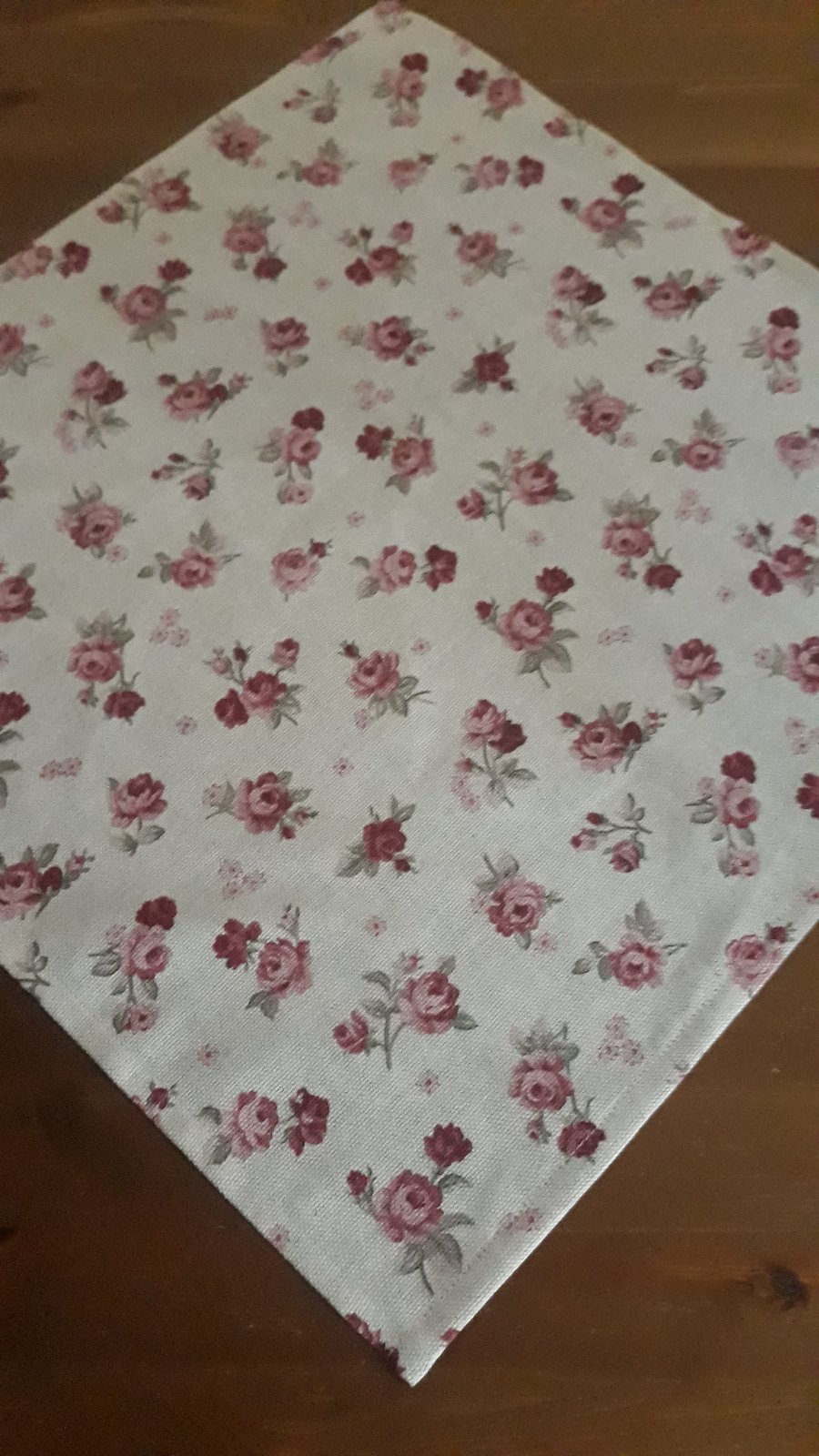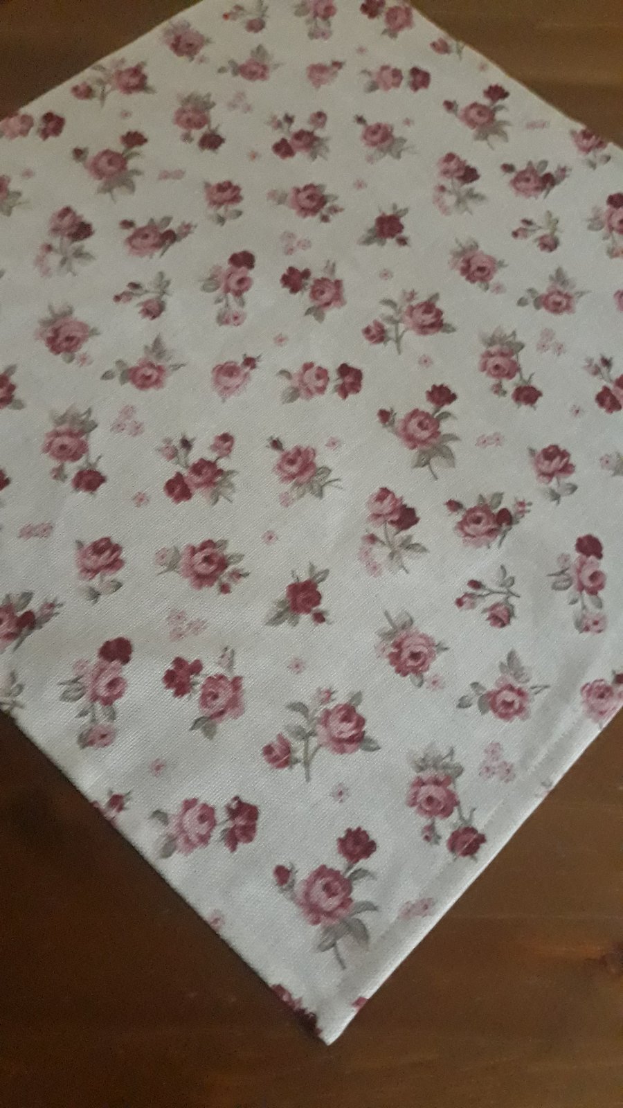 Obrus je ušitý zo zmesovej látky 80%BA+20%PES.Bordové ružičky na režnom podklade.