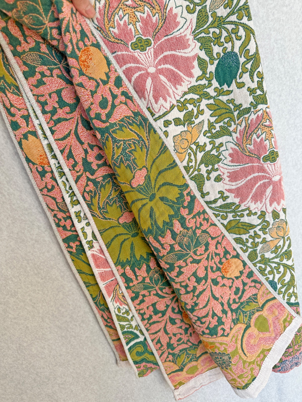 Krásny nadýchaný bavlnený prehoz v jemných pastelových farbách. Dá sa použiť obojstranne. Je hrubší, možno použiť aj ako koberček alebo dokoračný obrus. V super stave, bez poškodení.