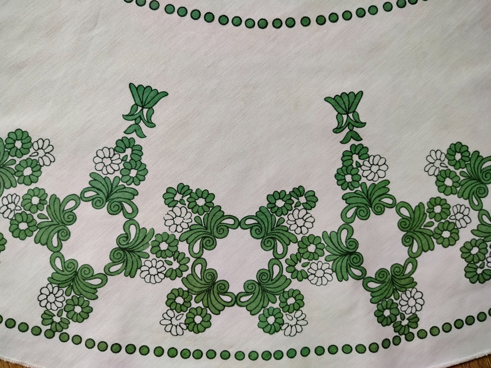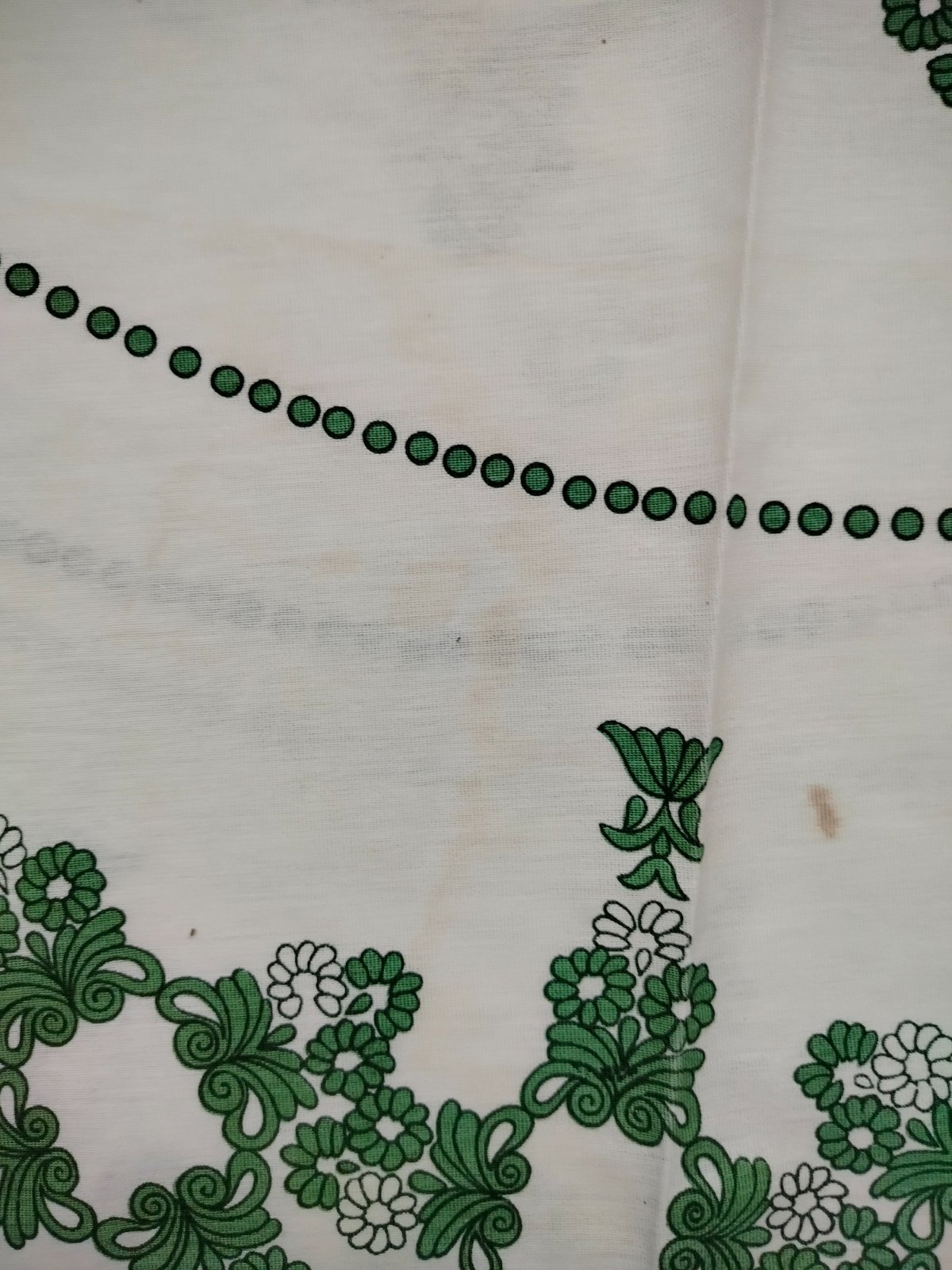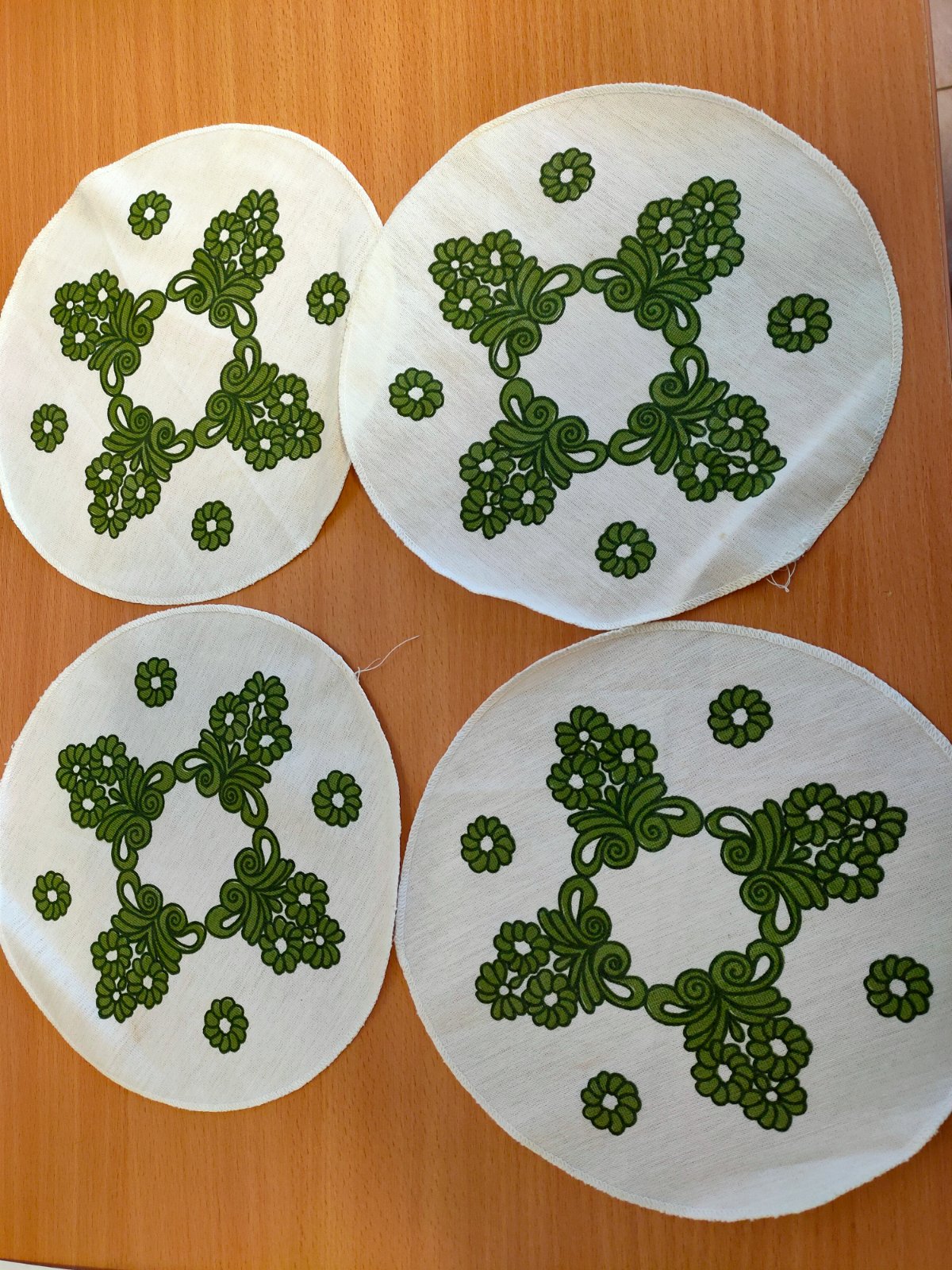 Predám retro okrúhly obrus, priemer 140cm, 4ks obrúsky, priemer 22cm. Nálezovy stav, na obruse som pri fotení našla 1 fliačik (viď.foto) a daku svietlučku smužku, voľným okom ju nie je vidieť, určite to pôjde vyprať,..ja nato nemám čas.