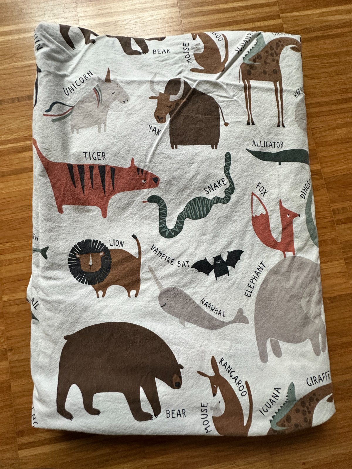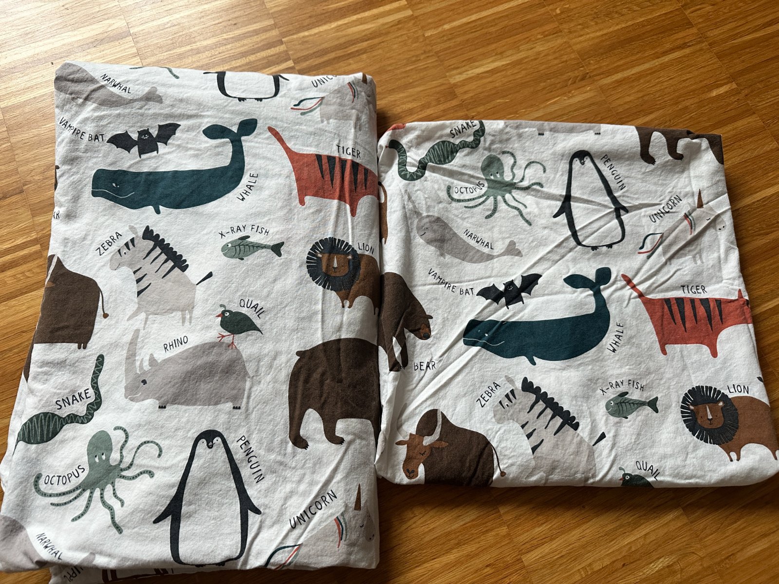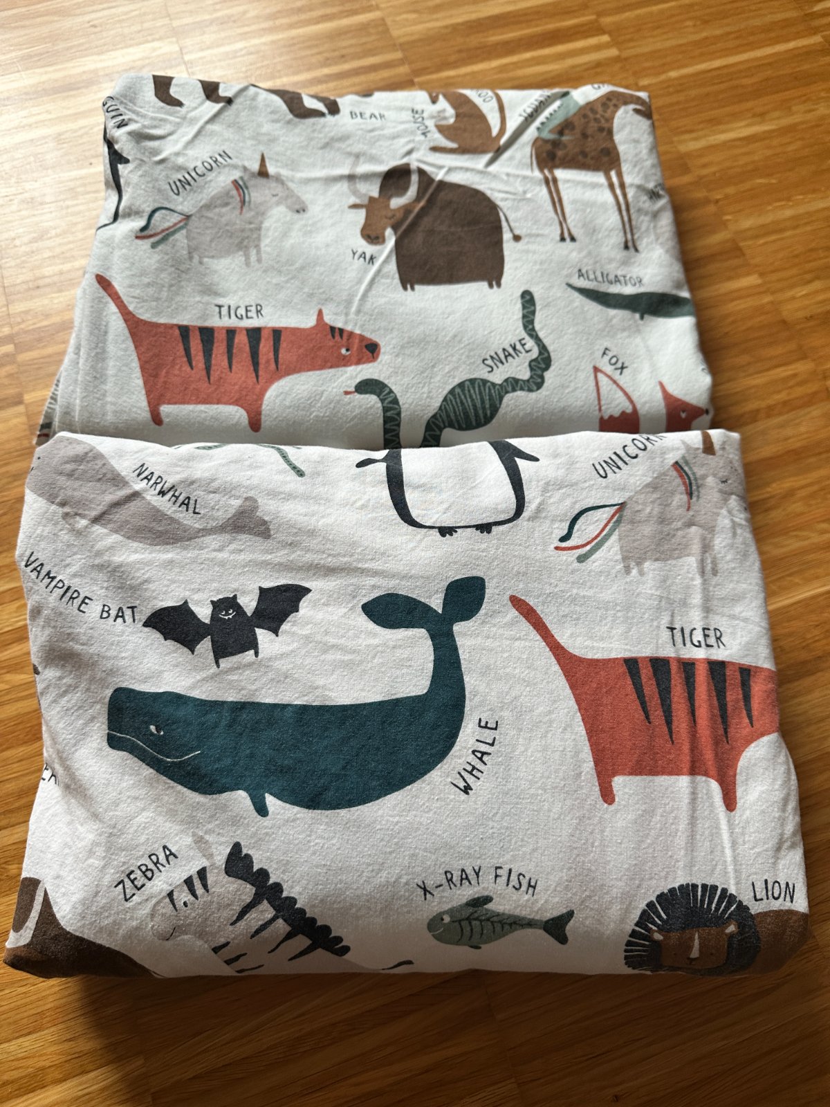 100% organic cotton, krásne. Rôzne zvieratká, použité pár krát, top stav, ako nové. Rozmery sú rôzne každej sady: