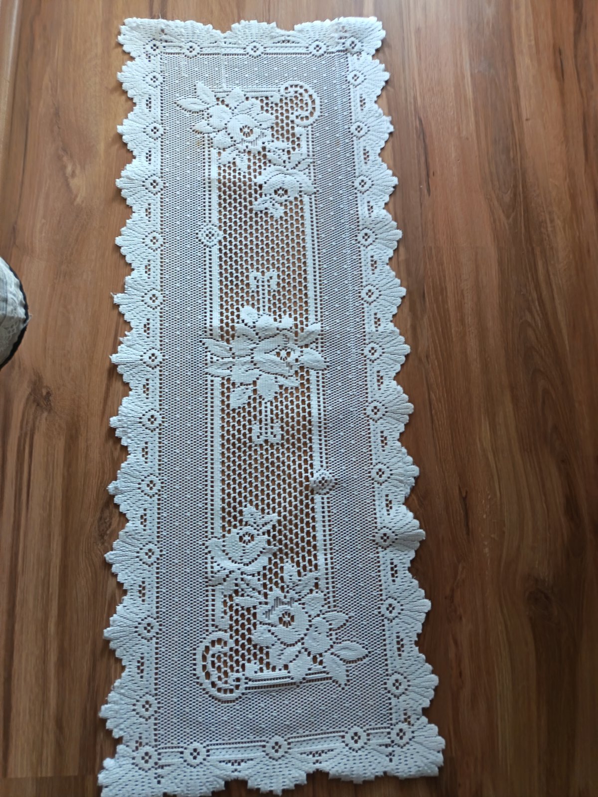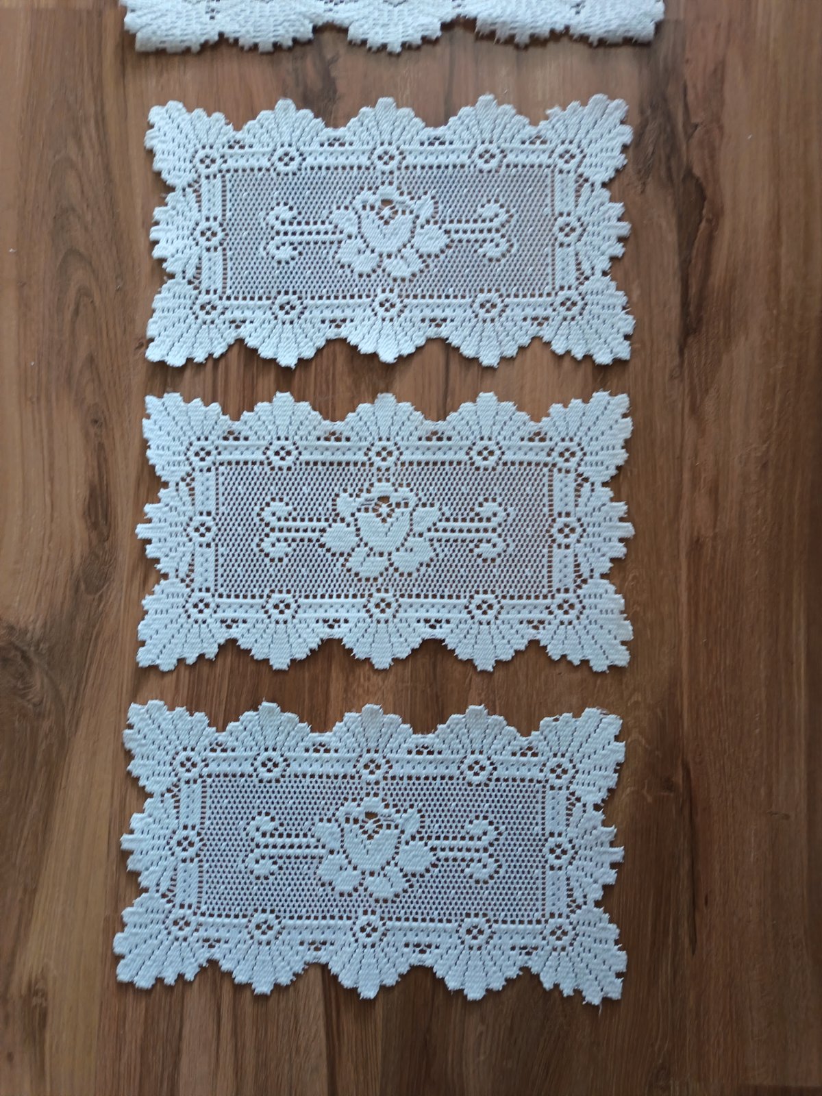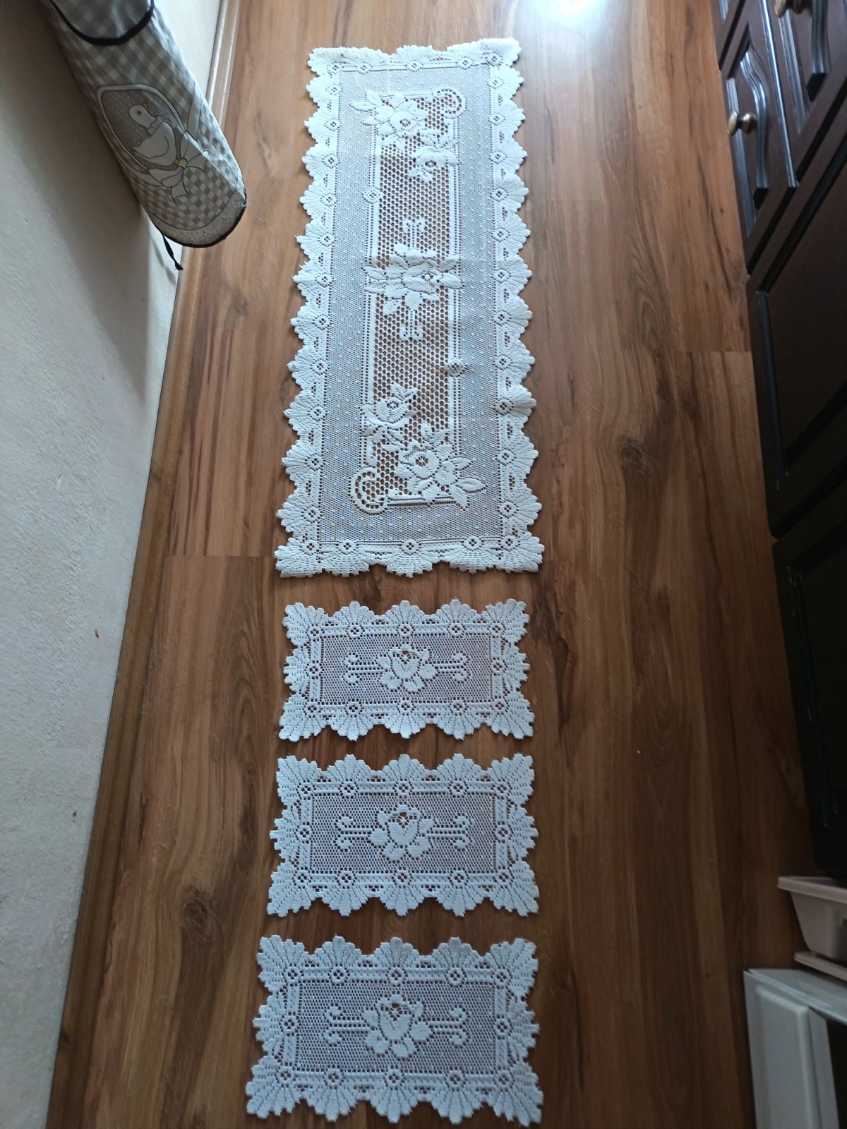 Predám čipkovaný obrus o rozmerov 104x38cm, menšie 3ks o rozmerov 34x20cm.