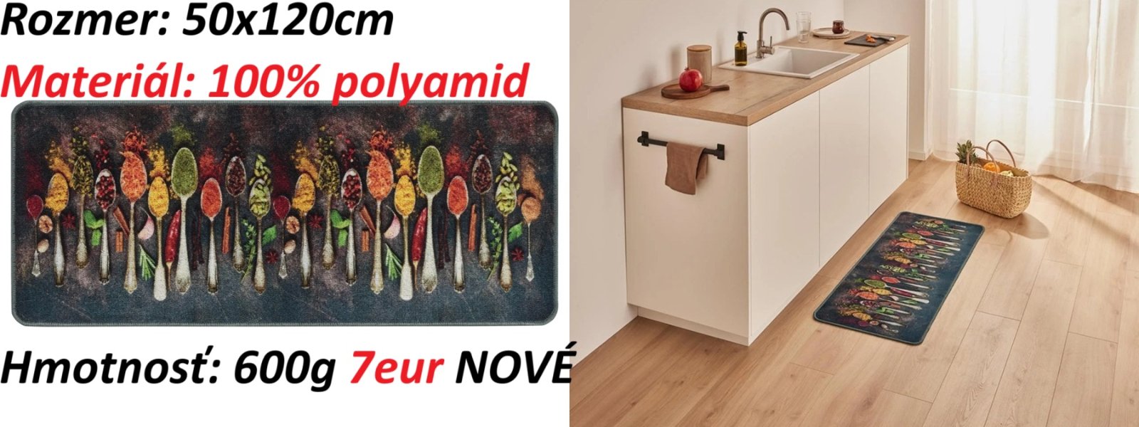 Ďalej predám koberce do kuchyne. Vzor korenie a vzor čili/chilli. Materiál: 100% polyamid. Rozmer: 50x120cm. Hmotnosť: 1010g/m2, kusová hmotnosť 606g. Cena 7eur za kus.