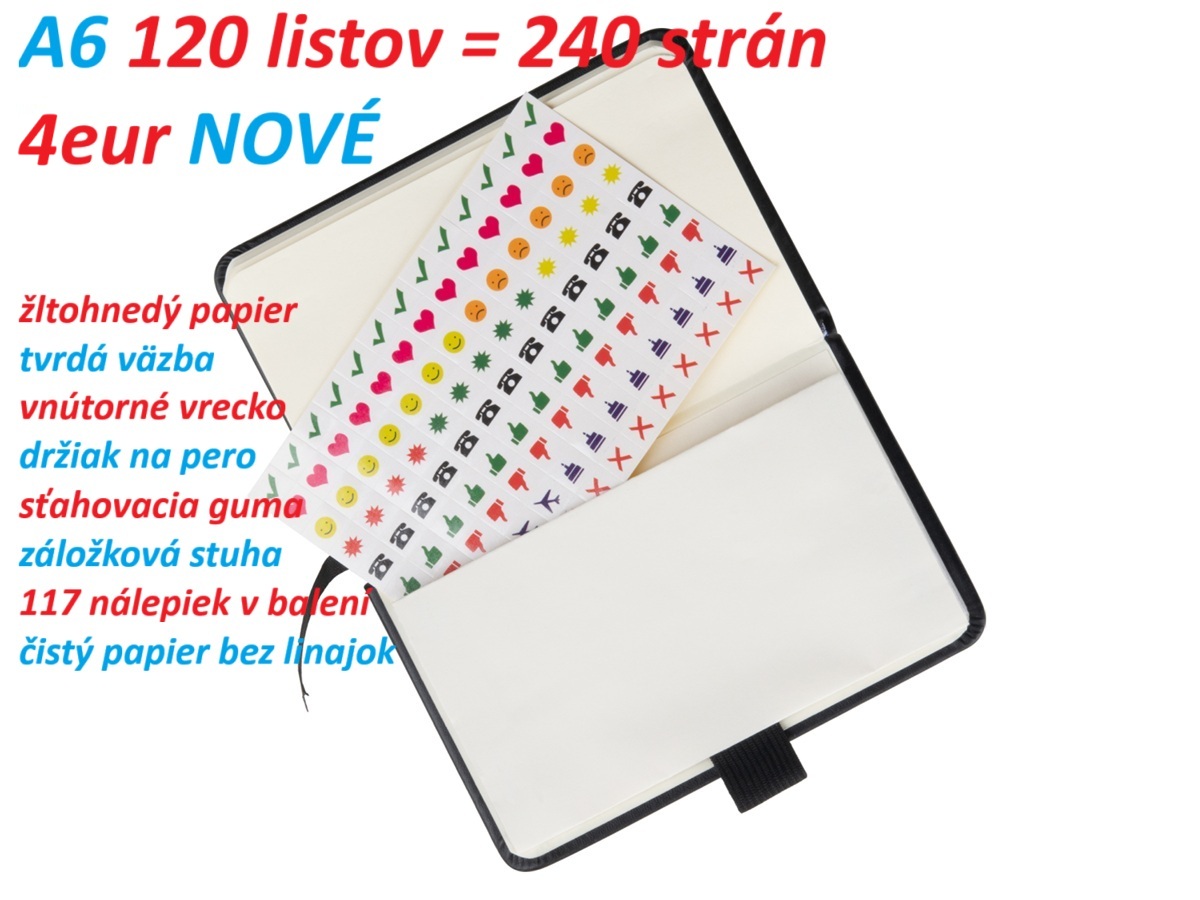 Ďalej predám poznámkové bloky formát A6 120 listov = 240 strán. Žltohnedý papier, tvrdá väzba, vnútorné vrecko, držiak na pero, sťahovacia guma, záložková stuha, 117 nálepiek, linajkový papier, čistý papier bez linajok. Cena 4eur za kus.