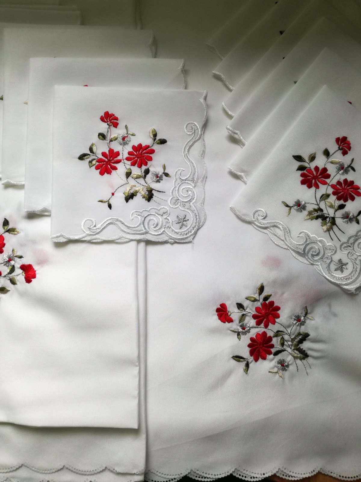 Obrus polyester, 140 x180, s výšivkou, + 12 ks prestieraní. Top stav.