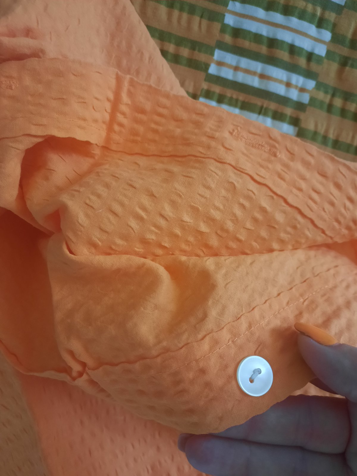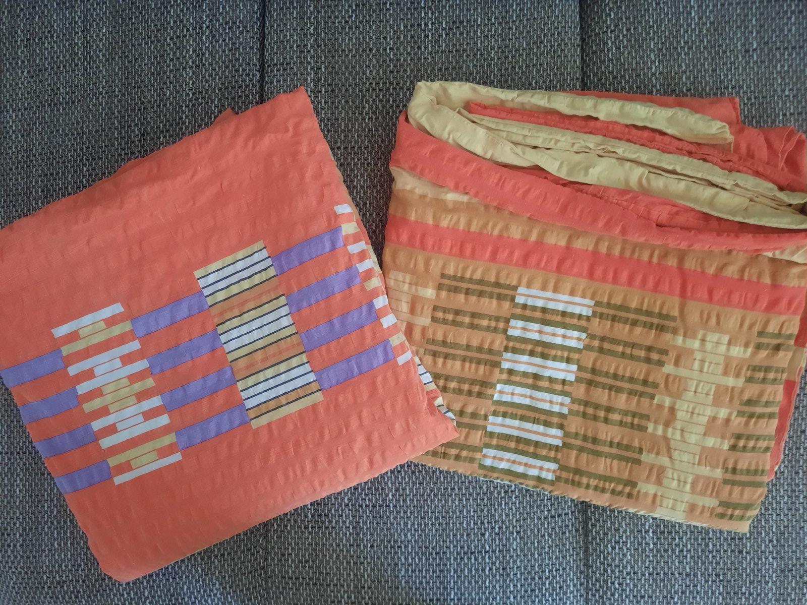 Predám krepové posteľné prádlo- návliečka na 2 postele ...sú tam 2 paplóny + 1 veľký oranžový vankúš +1 farebný podlhovastý vankúš. Zapínanie je na gombíky. Veľmi dobrý stav.