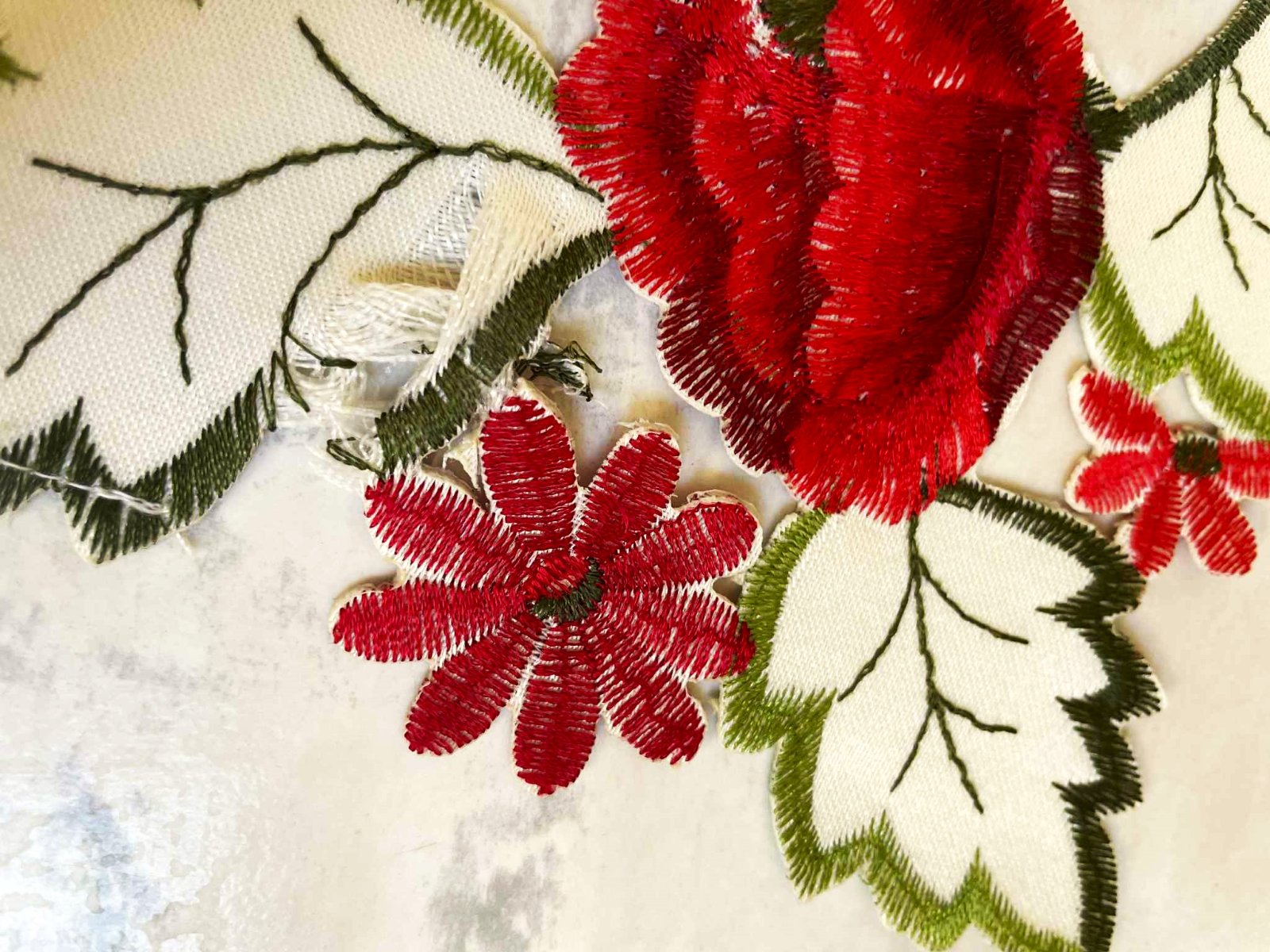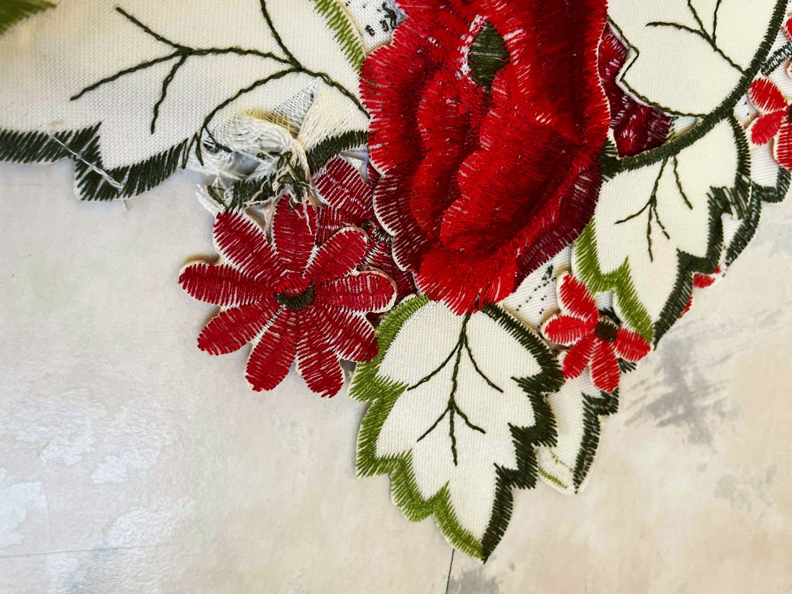 kvalitný luxusný obrus - štóla, rozmer : 176 cm x 39 cm,raz prestretý,krásne vykrajované vyšívané moderné vzory - strojovou technikou richelieu,kvalitne vypracovaný,perfektný materiál, má však malé strapky ( viď foto ), ktoré sa dajú pekne opraviť,viď posledné fotky - keď sa prestrie nie je to na kraji vidno - ale upozorňujem,preto aj taká cena,pc=49 eur