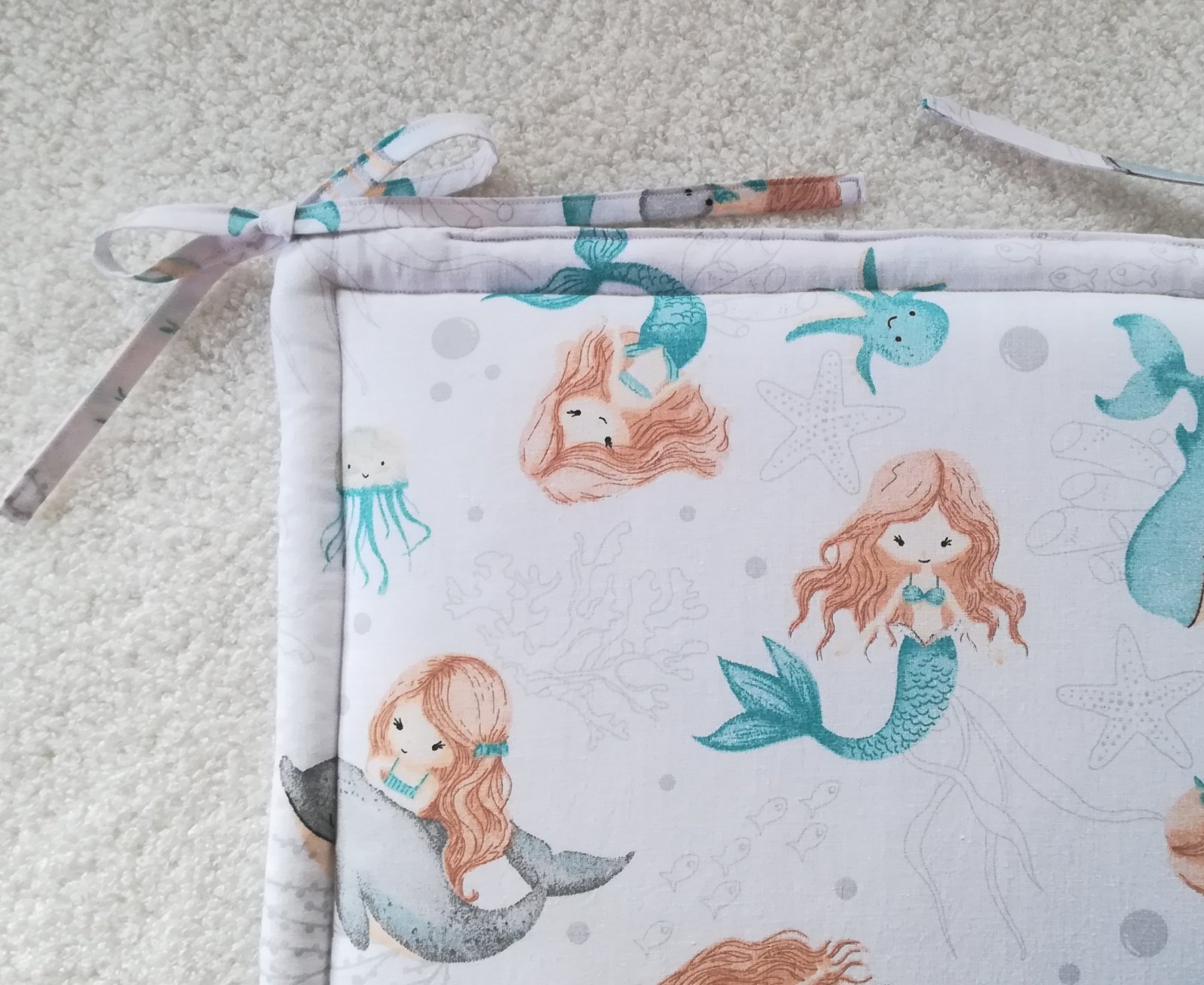 SkladomPodsedák/ vankúšik/ poduška na detskú stoličku do školy, škôlky alebo len tak na doma s bočným viazaním- Morská panna a delfín na bielom podklade. Môj vlastný handmade výrobok z mojej dielničky.