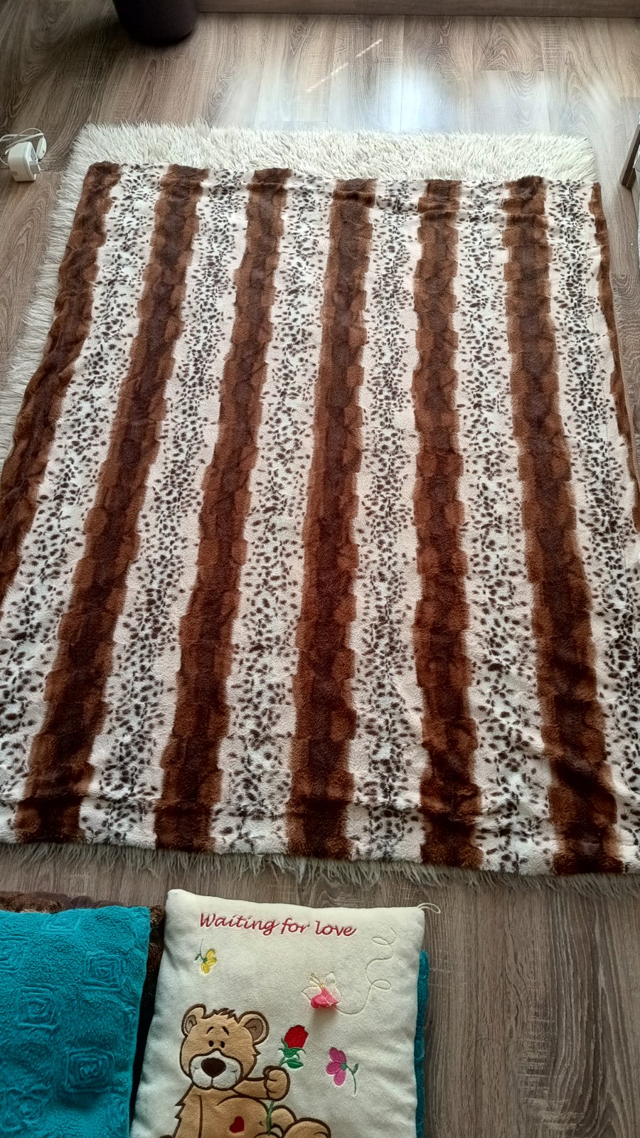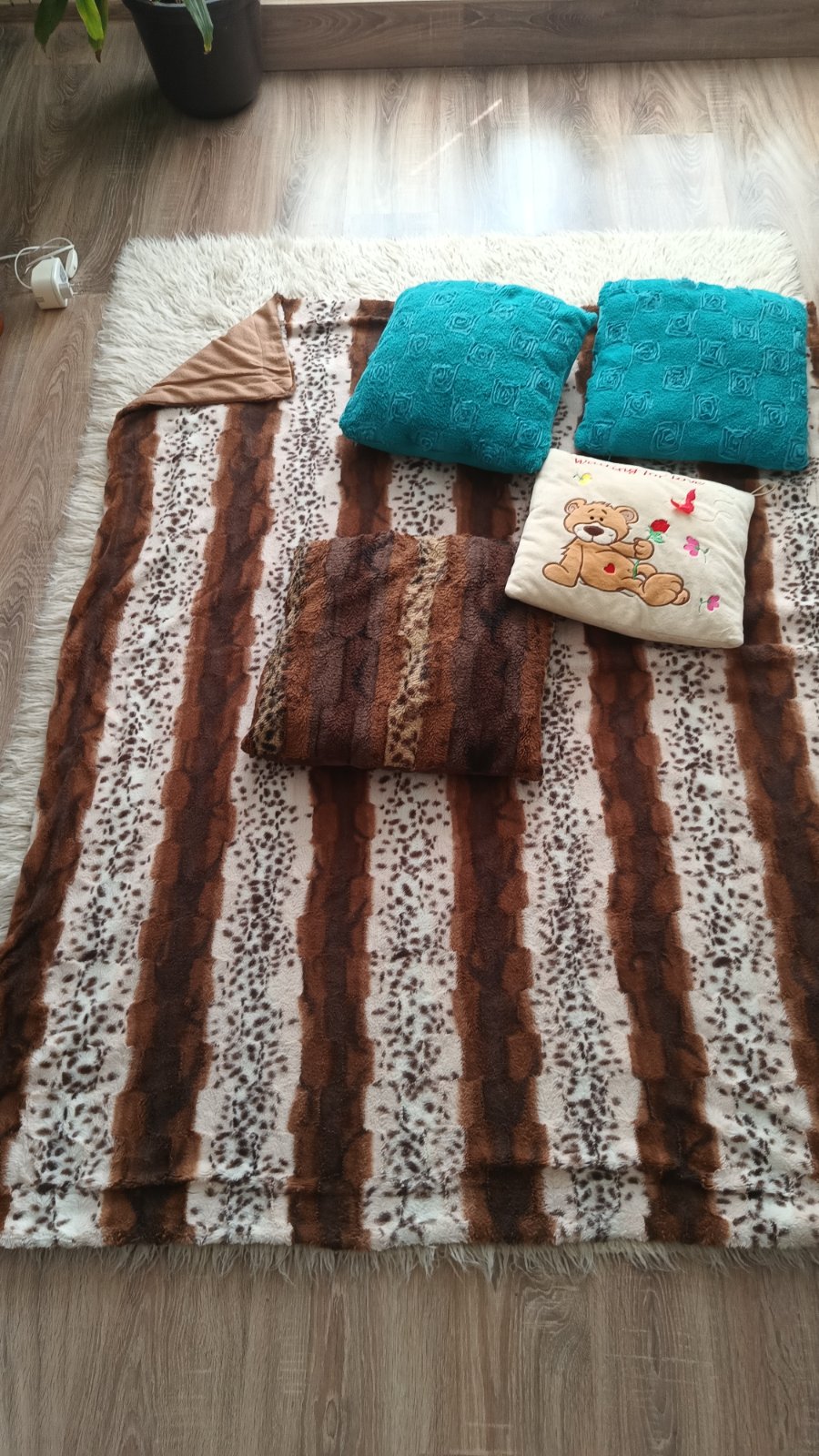 Predám malo používaný príjemný prehoz/deku deku s motívom umelej kožušiny a sadu vankúšov. Ideálny doplnok na zútulnenie obývačky alebo spálne.
