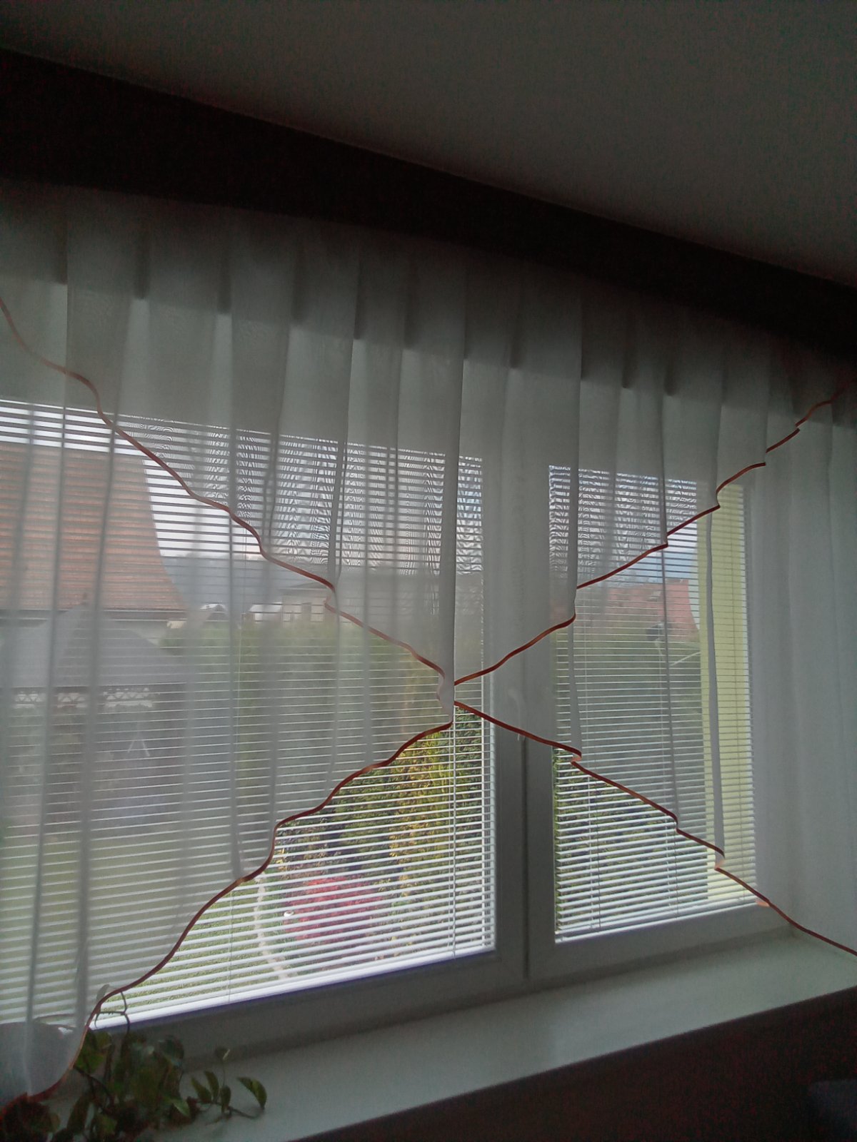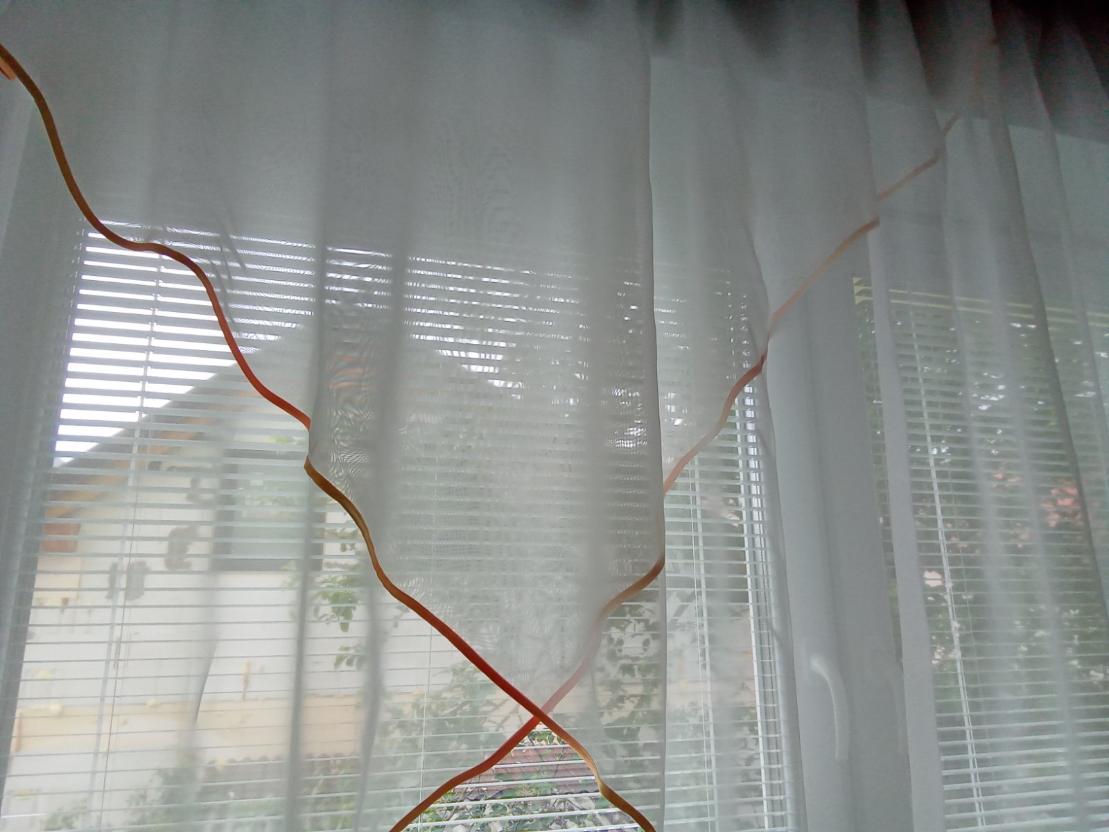 Záclona s lemom, rozmer dĺžka 400cm,výška na bokoch 185cm,v najužšom 0,90cm,stužka dúhová,od žltej do oranžova - záclona šitá u krajčírky