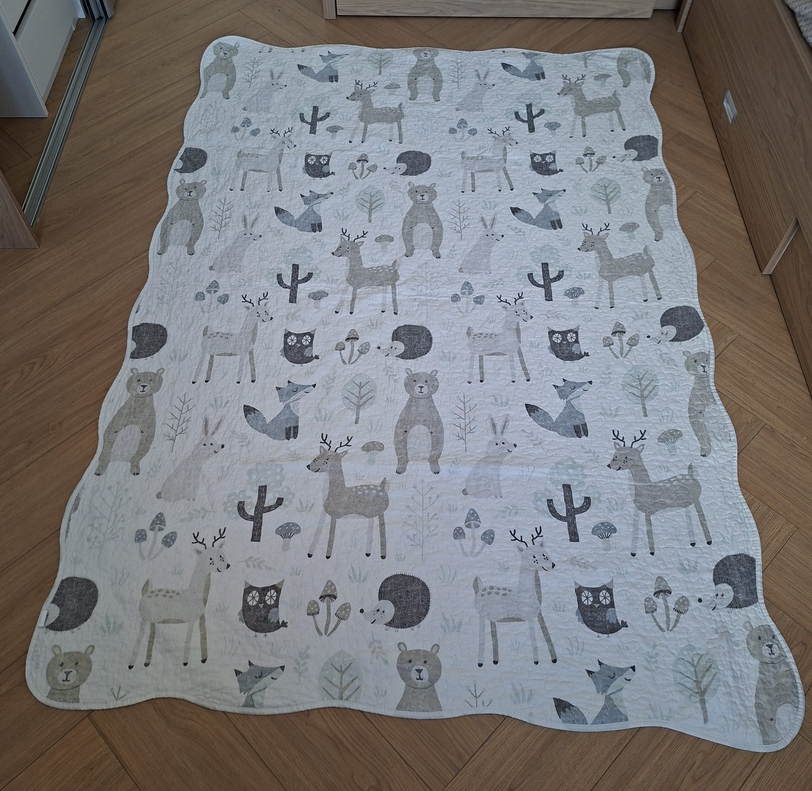 Detský prehoz na posteľ Nordic friends vo veľmi dobrom používanom stave (bez dierok, fliačikov a žmolkov; sem-tam trčiaca nitka). Prehoz chráni detskú posteľ pred prachom a nečistotami; je využiteľný aj ako deka či podložka na hranie. Už na prvý pohľad zaujme motívom lesných zvieratiek v jemných pastelových farbách.