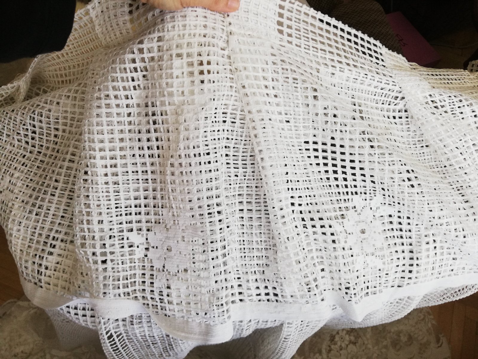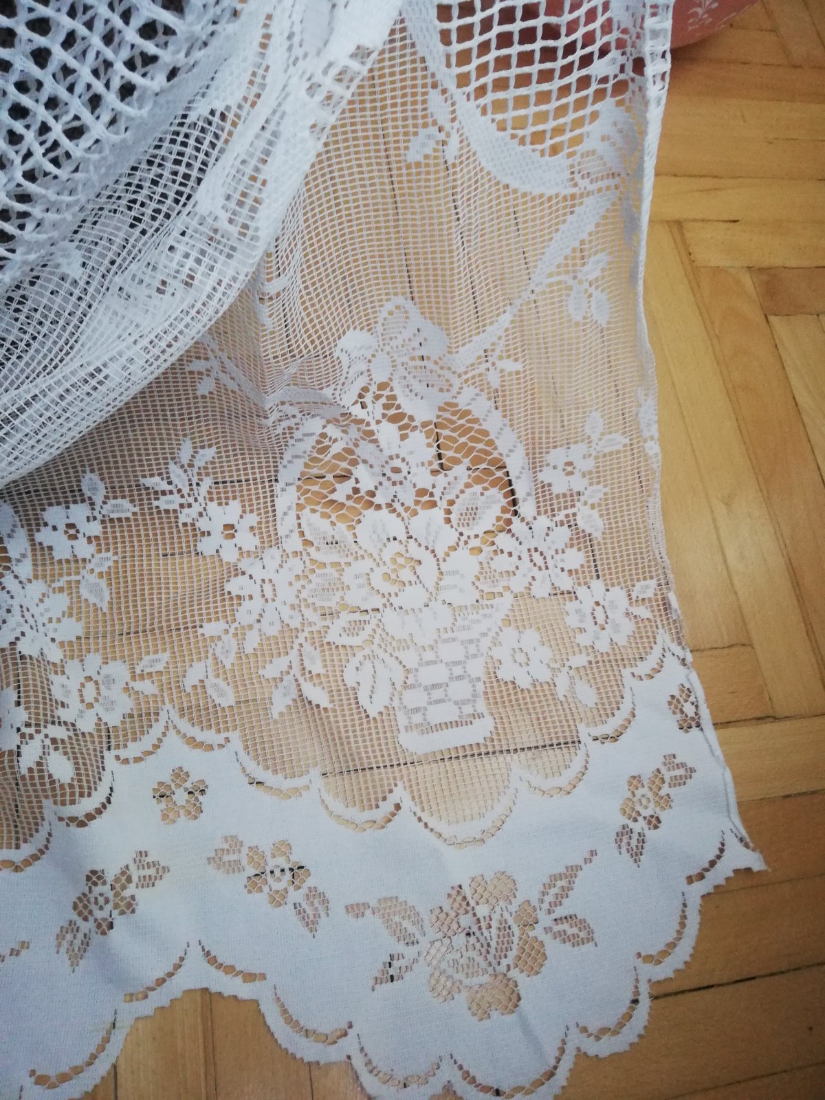 Predam peknu zaclonu s motivom kvetov v kosiku. Je starsia, uz nie ako nova, ale stale pekna. Hore je fodricka. Rozmery: sirka dole cca 3,3m sirka hore pri siti 2,4m, vyska cca 1,4m.