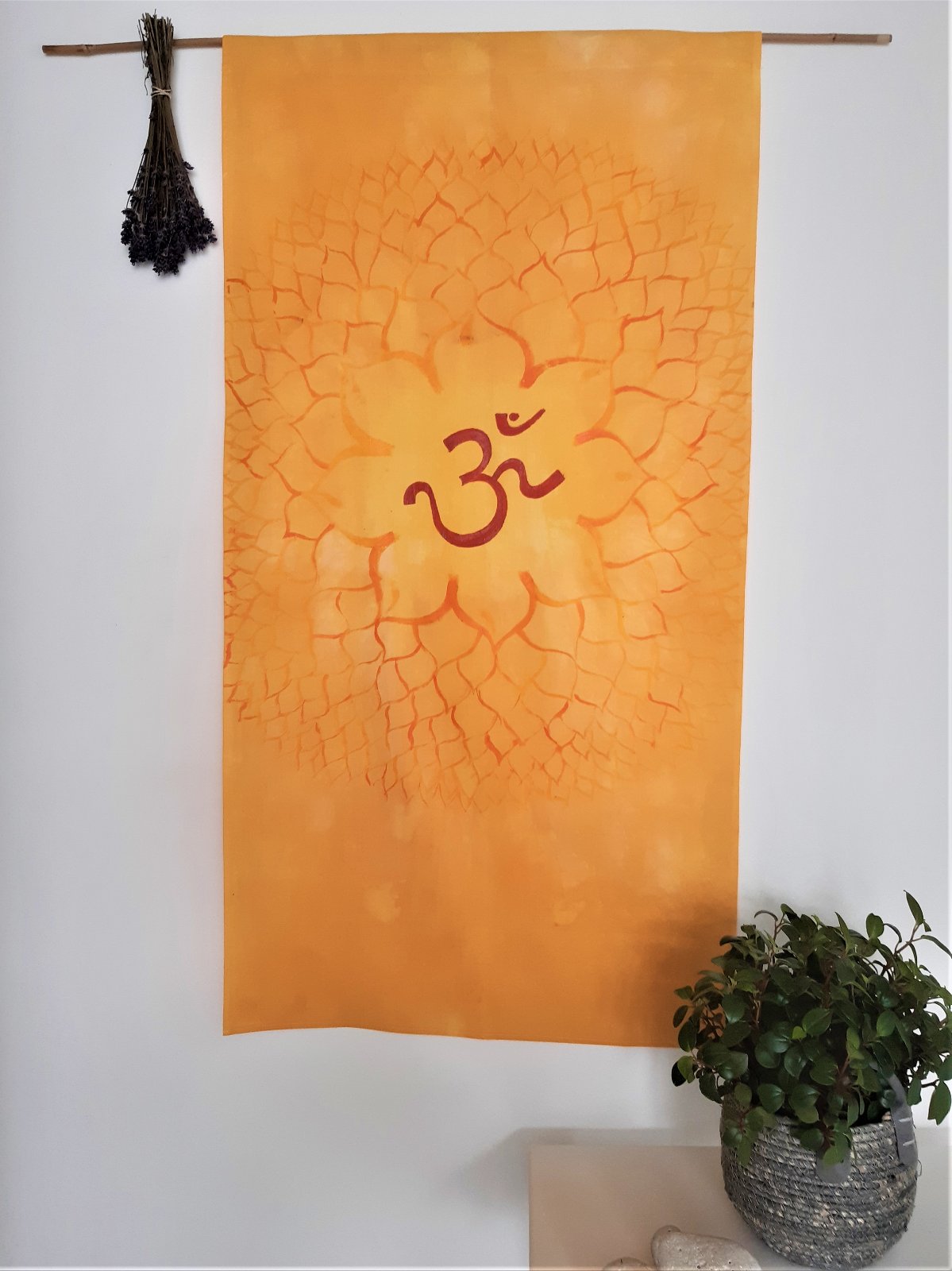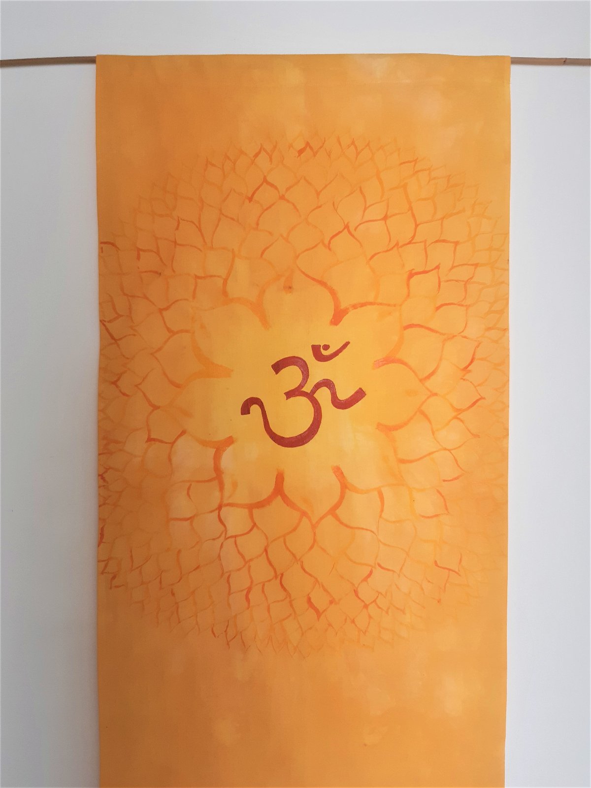Textilný záves na meditačné miesto, alebo len tak do bytu. Ručne farbený a maľovaný, lotosový kvet a znak "óm". Veľmi žiarivý a pozitívny. Bez bambusovej tyčky (dá sa tam vložiť akákoľvek palička.) Rozmer 57x110 cm