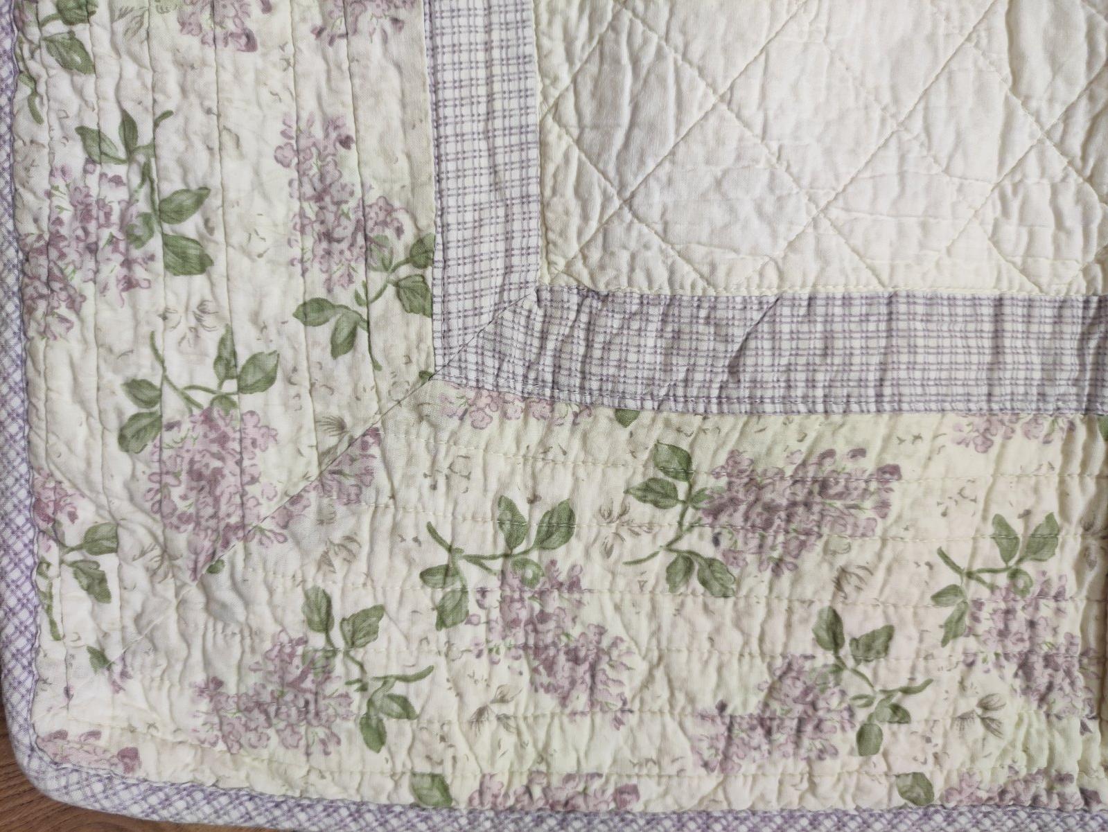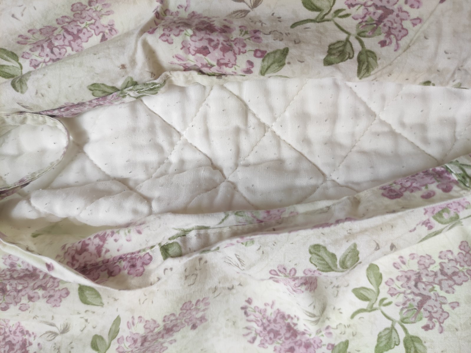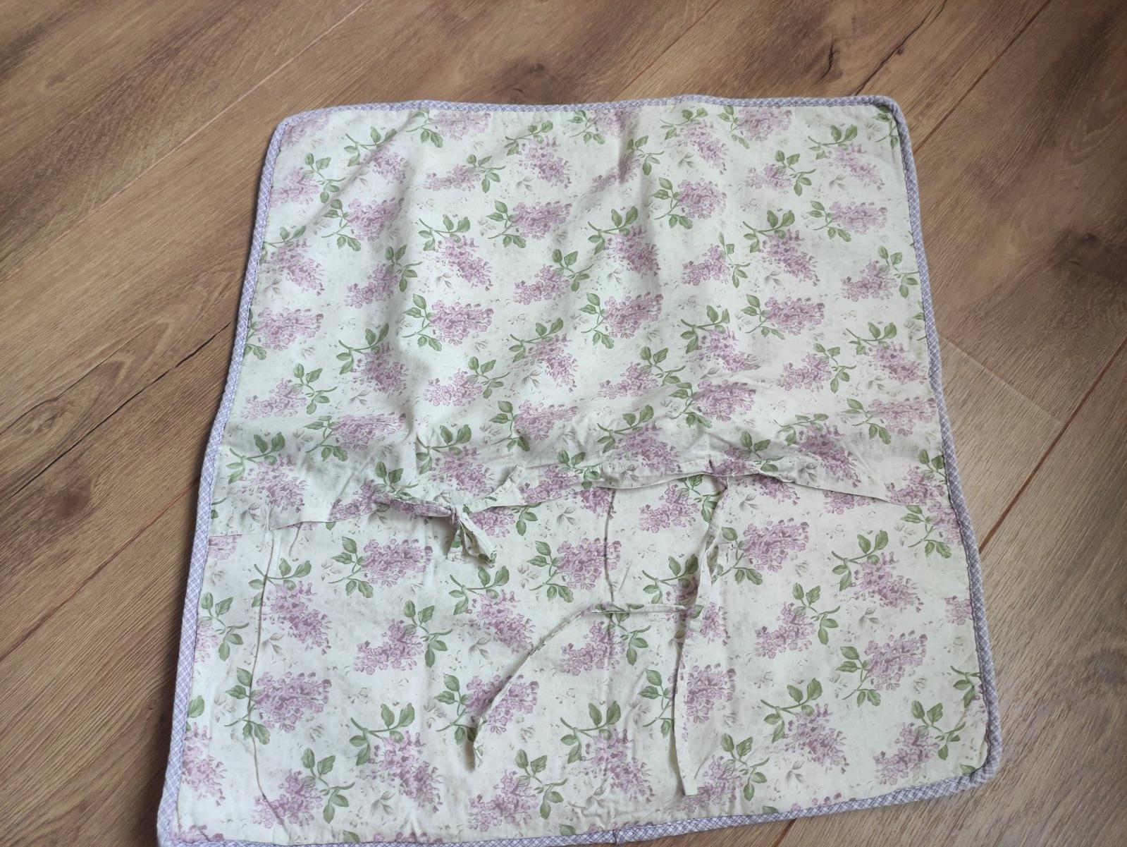 Obliecky su vyrobene z bavlnenej latky, so vzorom patchwork, v kremovej farbe s fialovymi orgovanmi. Maju zapinanie na snurky.
