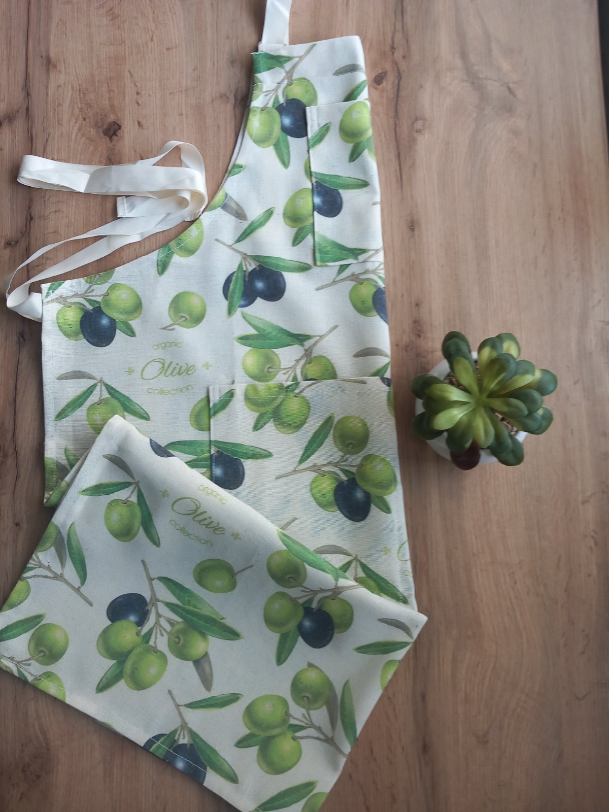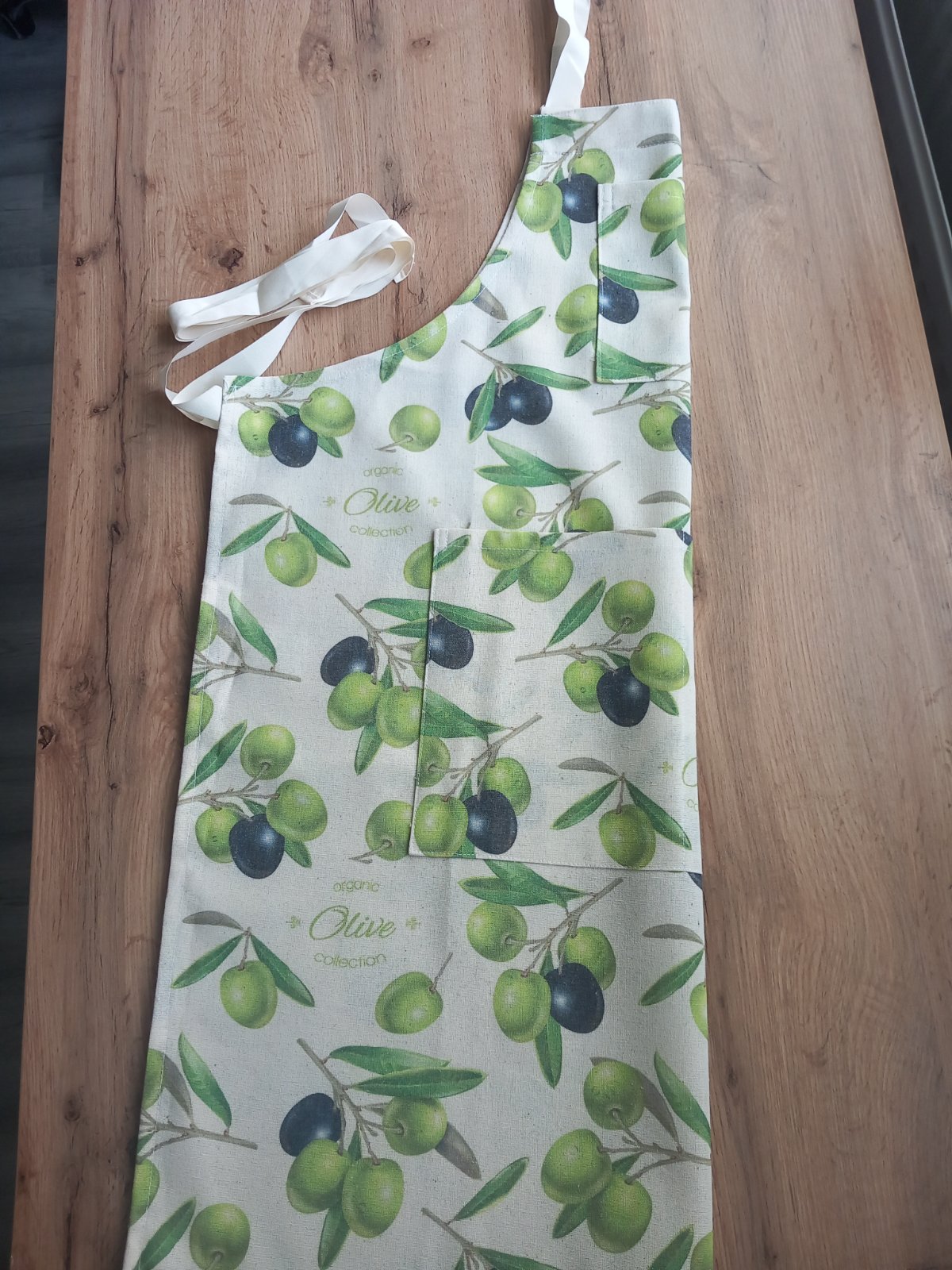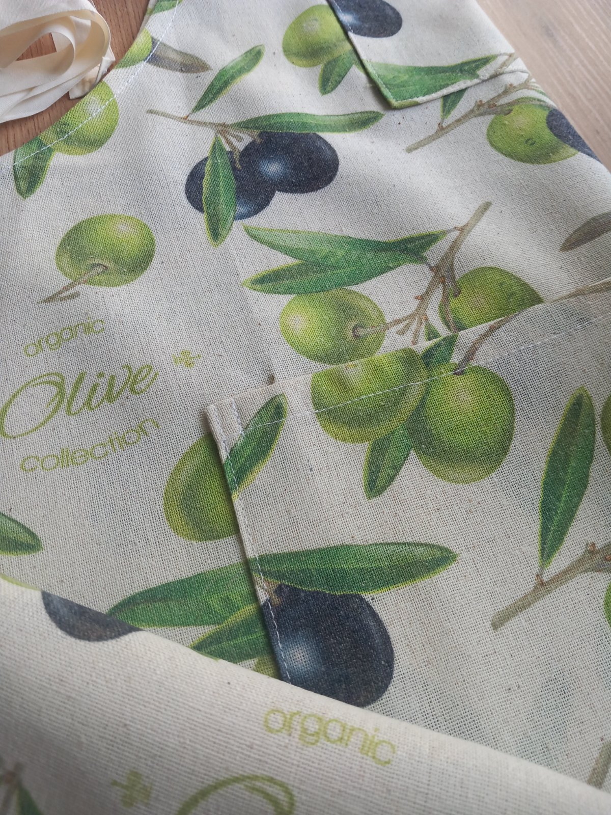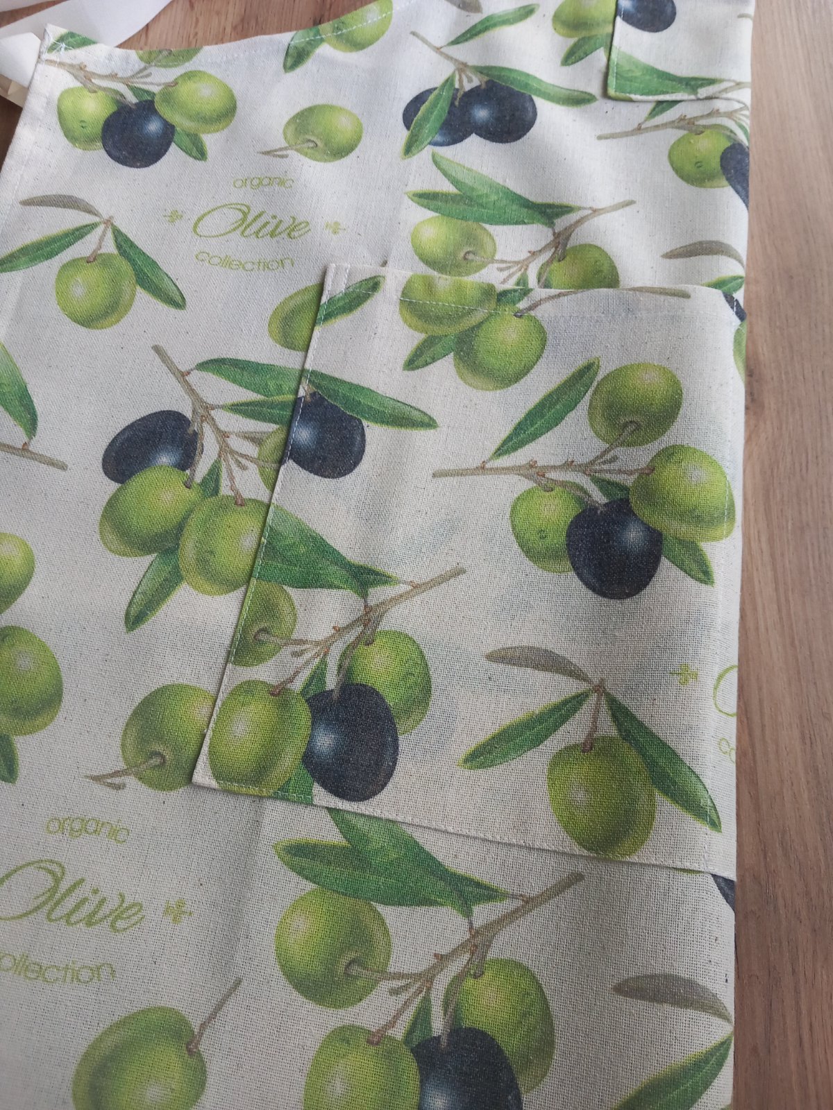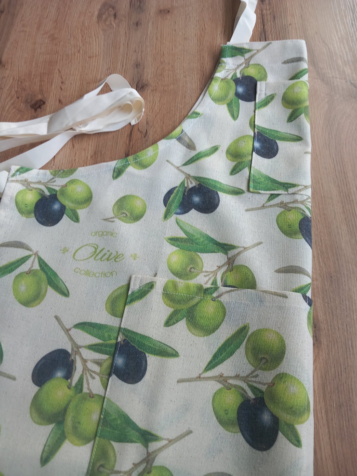 Zástera cez krk bežová so vzorom olivy s jedným vreckom a predným prsným vreckom -materiál je ľan dekoračny 90% ľan a 10 %polyester