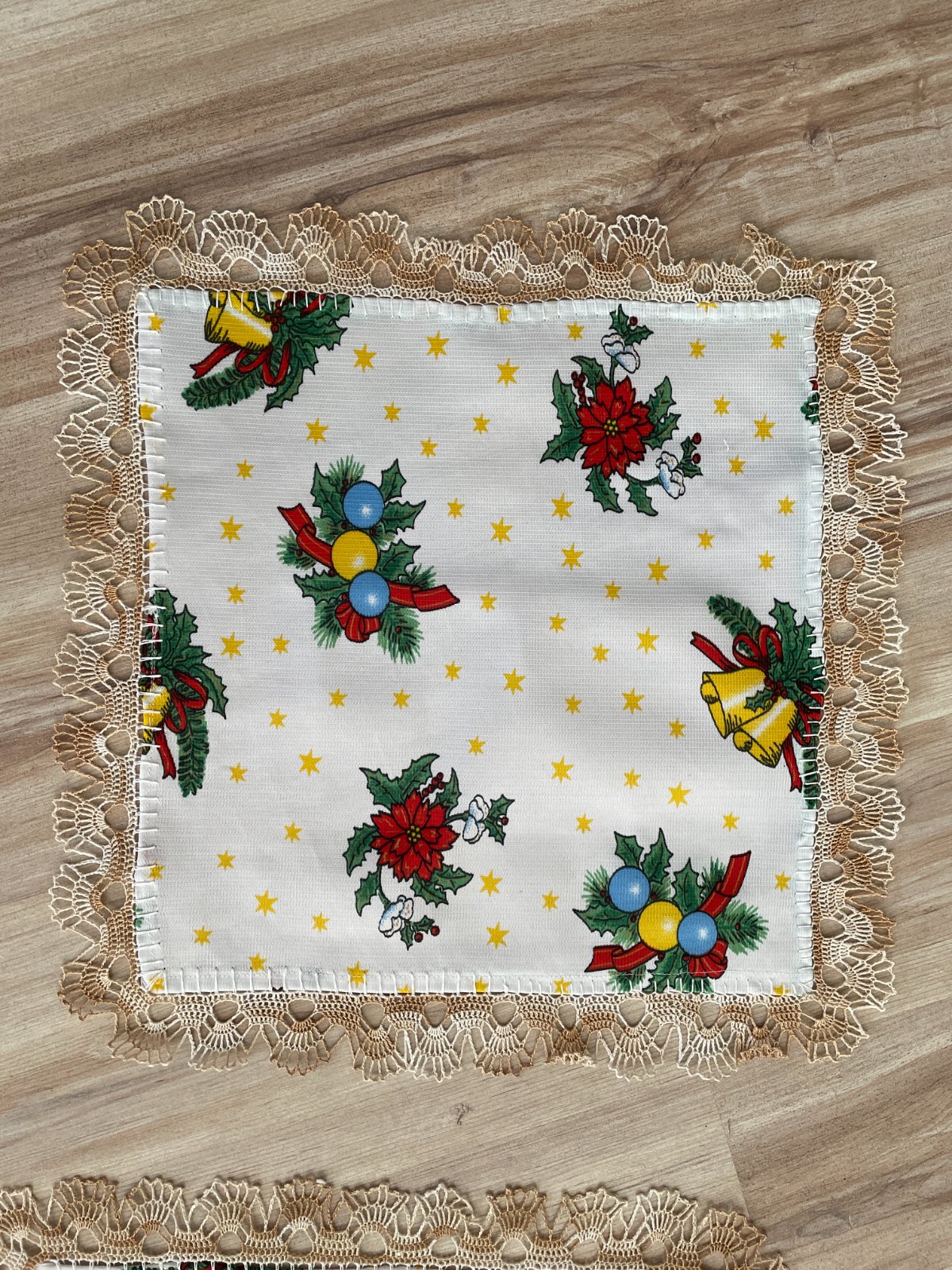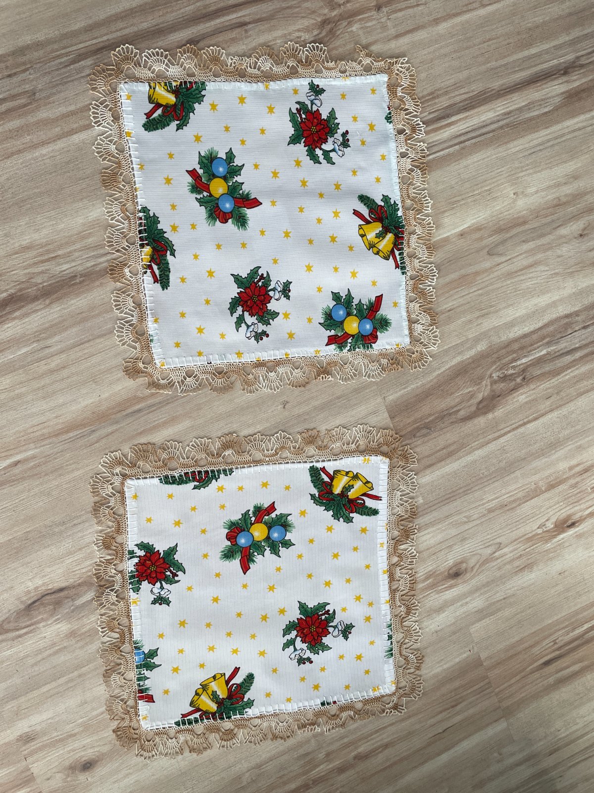 Dečka s krémovým melírovaným hačkovaným lemom(4cm), rozmer 45x45cm. Mám 2 kusy, každá za 2€, spolu za 3€. Poštovné podľa cenníka pošty.