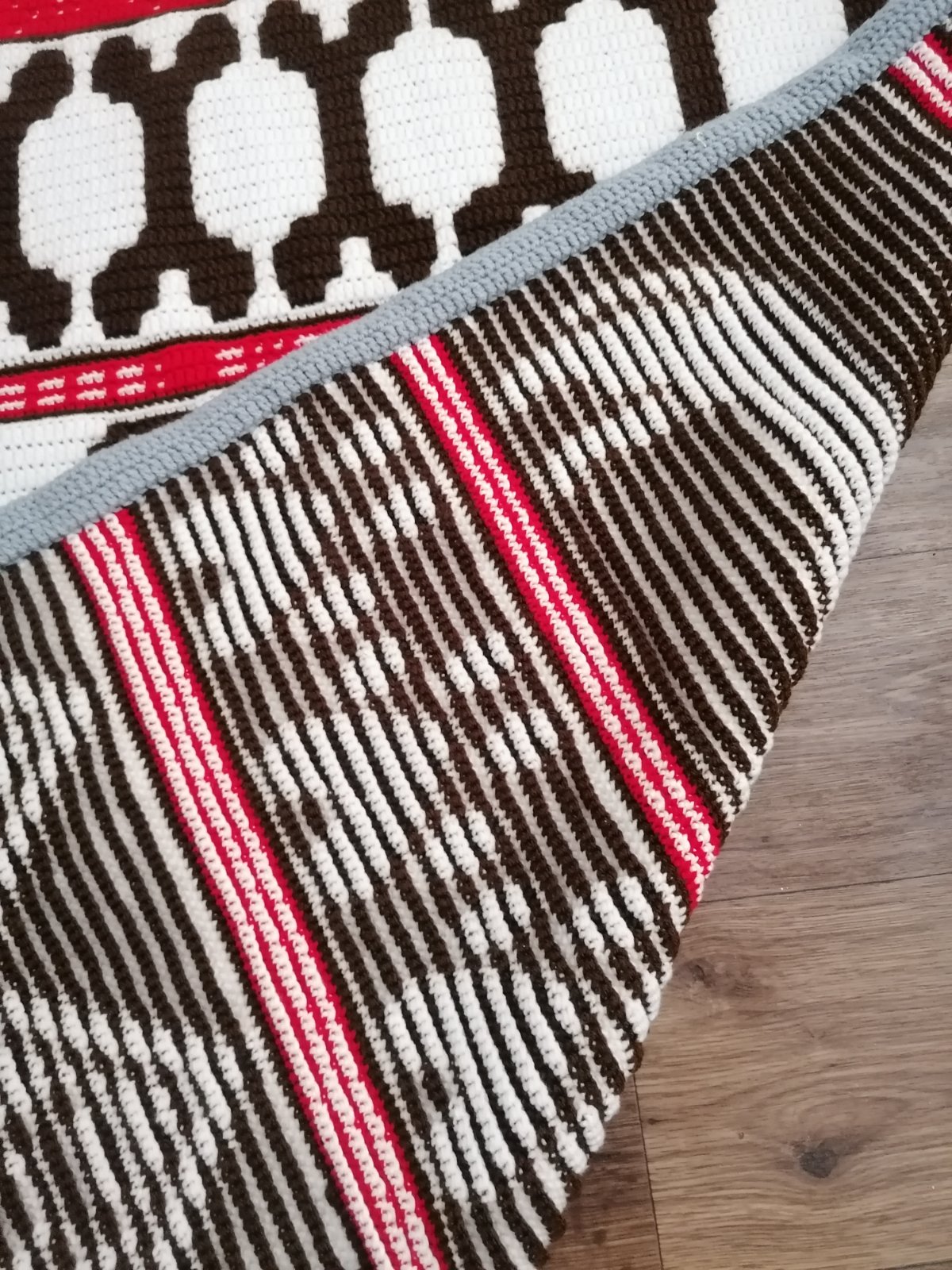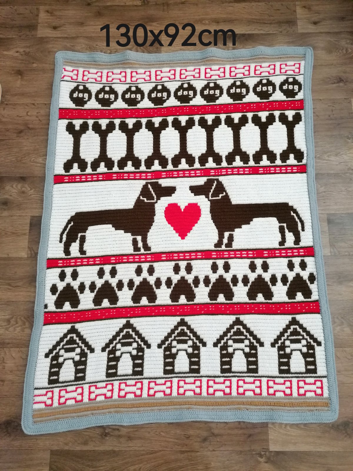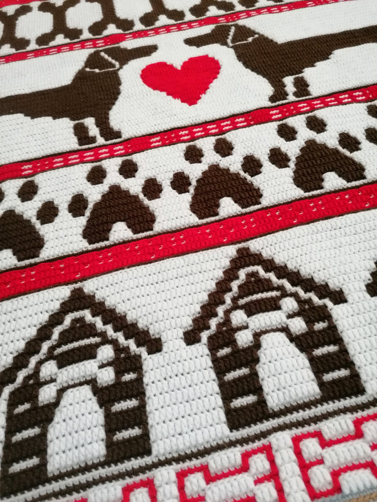 Mäkká háčkovana deka nielen pre milovníkov psov. V červených pruhoch je ukrytý kód v brailovom písme a morzeovke