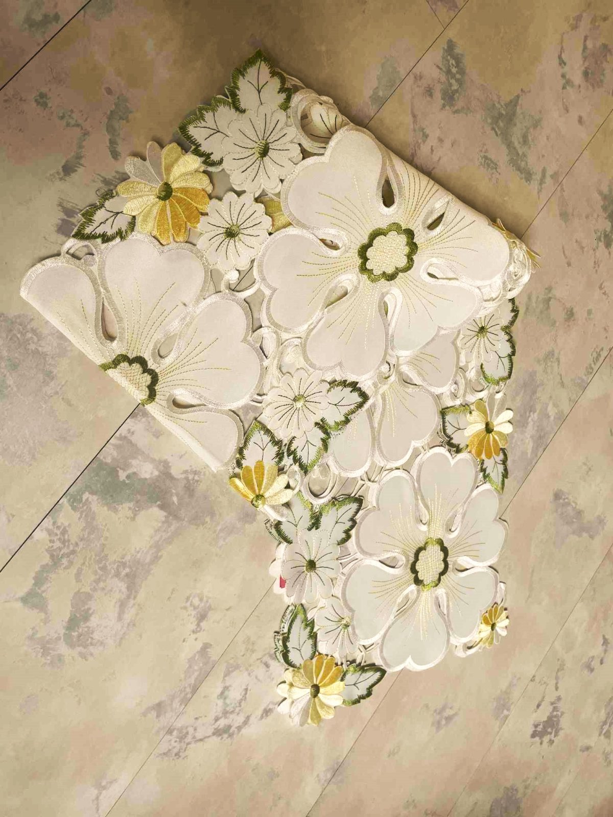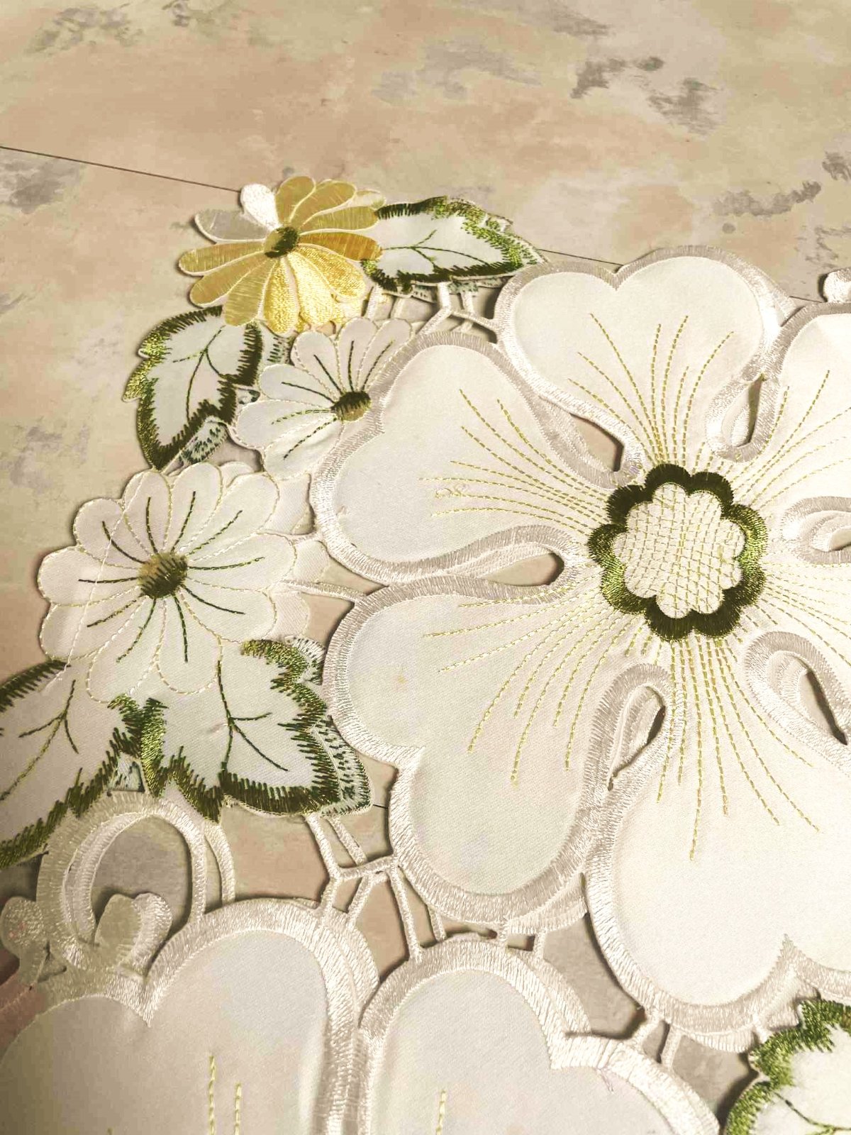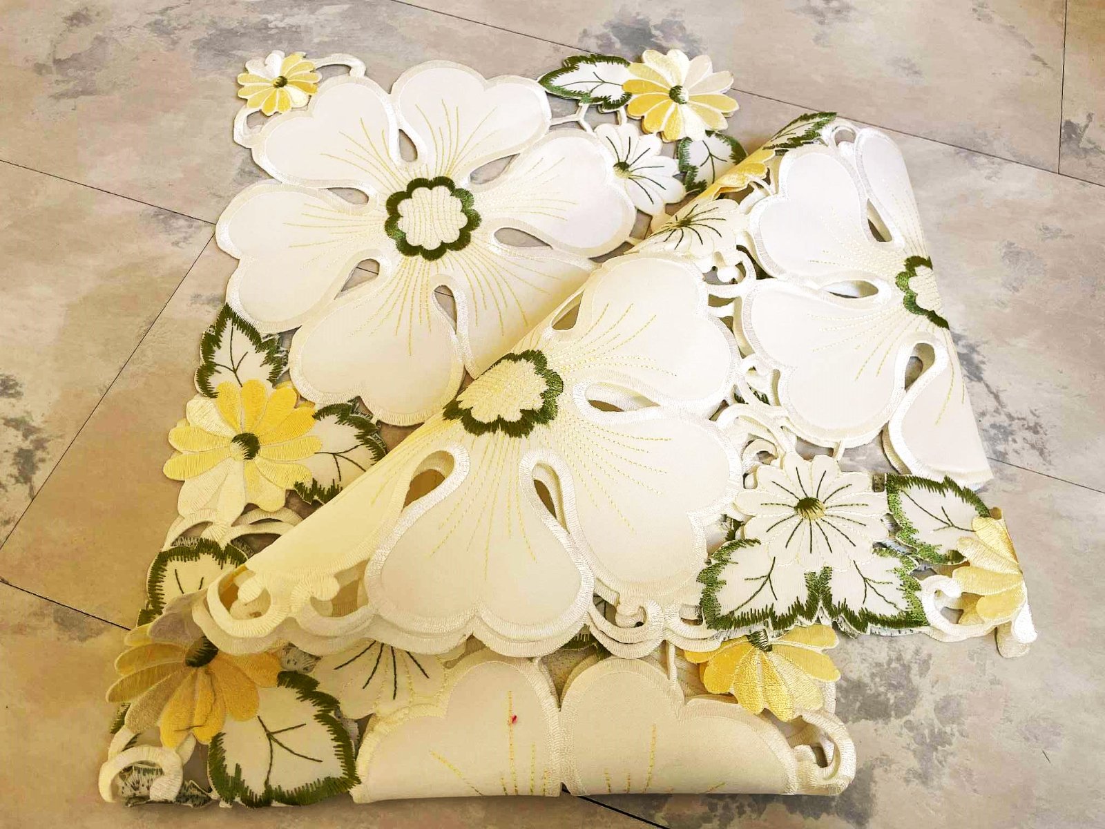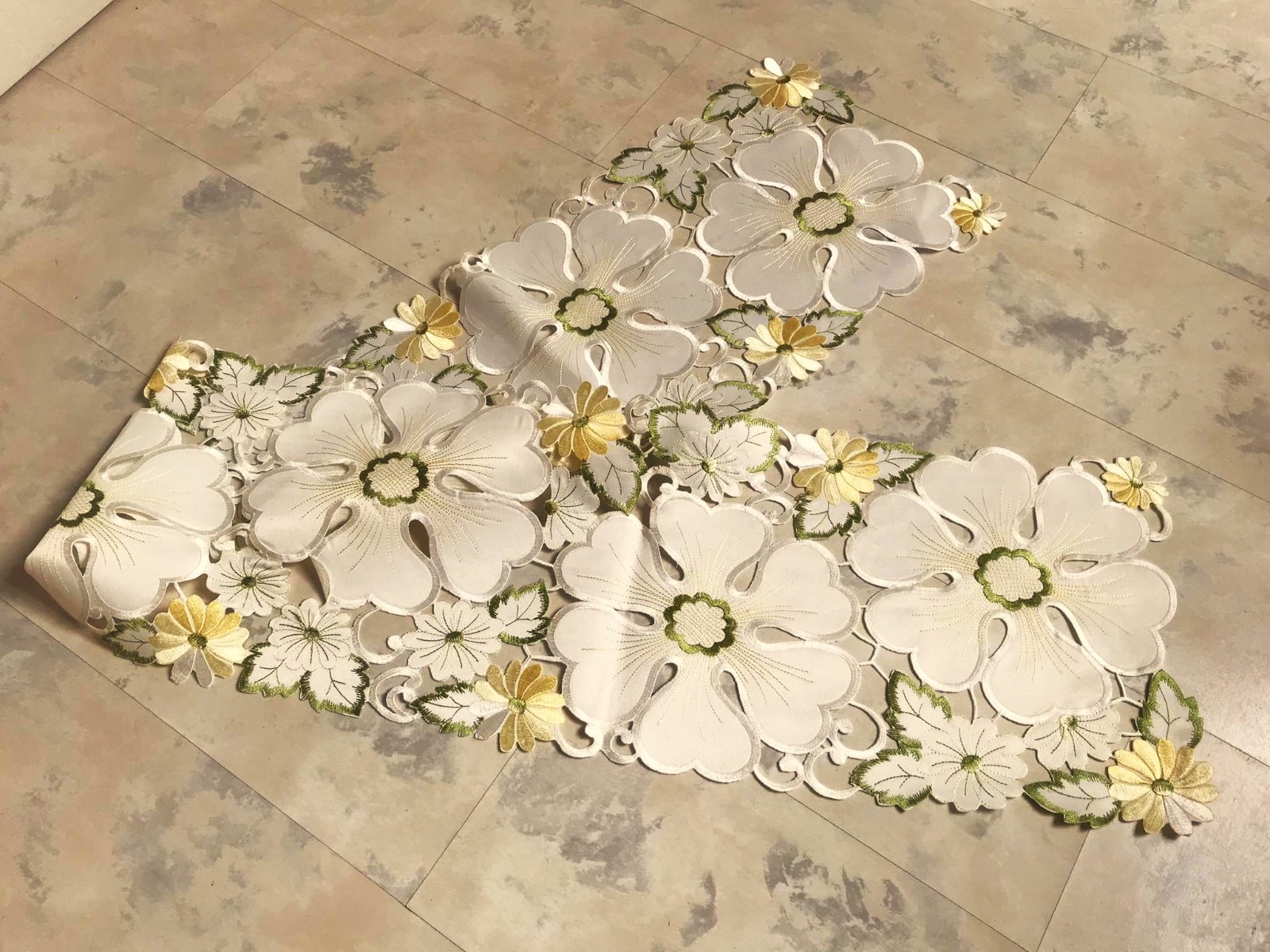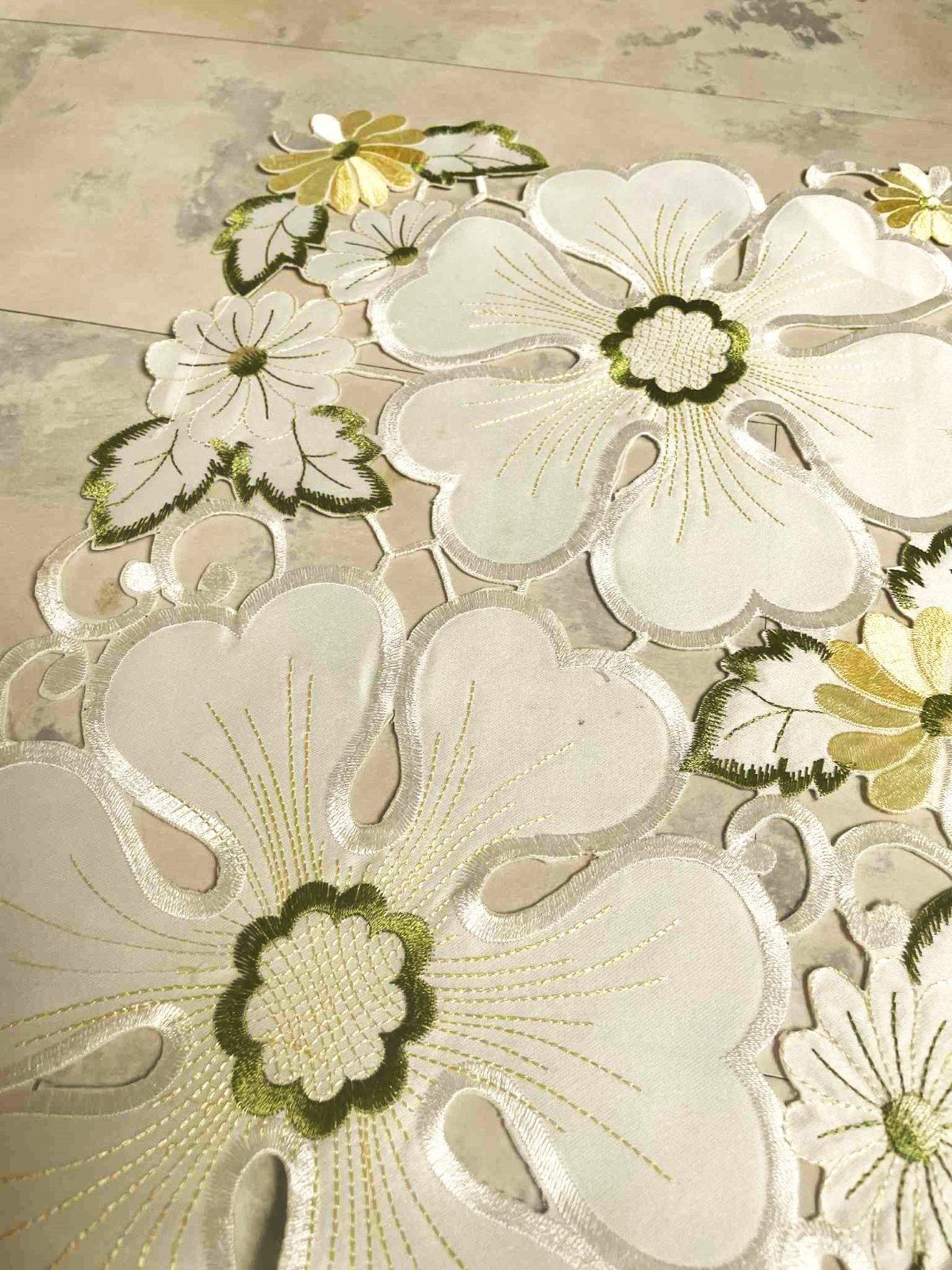 vysokokvalitný luxusný obrus - štóla, rozmer : 164 cm x 28 cm,raz prestretý,top stav - ako nový,krásne vykrajované vyšívané moderné vzory - technikou richelieu,kvalitne vypracovaný,perfektný materiál,vyšívané jemnou lesklou saténovou priadzou,značka vyfotená