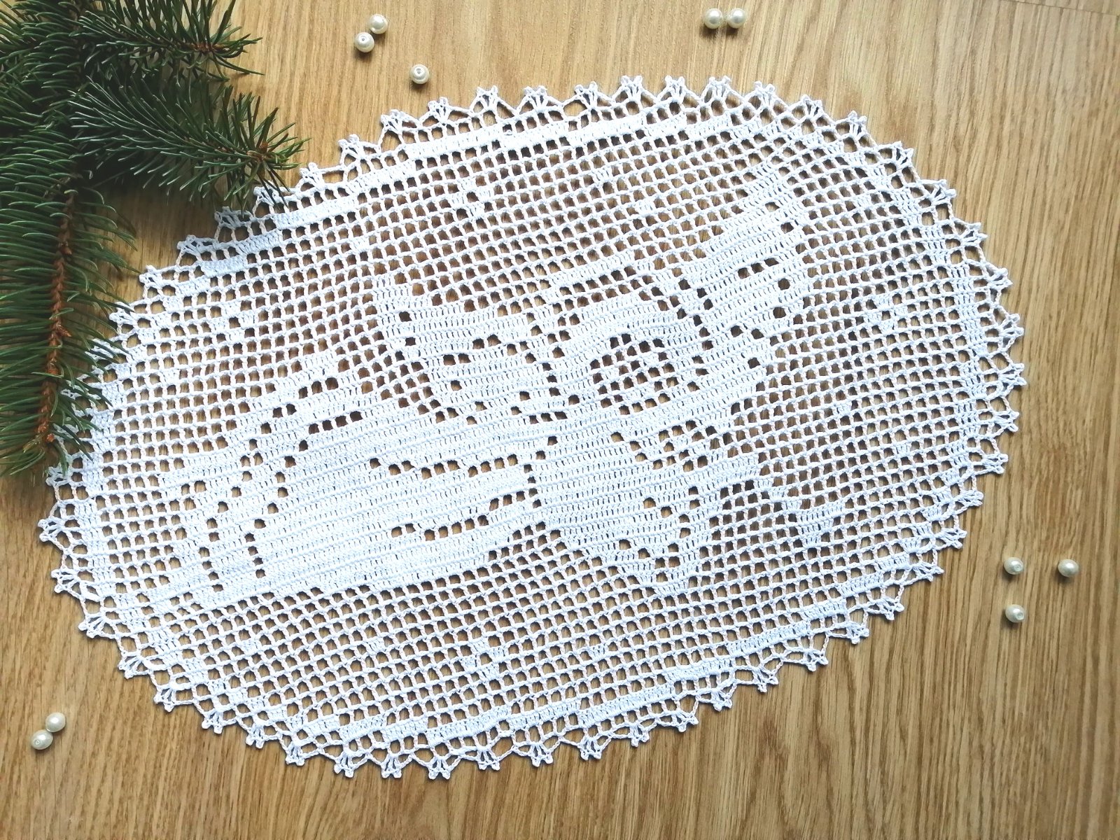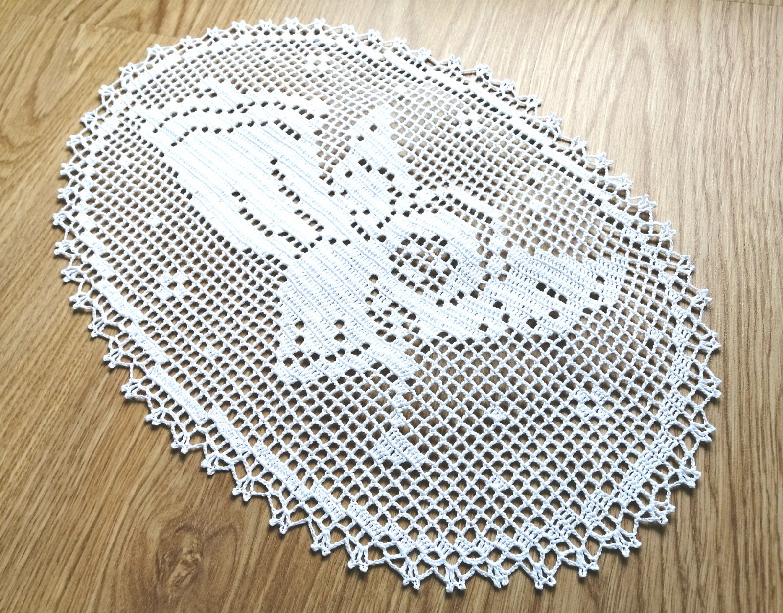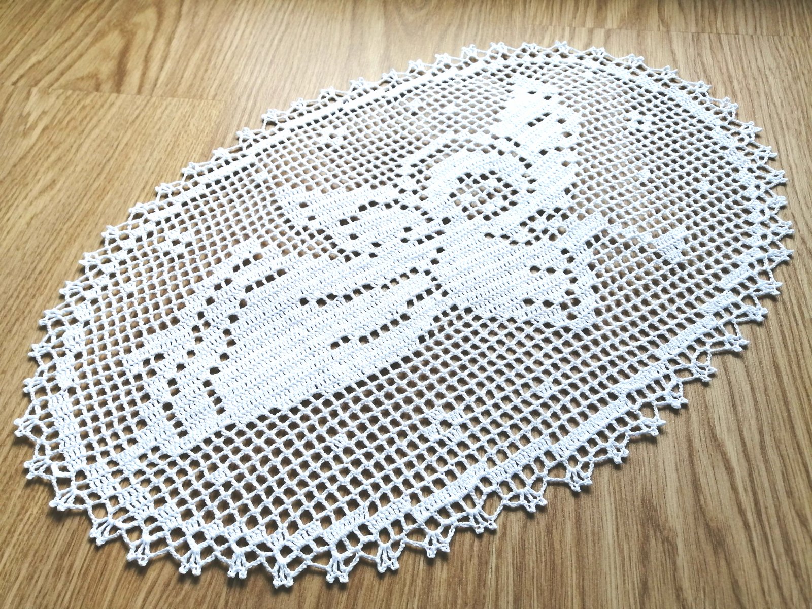 Použitá bola bavlnená háčkovacia priadza, dečka je škrobená a sušená bola vypnutá na špendlíkoch.