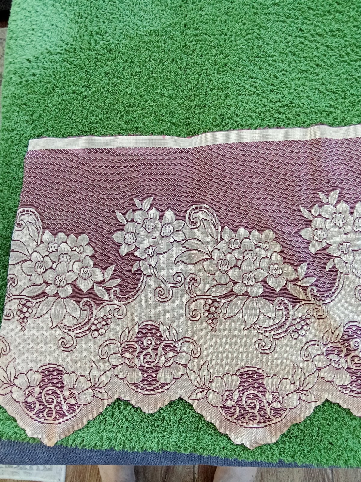 Záclona je časť nastrihaná 2x95cm, 2x 190cm, 2x113 CM, 1x346 CM, výška 45 CM. Bola asi 1x na okne, je ako nová, druhá farba je vinovo červená.