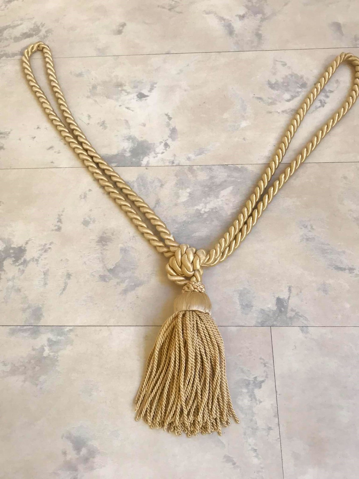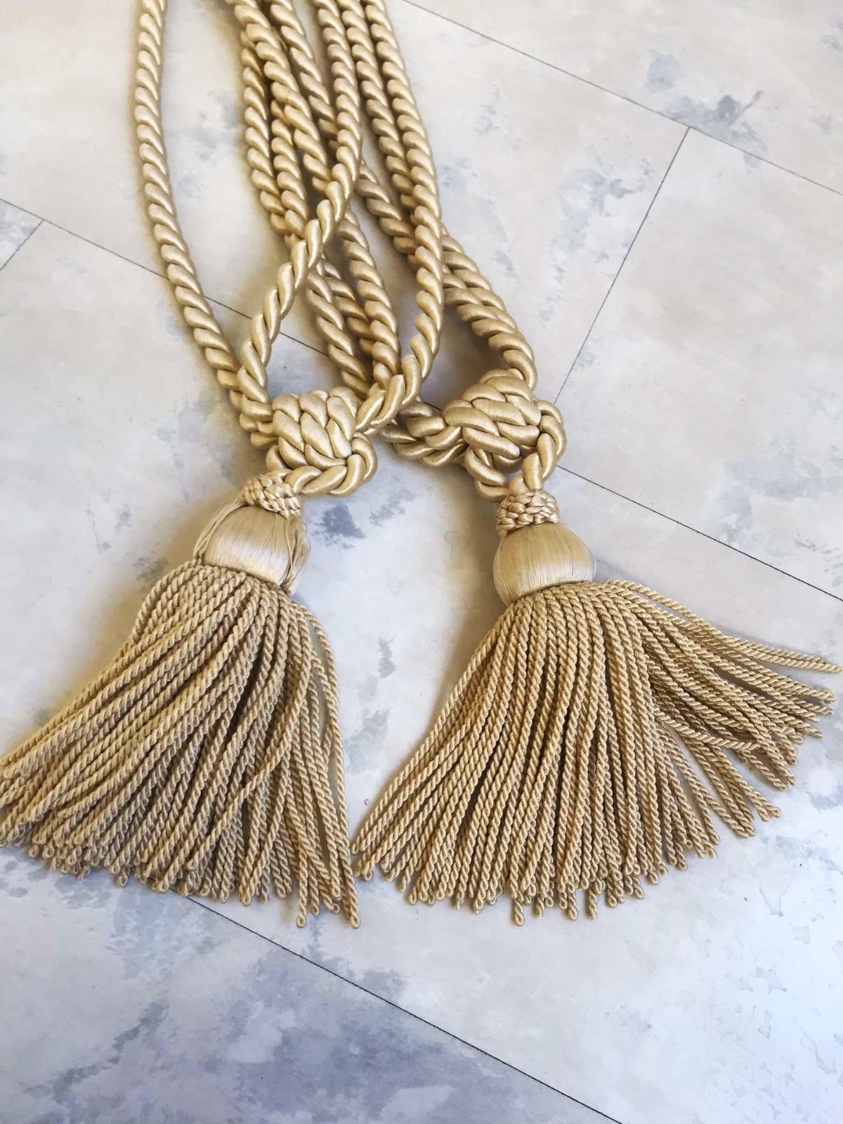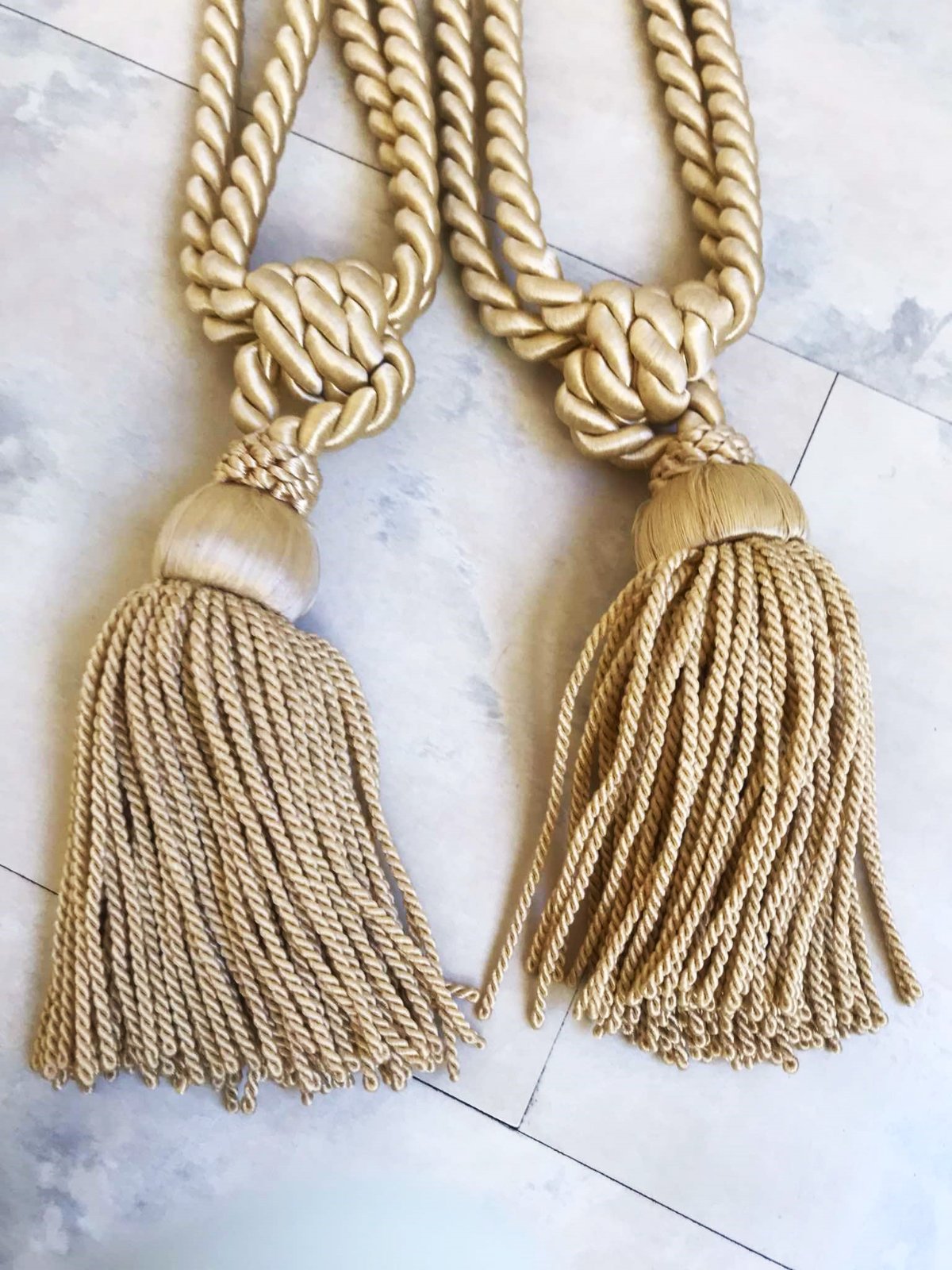 mohutné krásne strapce na záves/záclonu,na uväzovanie,v saténovej farbe champagne, béžová s odleskom do zlatej,na 1 je vzadu jemne prešúchaný - ale nie je to vidieť,ale upozorňujem / posl. foto /, inak bez chýb