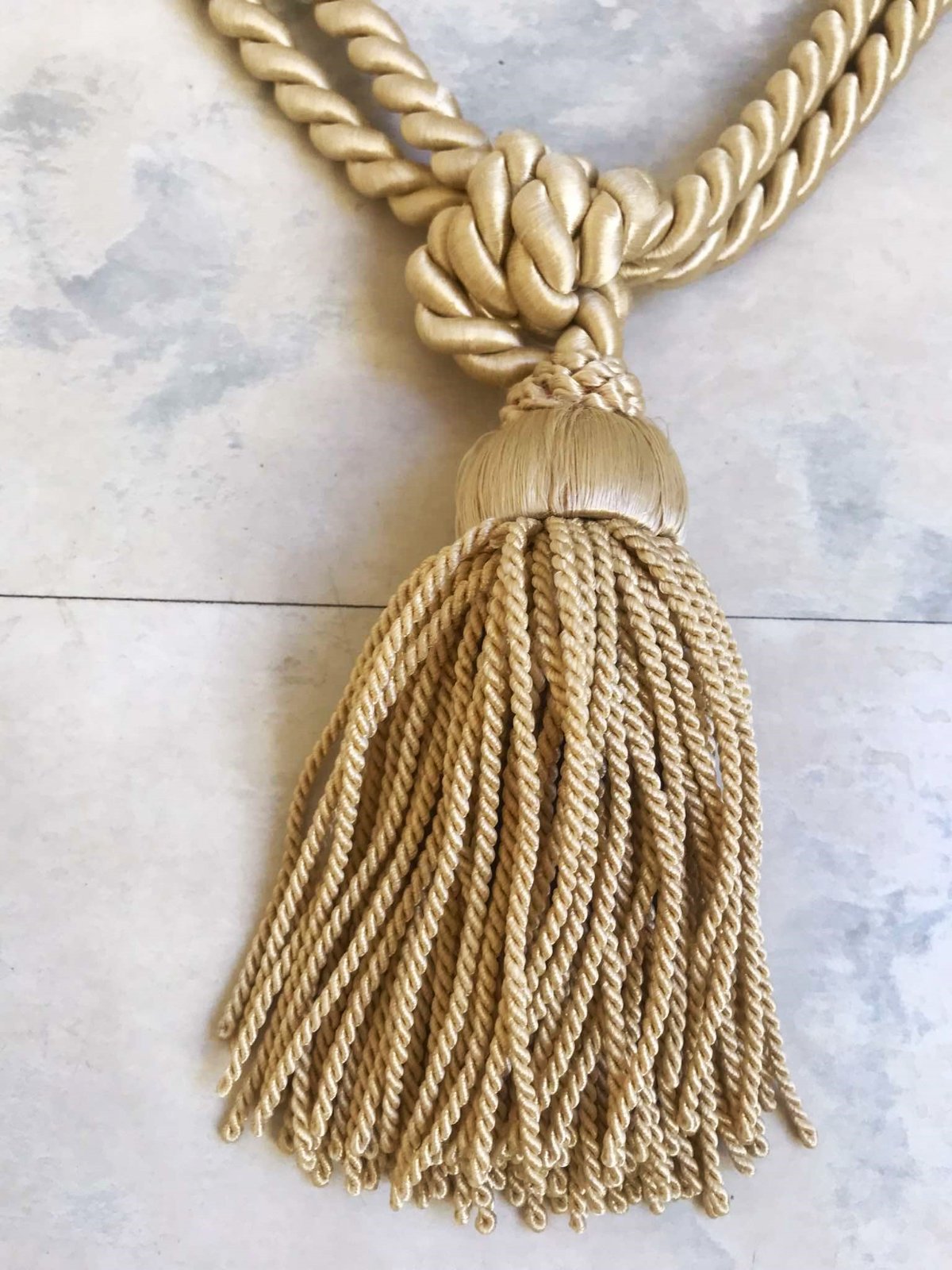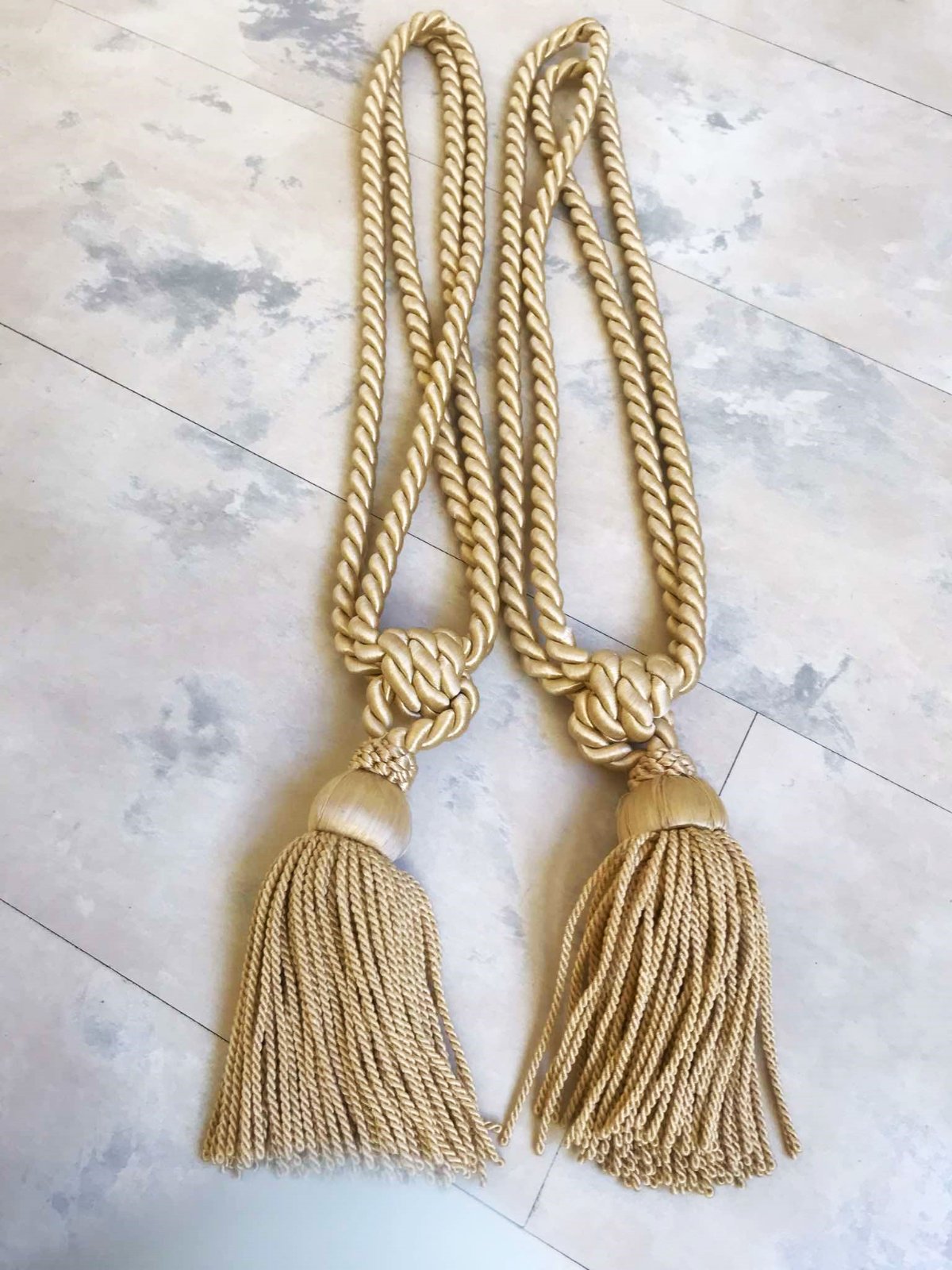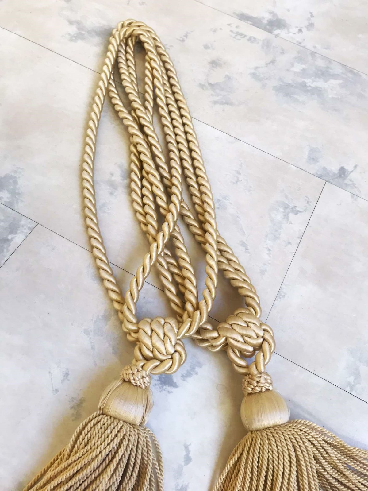 mohutné krásne strapce na záves/záclonu,na uväzovanie,v saténovej farbe champagne, béžová s odleskom do zlatej,na 1 je vzadu jemne prešúchaný - ale nie je to vidieť,ale upozorňujem / posl. foto /, inak bez chýb