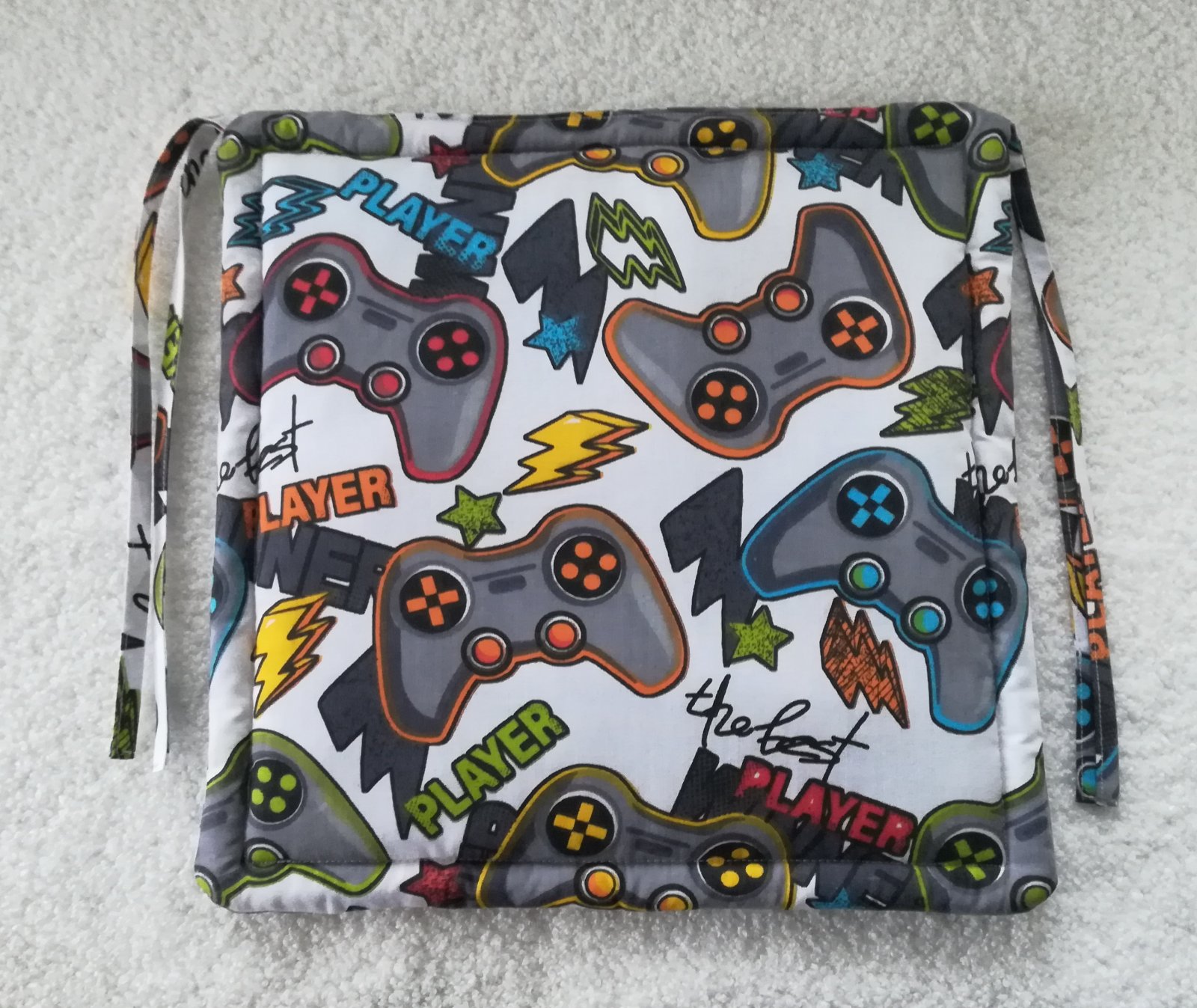 SkladomPodsedák/ vankúšik/ poduška na detskú stoličku do školy, škôlky alebo len tak na doma s bočným viazaním. Môj vlastný handmade výrobok z mojej dielničky, tento je so vzorom konzoly na bielej.