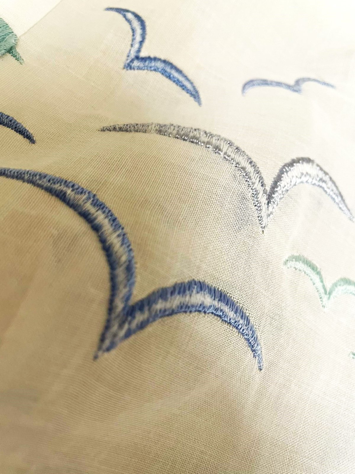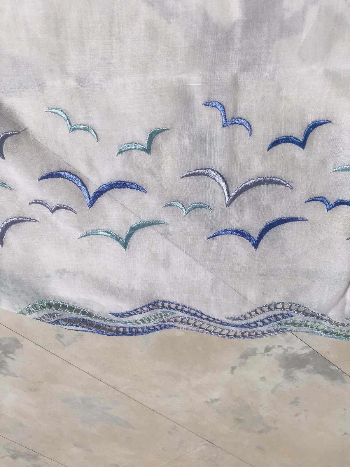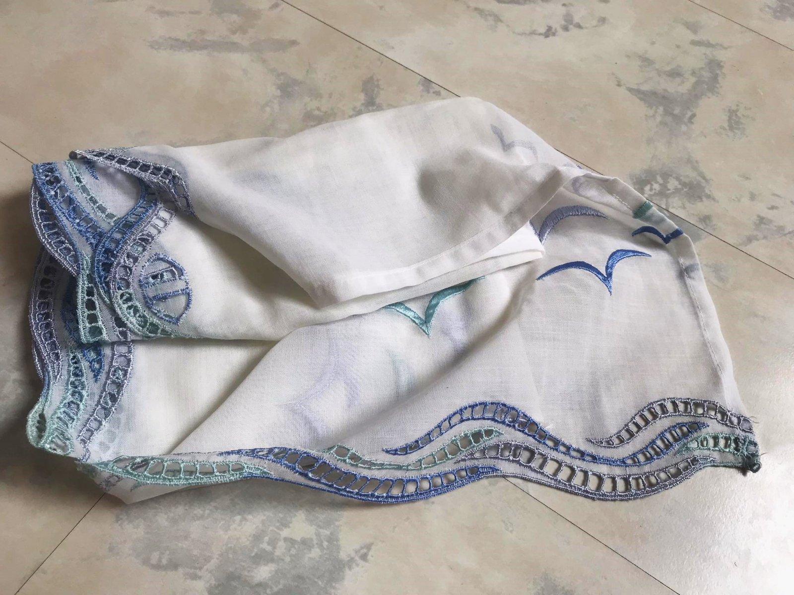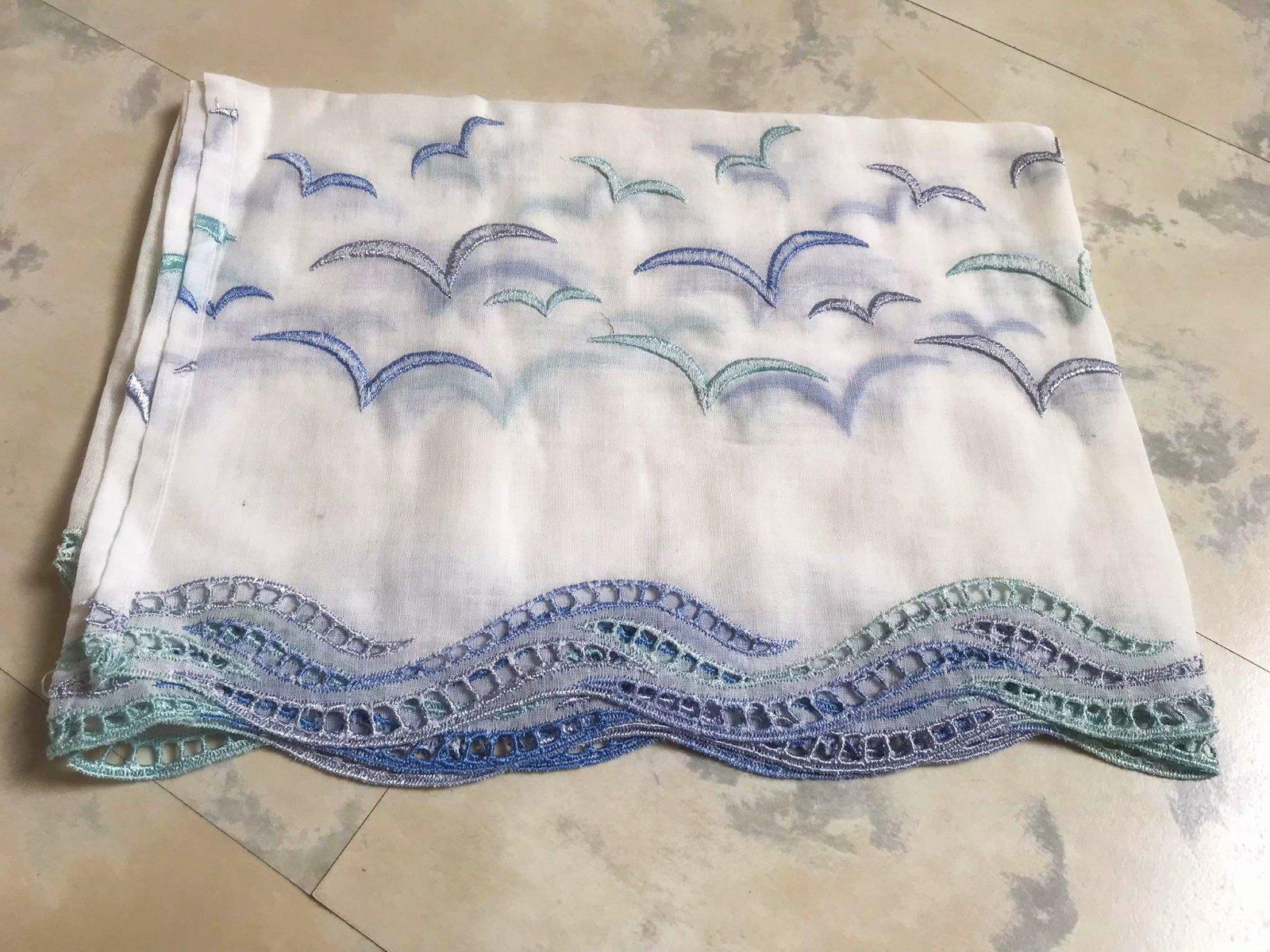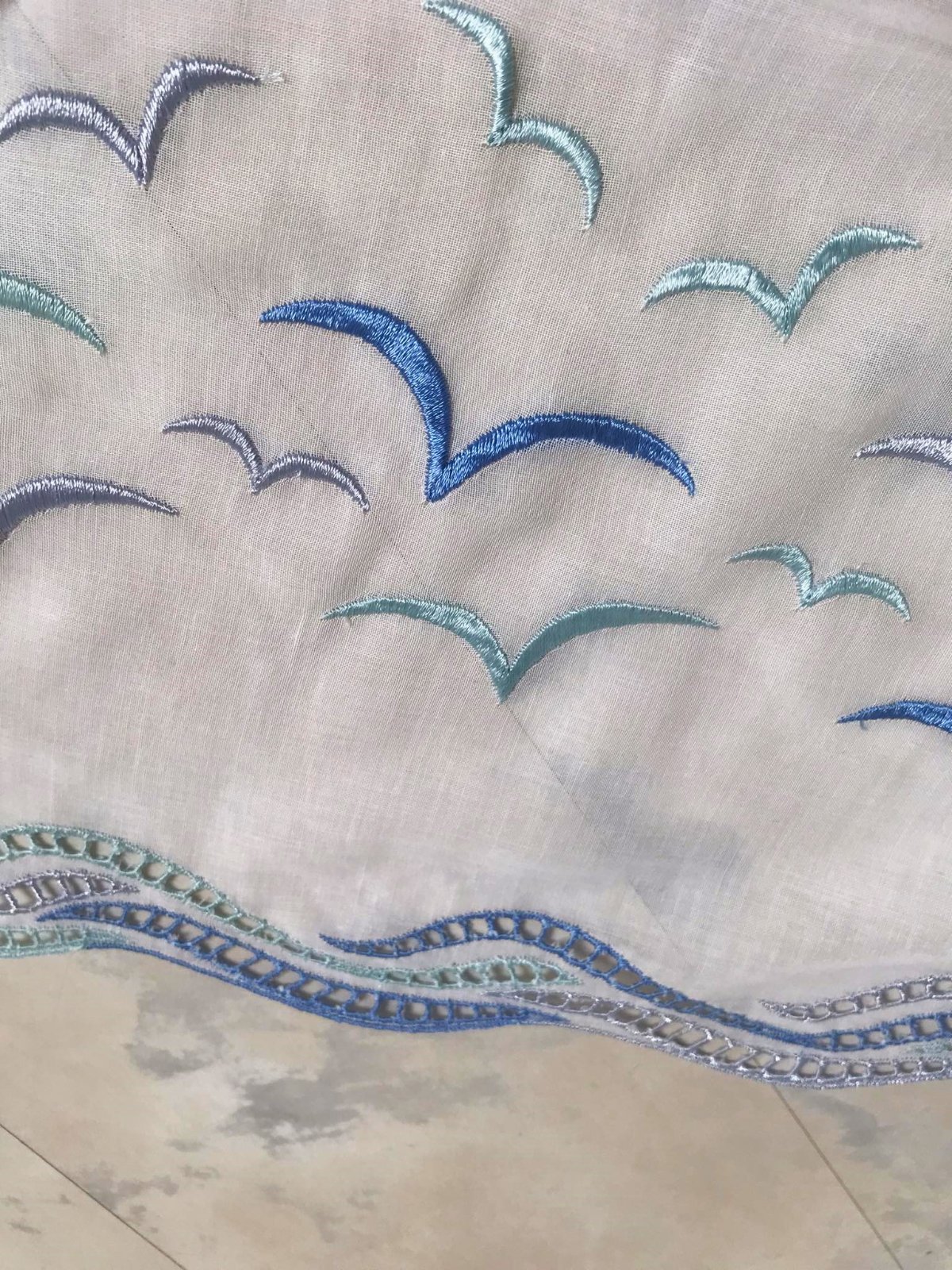krásna a romantická zvláštna záclonka - vitrážka,dá sa umiestniť v akejkoľvek časti okna,alebo aj na vrch pod garnižu,dá sa krásne nariasiť podľa potreby,jemný batist - vyšívané bledomodré čajky,na spodku krásna dierkovaná výšivka na spôsob richelie ,na vrchu dierky,krásne to vyzerá s prevlečenou saténovou stuhou alebo aj naturálnym špagátom,prípadne s obyčajnou gumičkou,top stav a kvalita