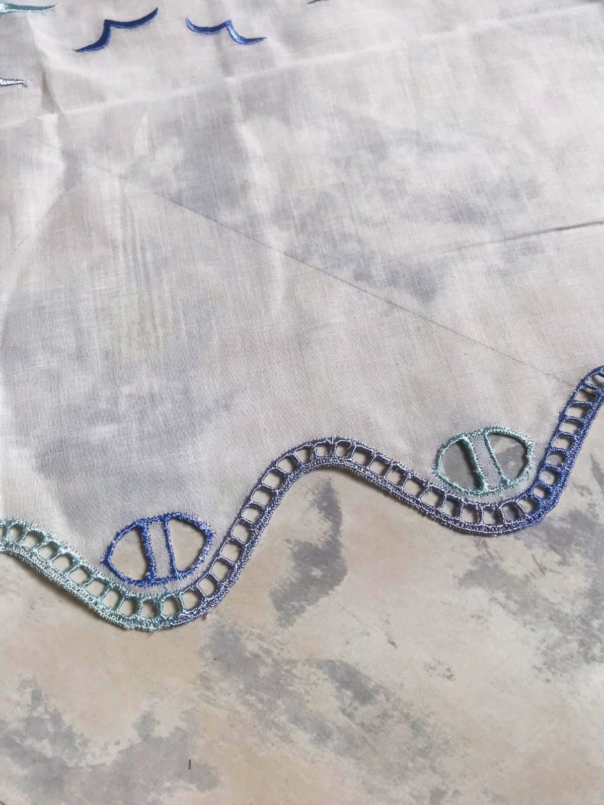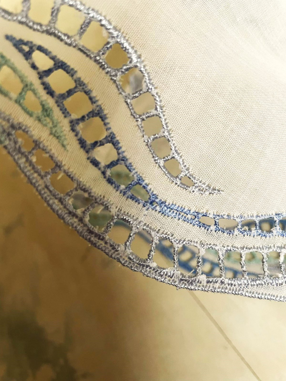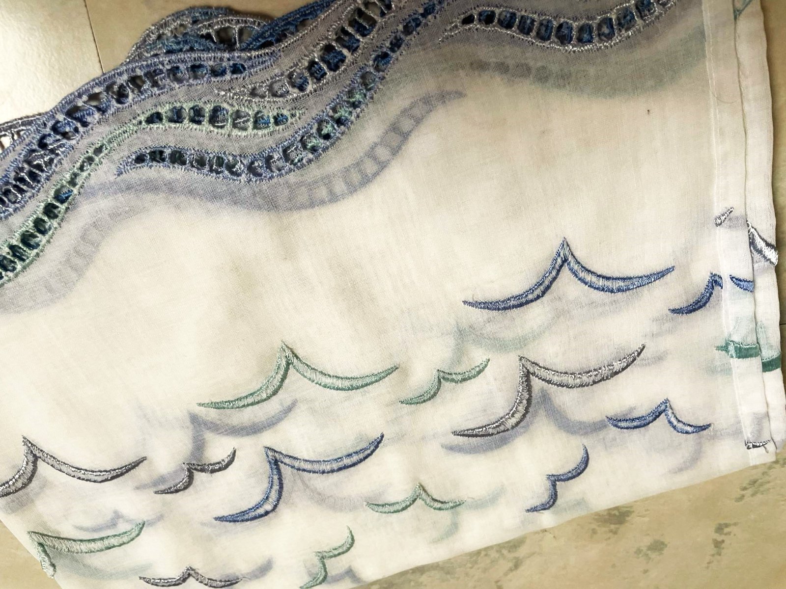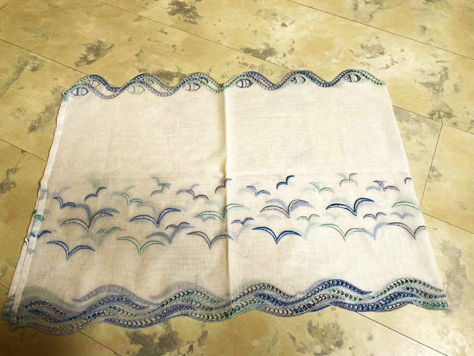 krásna a romantická zvláštna záclonka - vitrážka,dá sa umiestniť v akejkoľvek časti okna,alebo aj na vrch pod garnižu,dá sa krásne nariasiť podľa potreby,jemný batist - vyšívané bledomodré čajky,na spodku krásna dierkovaná výšivka na spôsob richelie ,na vrchu dierky,krásne to vyzerá s prevlečenou saténovou stuhou alebo aj naturálnym špagátom,prípadne s obyčajnou gumičkou,top stav a kvalita