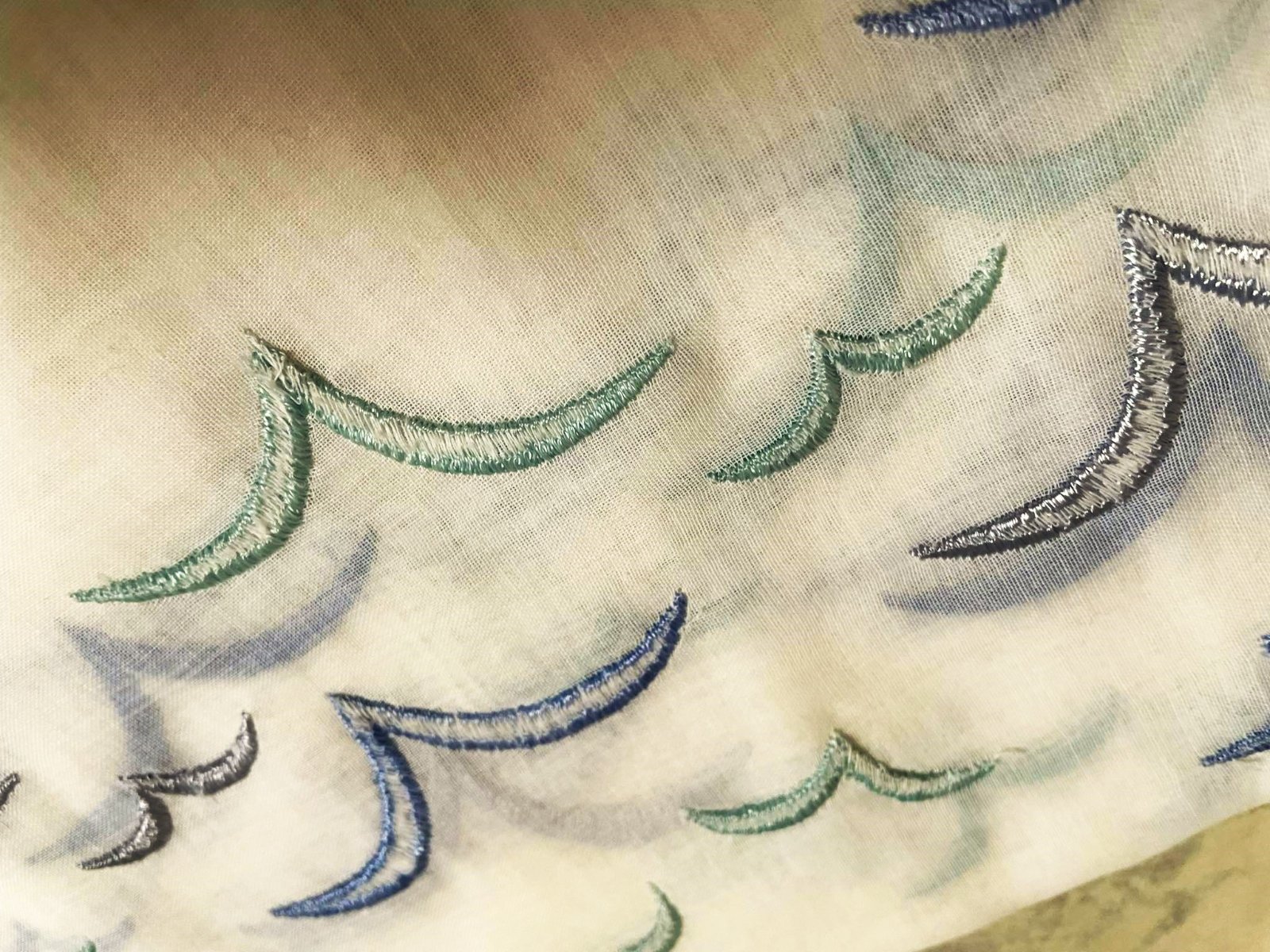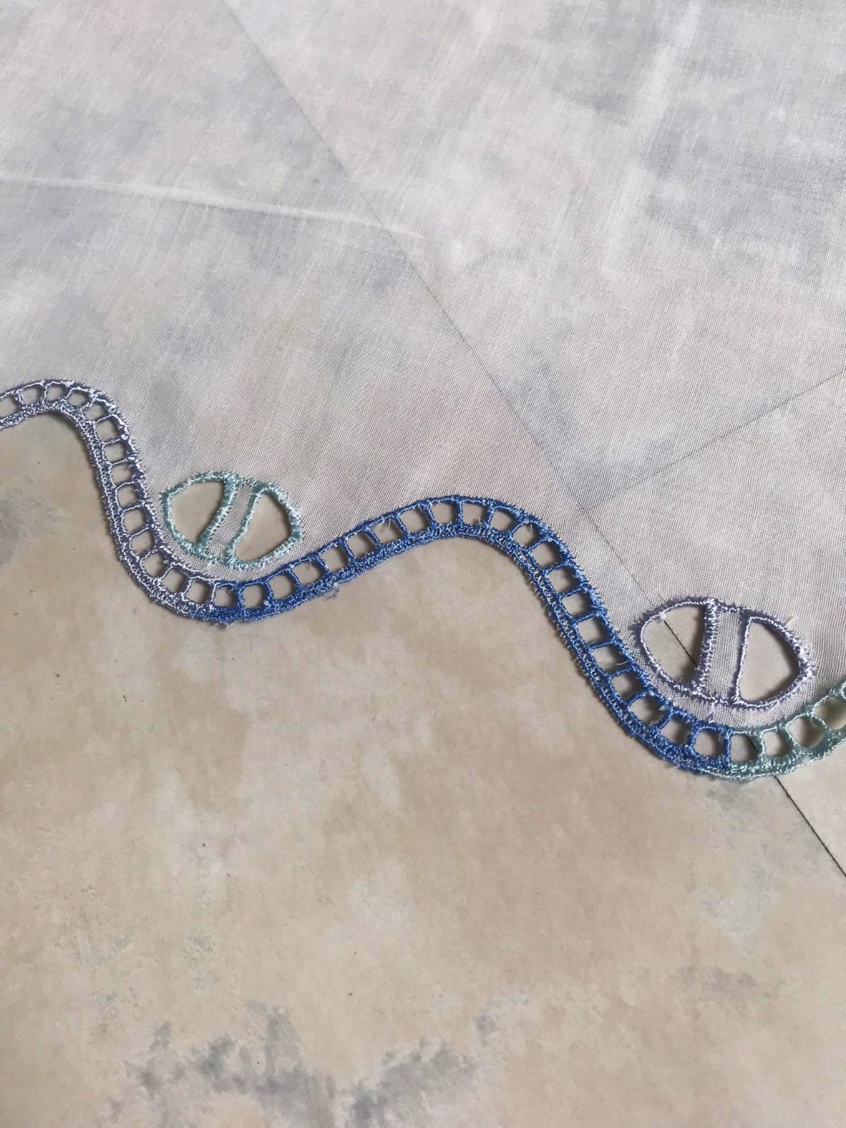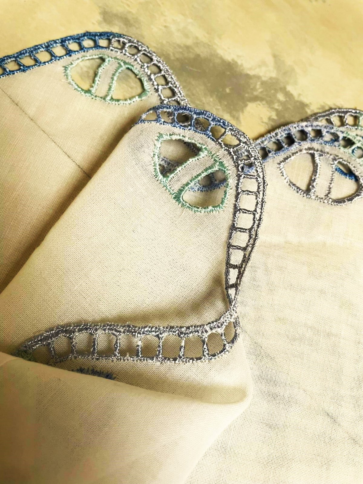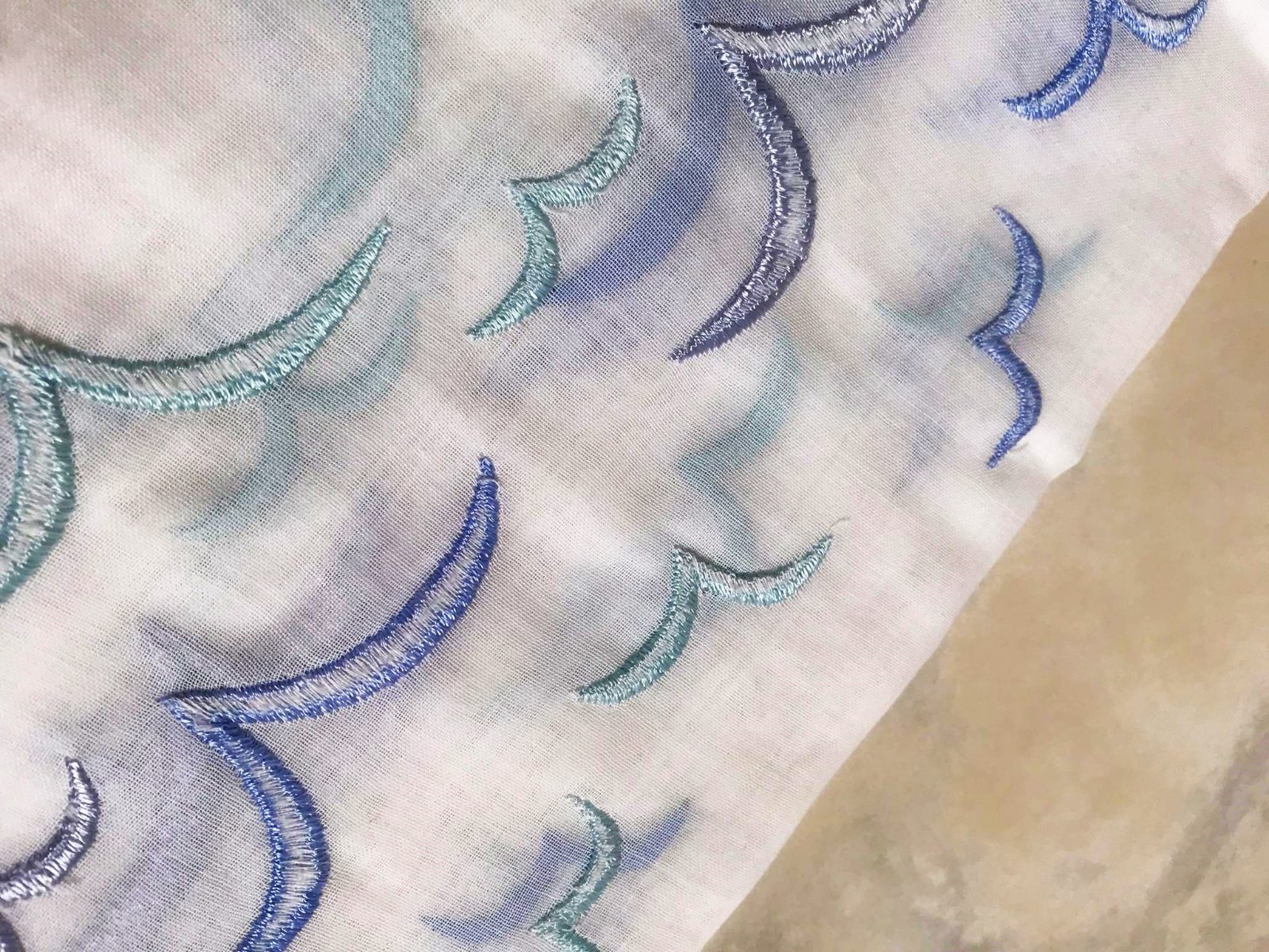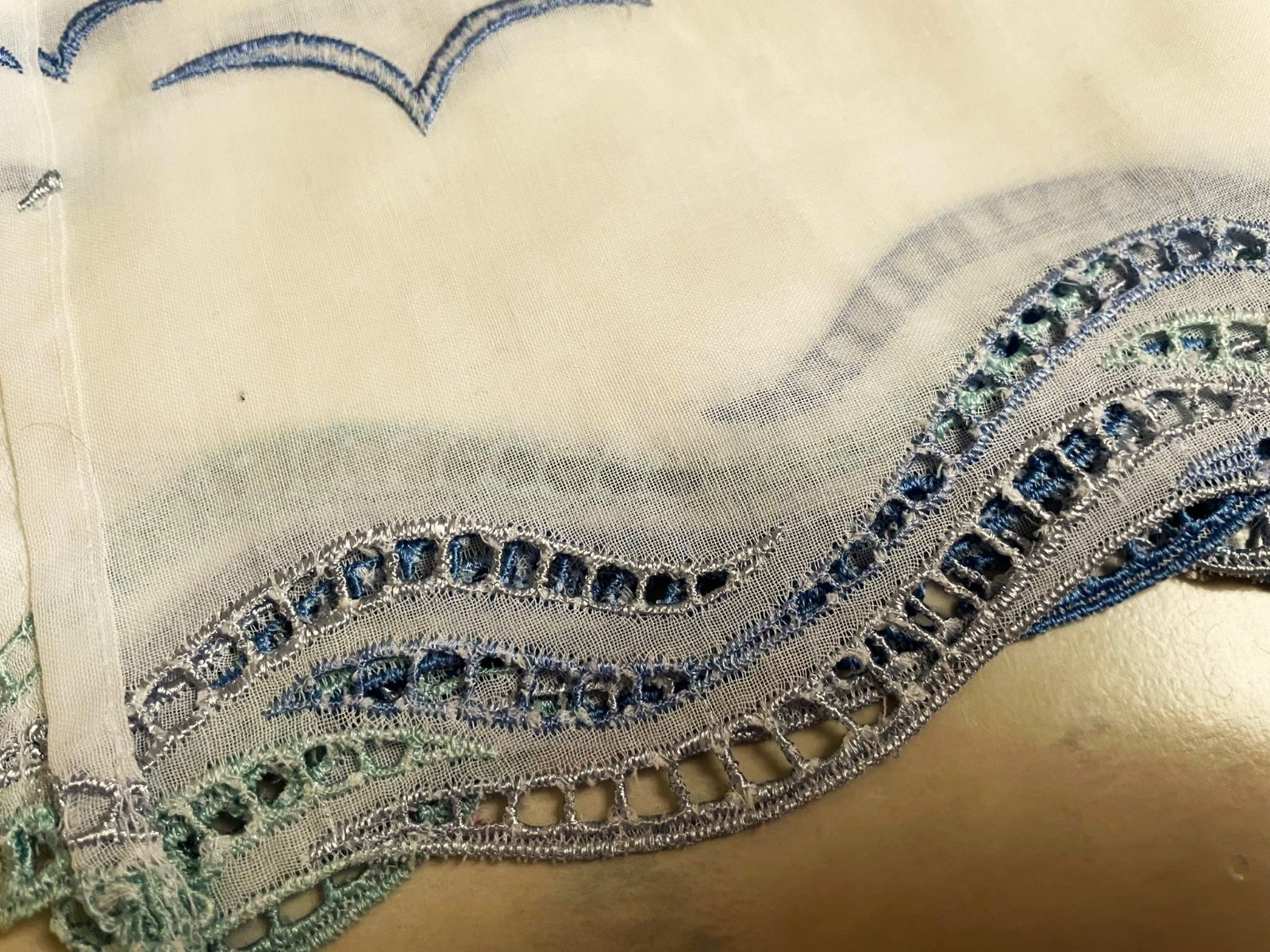 krásna a romantická zvláštna záclonka - vitrážka,dá sa umiestniť v akejkoľvek časti okna,alebo aj na vrch pod garnižu,dá sa krásne nariasiť podľa potreby,jemný batist - vyšívané bledomodré čajky,na spodku krásna dierkovaná výšivka na spôsob richelie ,na vrchu dierky,krásne to vyzerá s prevlečenou saténovou stuhou alebo aj naturálnym špagátom,prípadne s obyčajnou gumičkou,top stav a kvalita