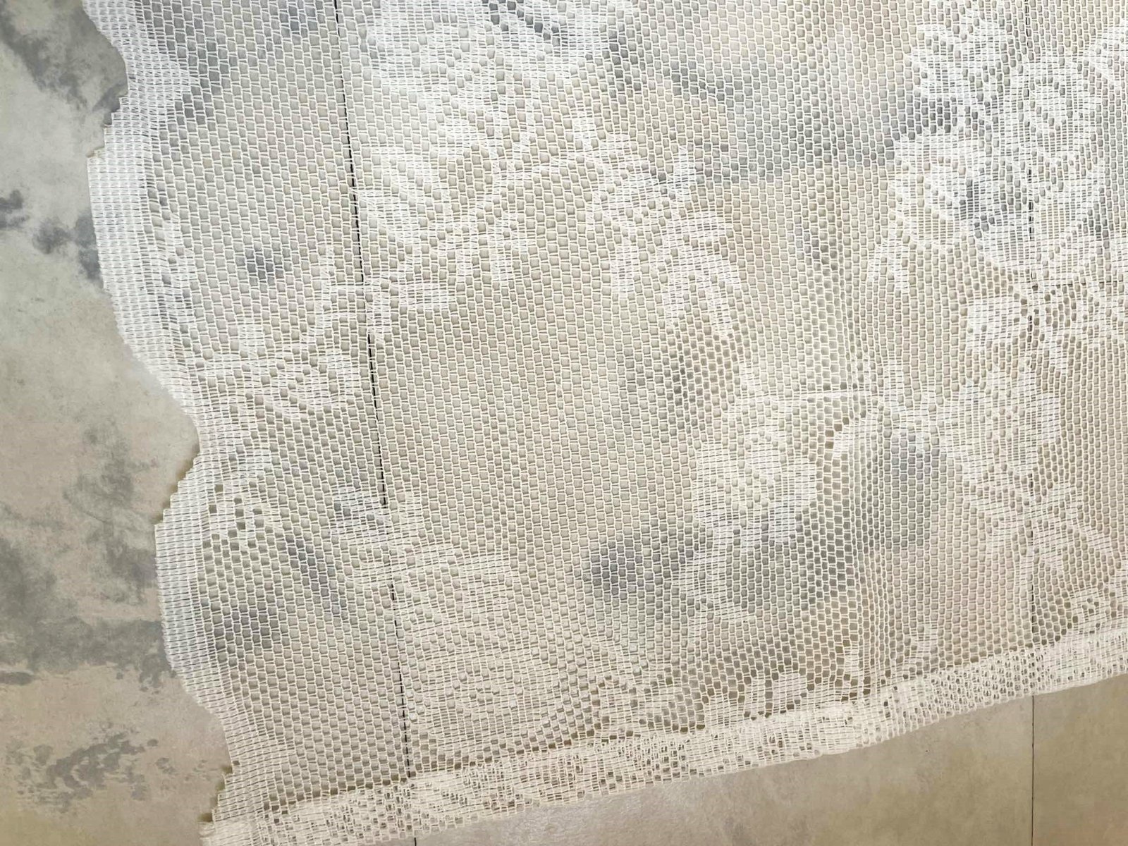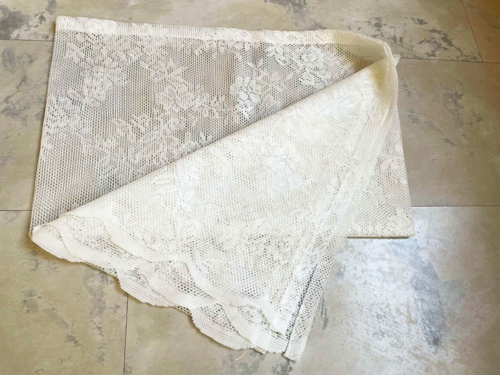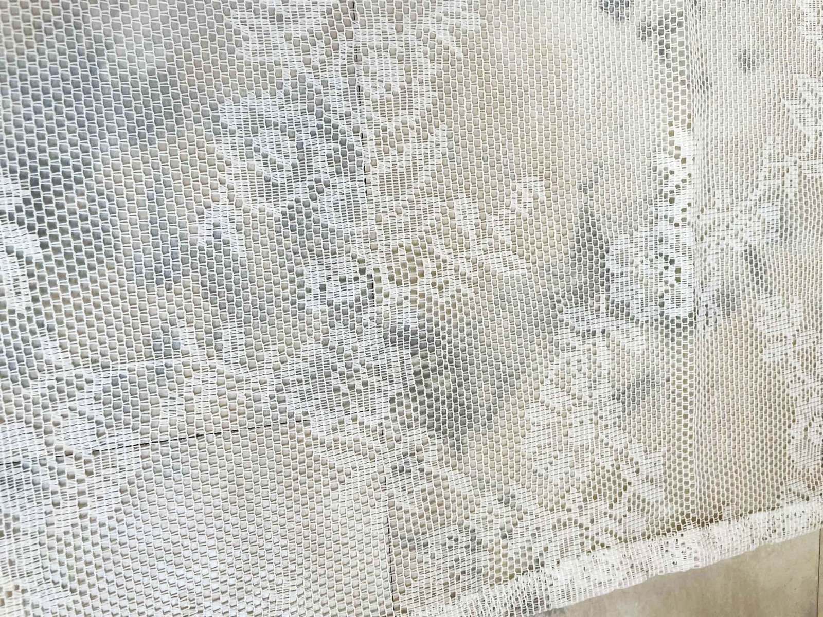 jemný krajkový obrus,syntetika - materiál ako sú záclony,používaný ale bez závad alebo poškodení,nekrčí sa, dobre sa perie,super aj ako druhý obrus na podklad - krásne vynikne krajka, 150 x 50 cm
