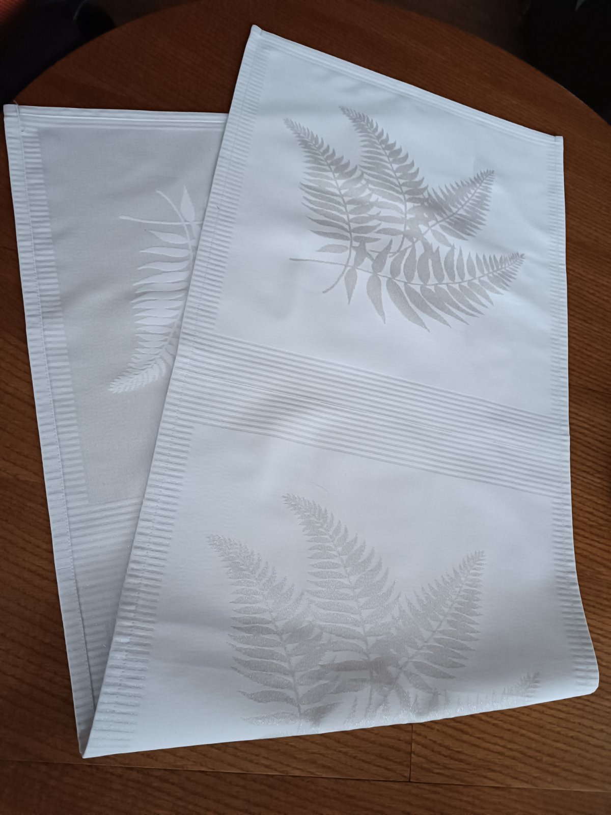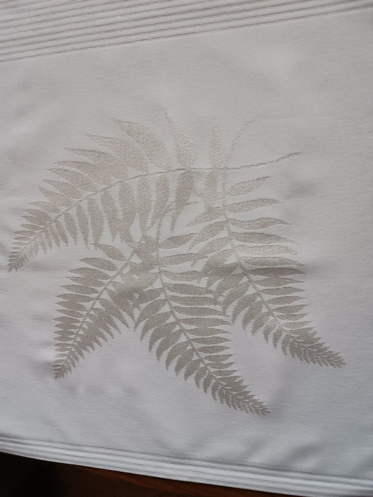 Pevný obrusový materiál, votkaná strieborná nitka, krásny nadčasový vzor listu, môže sa hodiť na spoločensku udalosť, rozmer 136x43 cm