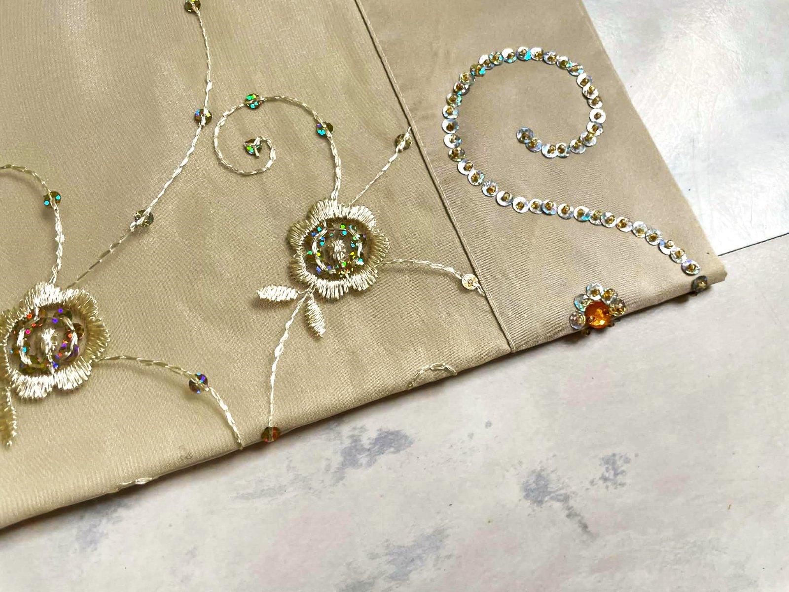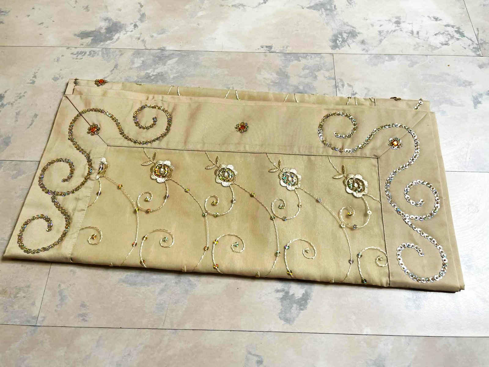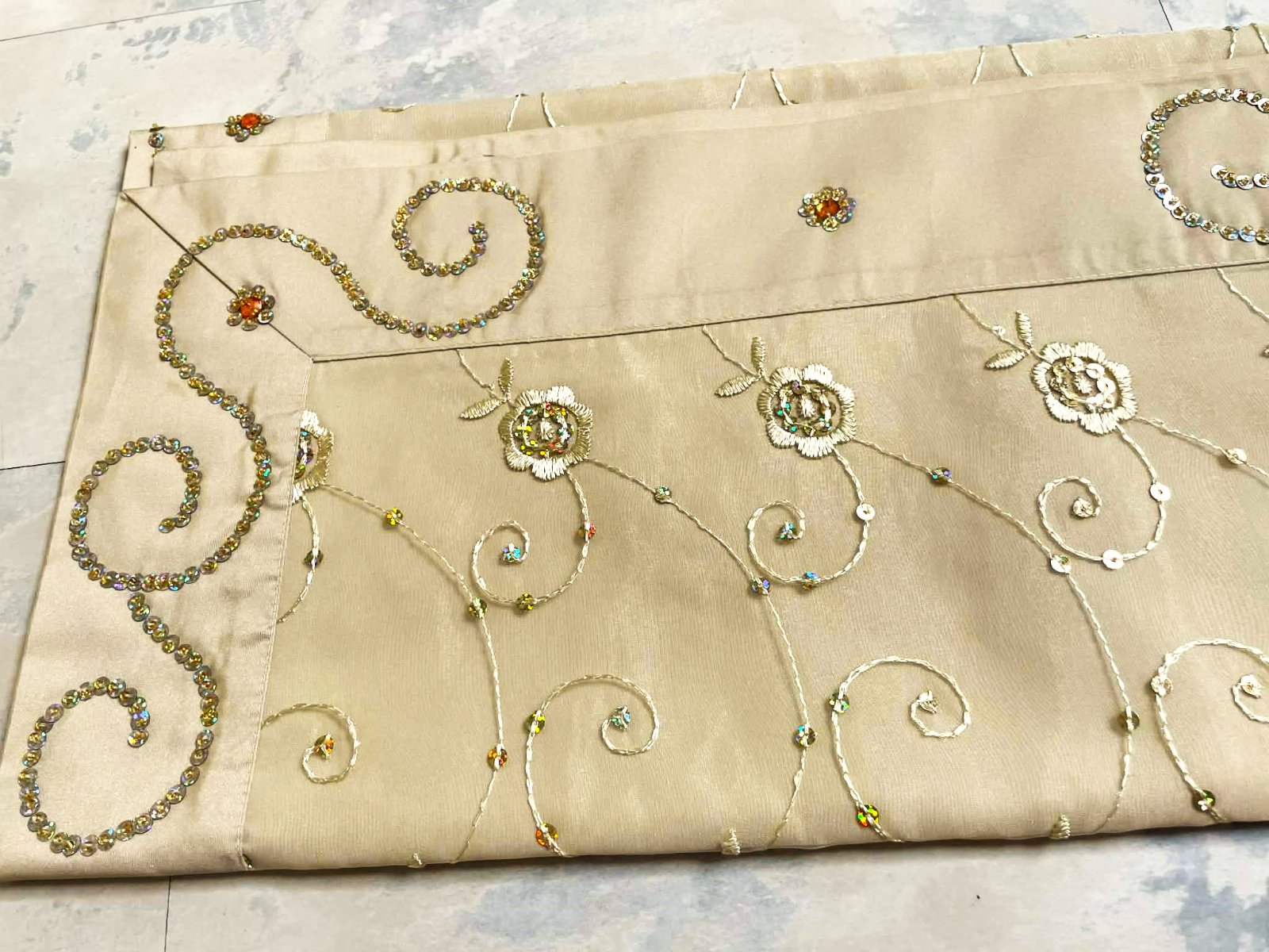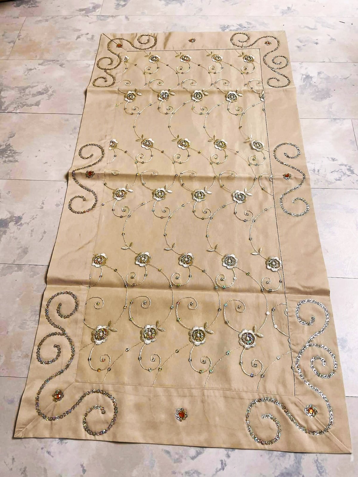 nádherný duplovaný obrus, vhodný na samostatné použitie ale aj ako štóla na spodný obrus, farba champagne - béžová, s jemným atlasovým leskom, trblietavý,jemný,netuctový,materiál hrubší - ako keby hrubšia mašľa, stred - okrem lemov je jemný šifón,krásne vypracovaný,ťažko sa to fotí,preto prikladám veľa fotiek...top stav a kvalita,100 x 50 cm