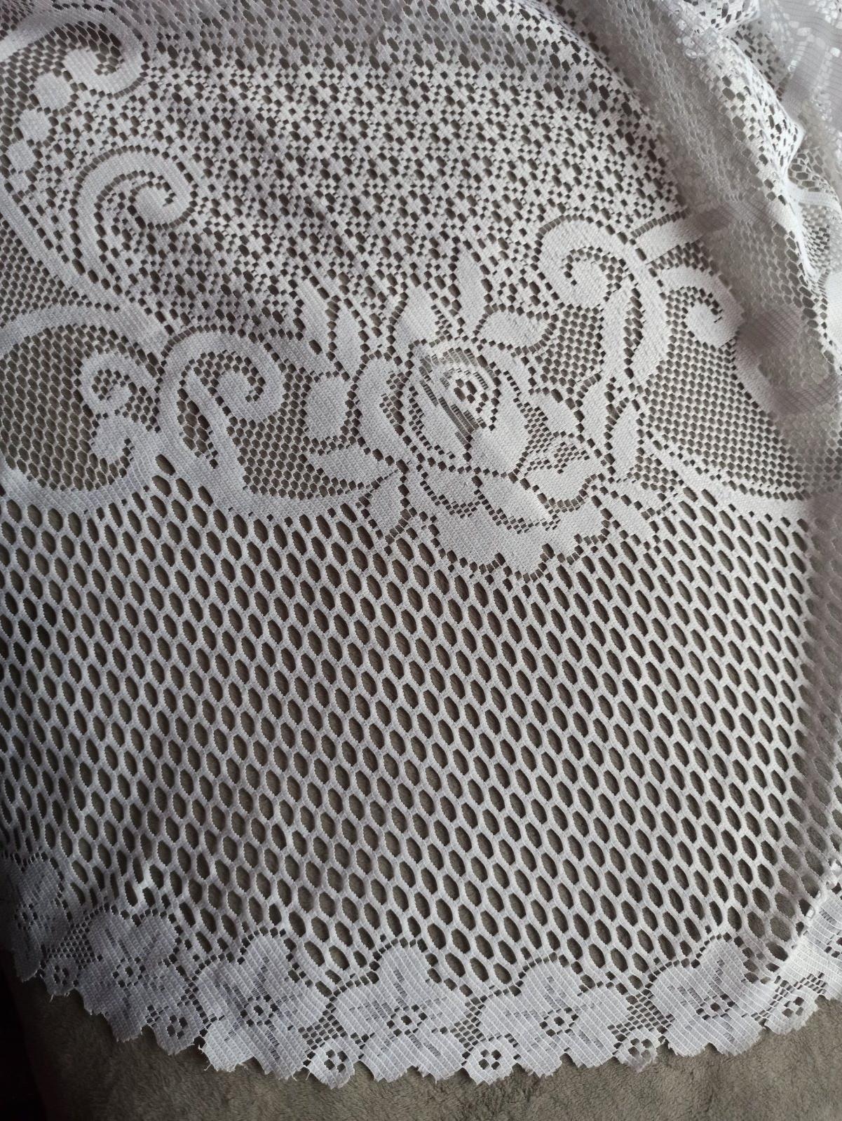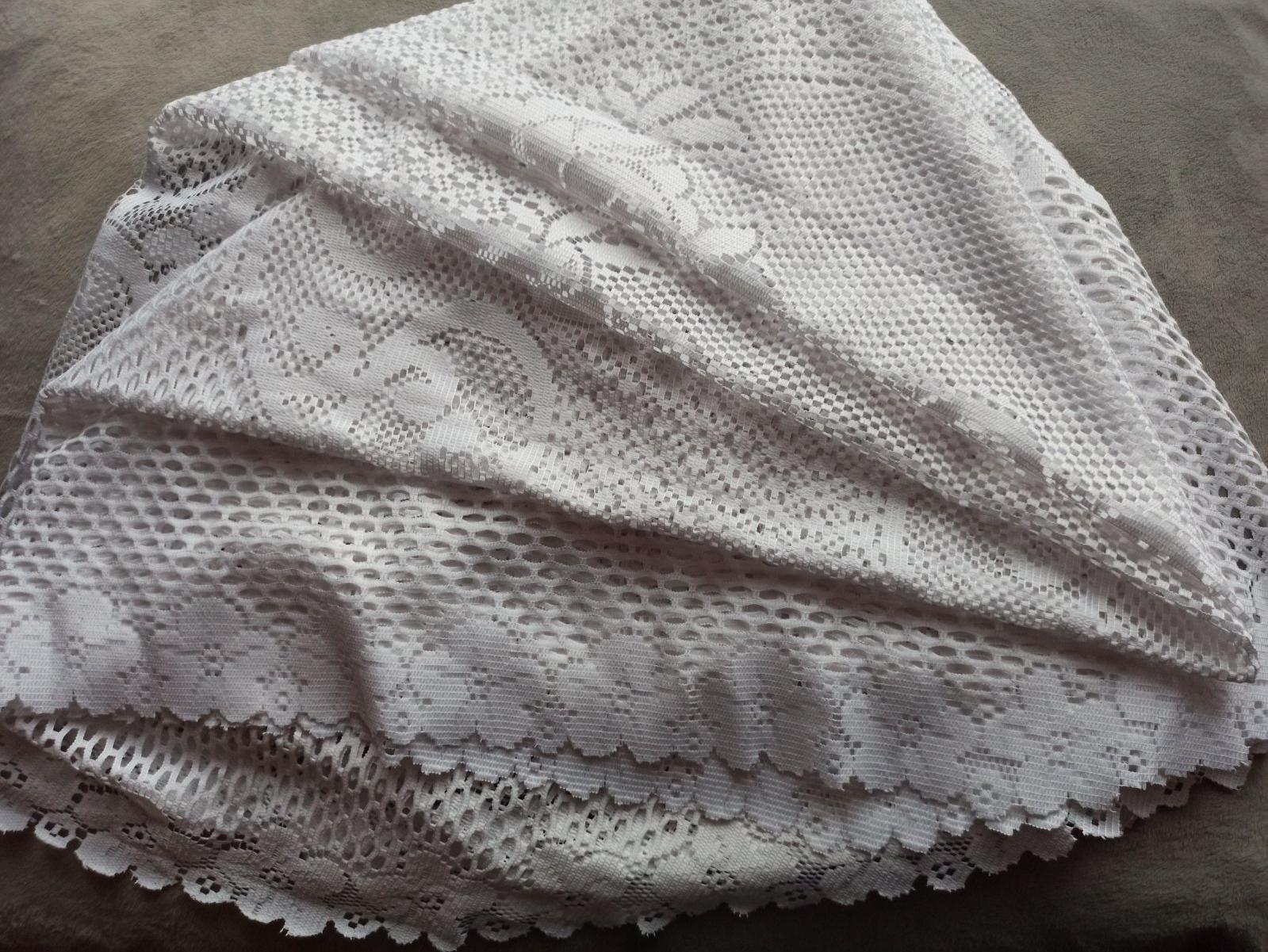 Biely krajkový obrus zo syntetickej čipky, ale príjemný na dotyk. Ľahko sa udržiava. Motív kvetov.