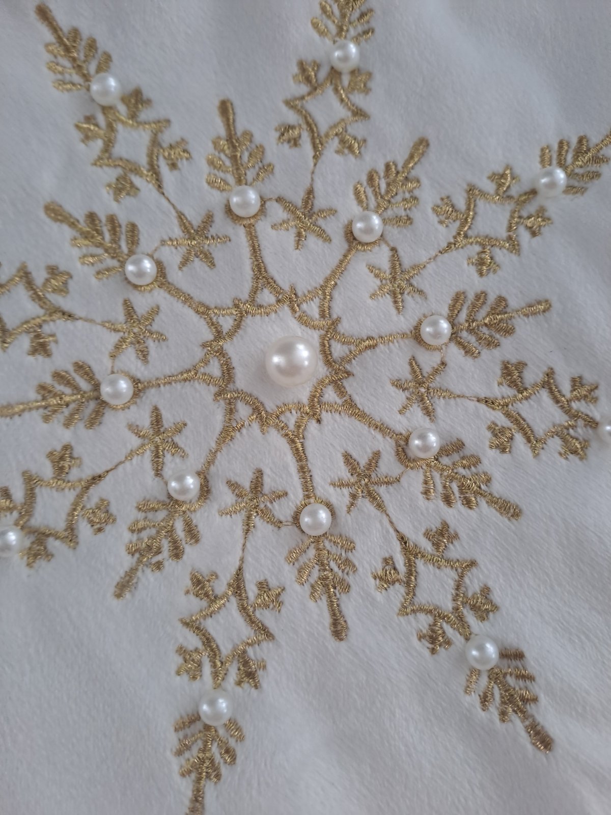 Elegantná krajka ozdobná bordúrová je vyšívaná saténovo lesklou niťou na monofile. Bordúra má jeden okraj ozdobný oblúčikový a druhý bordúrový. Bordúrovú krajku môžete našiť na okraje šiat, kabátik...
